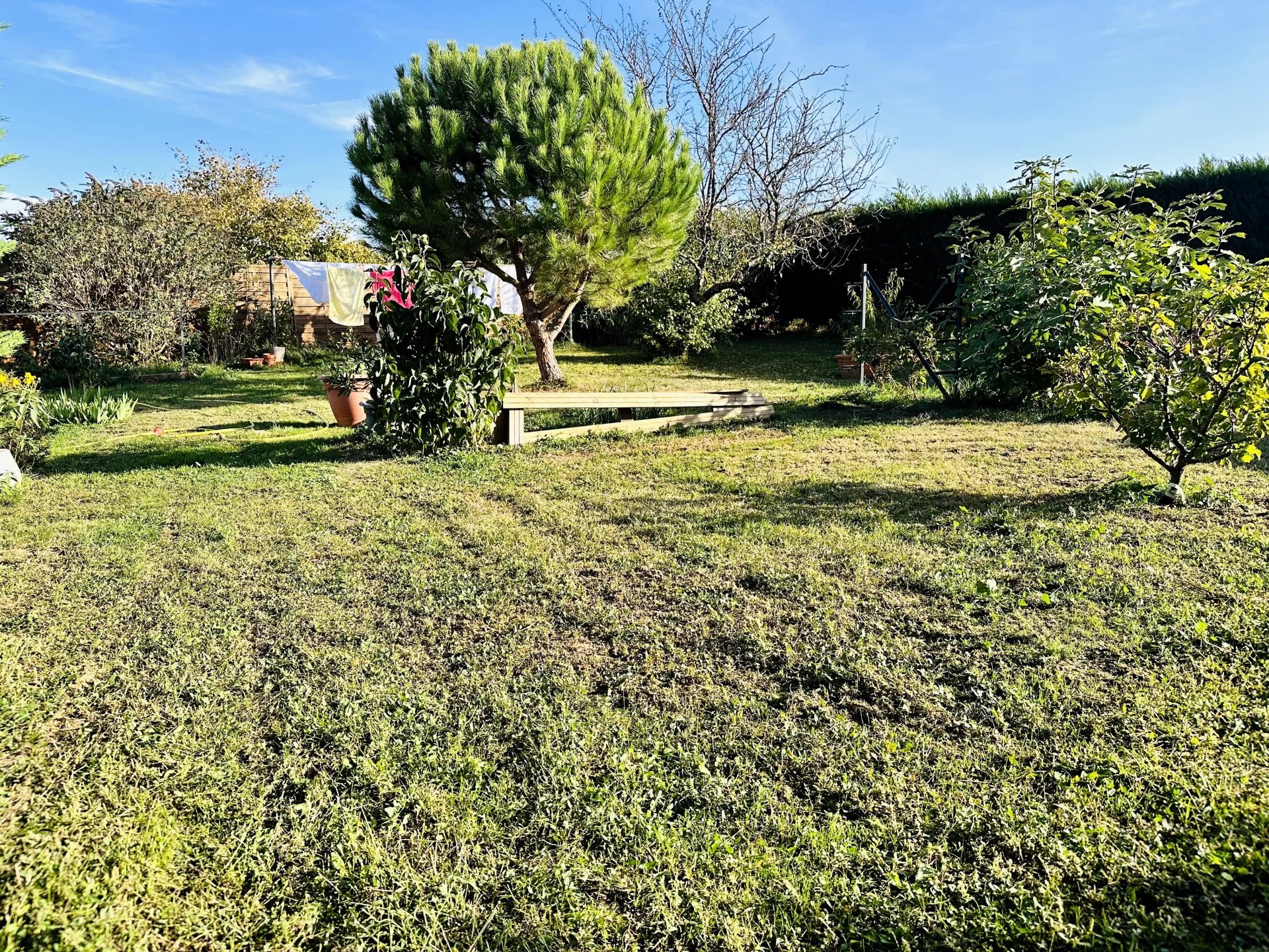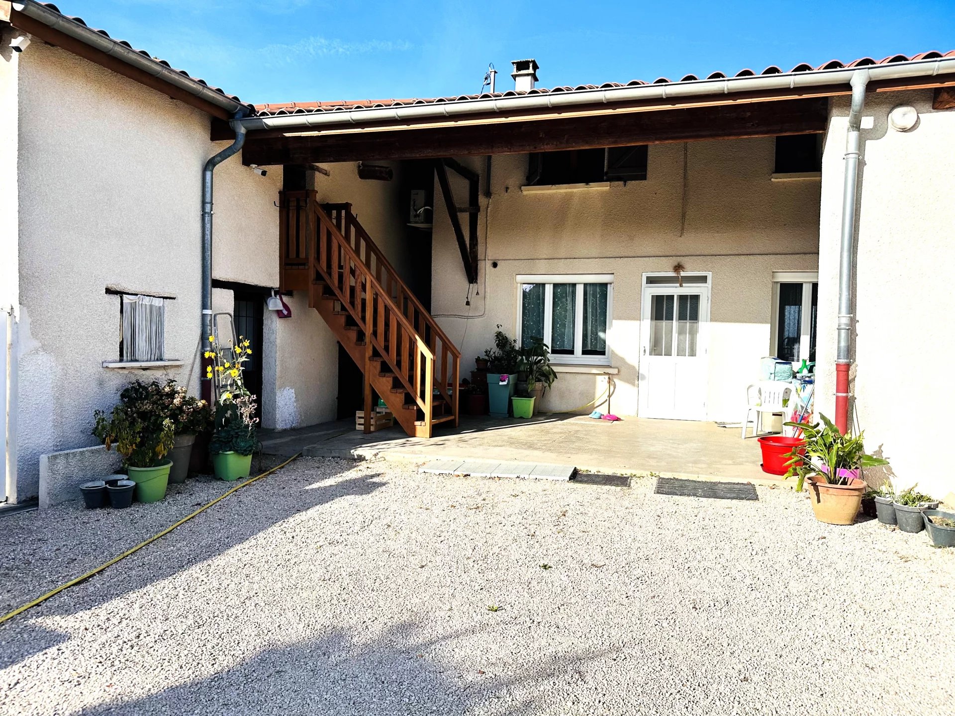 Cette maison ancienne et rénovée de 98m² + une cave et des petites dépendances est mitoyenne d'un côté.