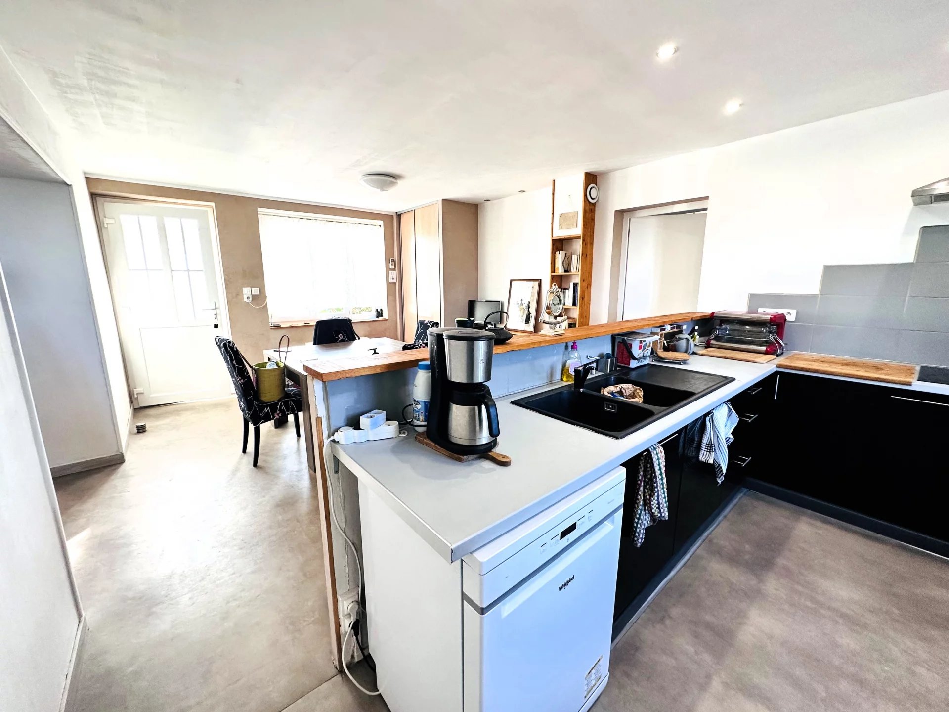 Elle se compose au RDC d'un grand espace de vie en une double pièce (cuisine/séjour et salon) et une salle d'eau avec WC.