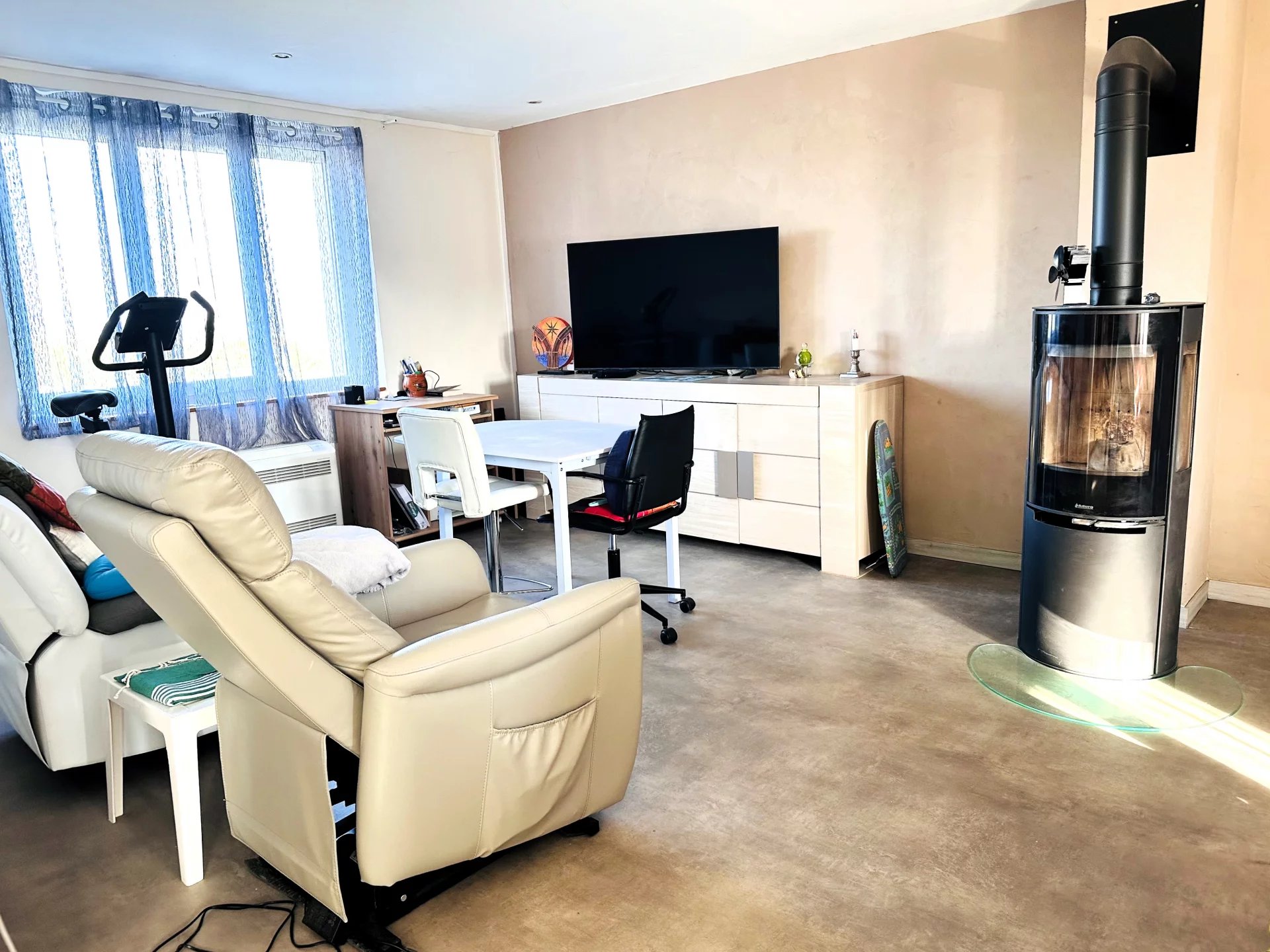 Chauffage par PAC réversible AIR/AIR, un poêle à bois, un chauffe-eau thermodynamique, des menuiseries PVC, et des panneaux solaires permettant une belle économie sur le coût de l'énergie.