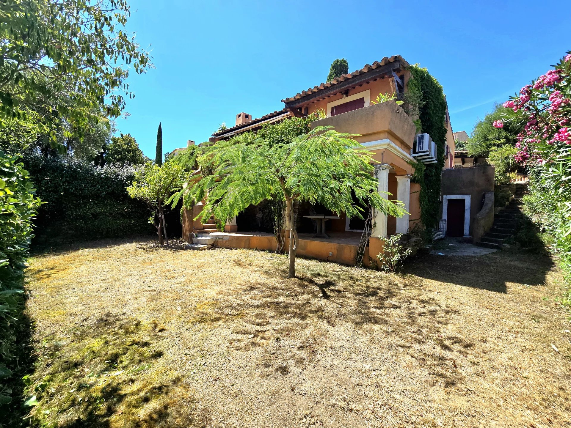Située à 5 minutes à pied du centre du Lavandou et des plages, cette maison au charme provençal, de construction traditionnelle offre une belle vue sur la mer. L'accès de plain-pied comprend un séjour avec cuisine ouverte sur une belle terrasse face à la mer, une suite parentale donnant également sur la terrasse au sud avec sa salle de bain attenante et un accès au bureau, une deuxième chambre sur le même niveau et une mezzanine. Au niveau inférieur, vous trouverez 3 chambres dont 2 ouvertes sur le jardin, une salle de bain, ainsi qu'une grande buanderie, cave et atelier. Plusieurs places de stationnement disponibles et un carport.