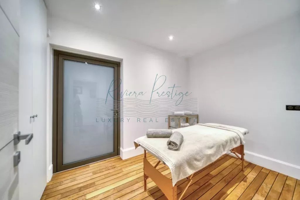 salle de massage supplémentaire, une salle de yoga, une salle de fitness, hammam, sauna, douche-wc, piscine intérieure et extérieure, un appartement de gardien + un grand appartement de gardien en duplex, un garage 4 voitures, 2 ateliers d’environ 150m2 supplémentaire sur terrain de 9700 m2 avec palmeraie exceptionnelle, vue mer à 180°, vergers avec oliviers et agrumes/ poulailler et