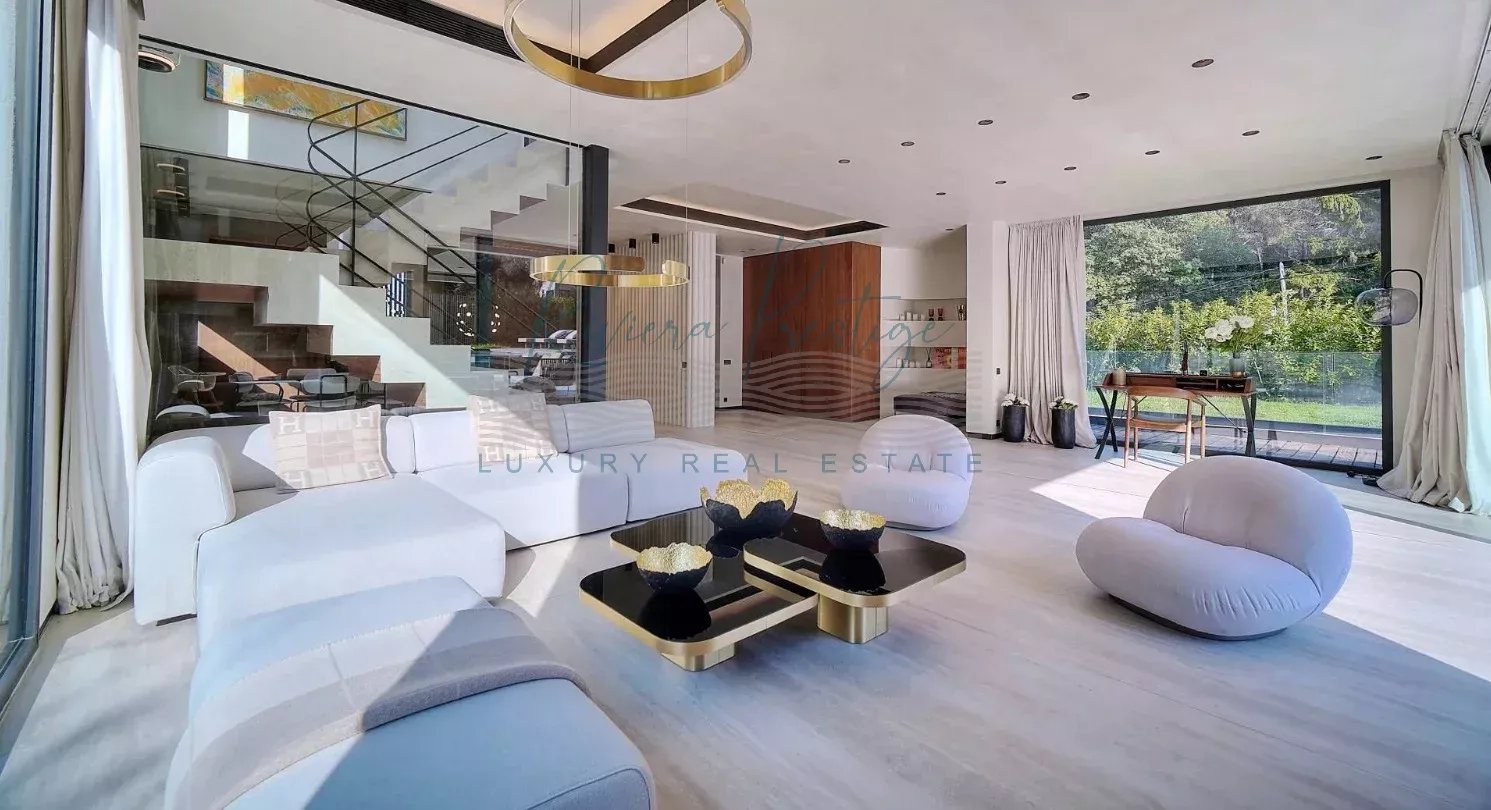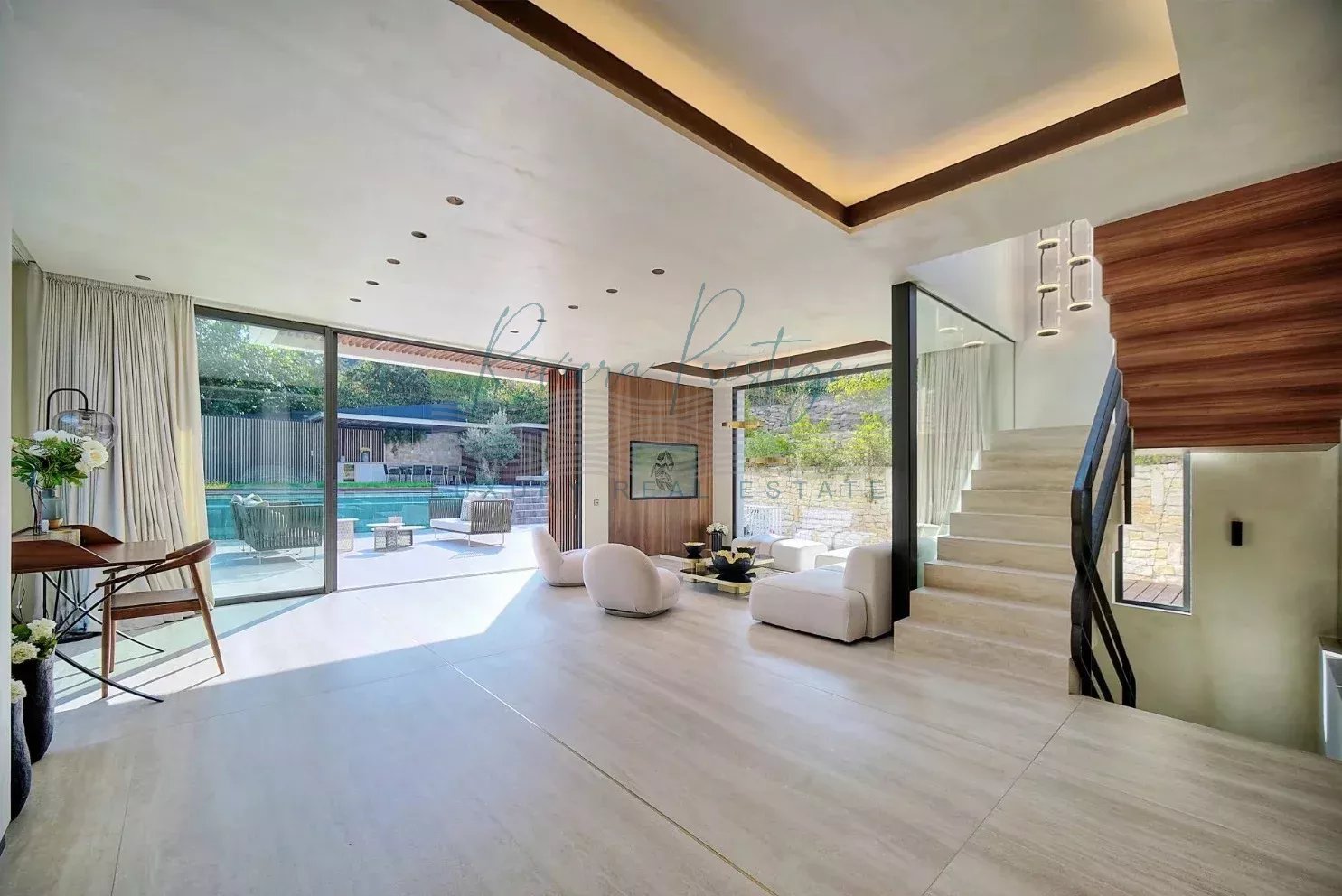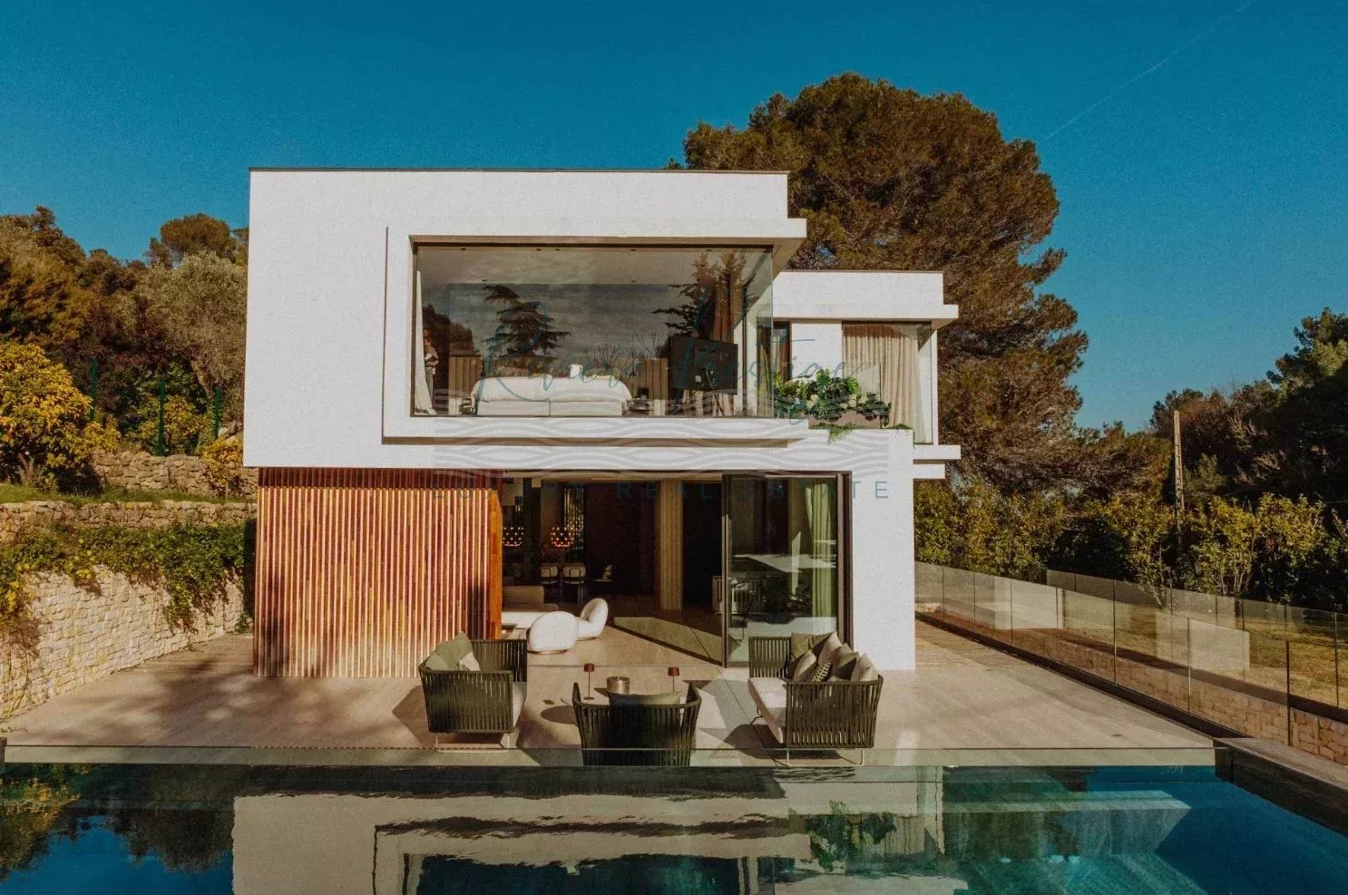 Cette villa contemporaine imaginée par un architecte de renom est située sur les hauteurs de Cannes, Construite en 2021 dans un écrin de verdure, elle bénéficie de prestations e haut standing et de la dernière technologie.