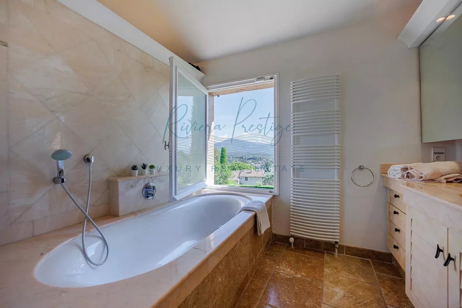 Vous serez séduit dès votre arrivée par son superbe jardin paysager de 524 m² en restanques, agrémenté de terrasses ensoleillées et d’un jacuzzi. La villa offre une vue à couper le souffle sur les montagnes et la Baie de Cannes, un véritable tableau vivant à admirer au quotidien.