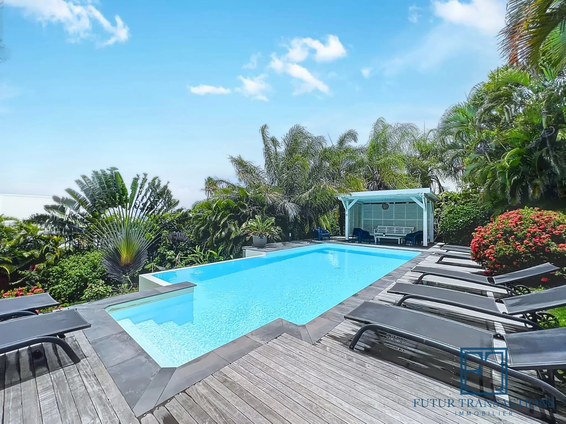 - Piscine à débordement (9,70 m x 4,40 m) avec solarium deck et deux espaces carbet (repas & détente)