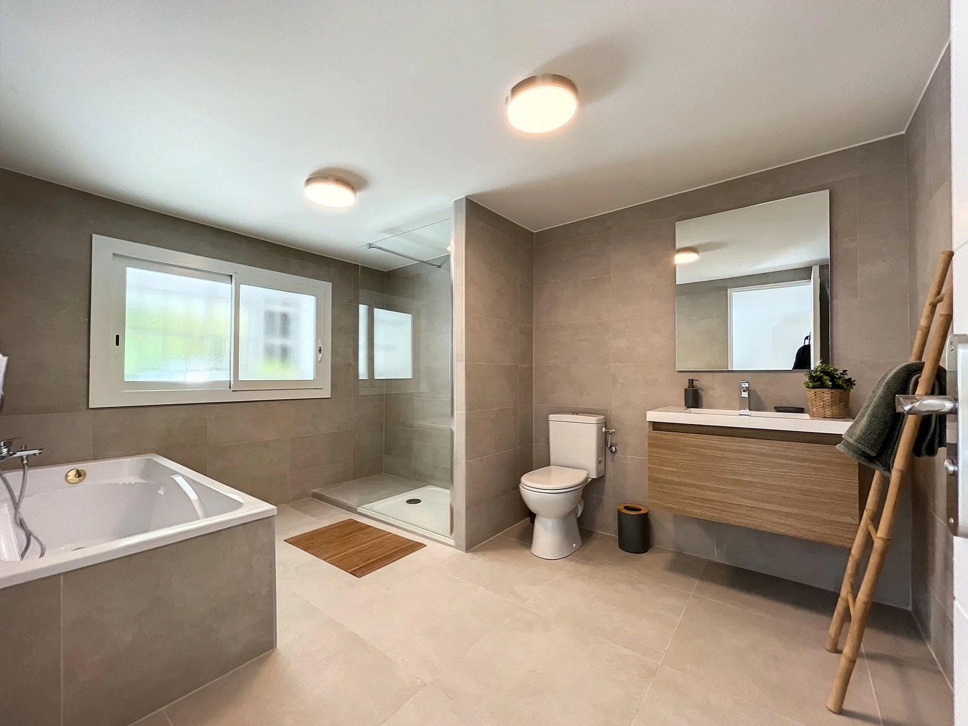 La villa est décorée dans un style Juanaise traditionnel, les terrasses avec des carreaux en terre cuite, un éclairage extérieur est prévu pour les soirées d'été.
