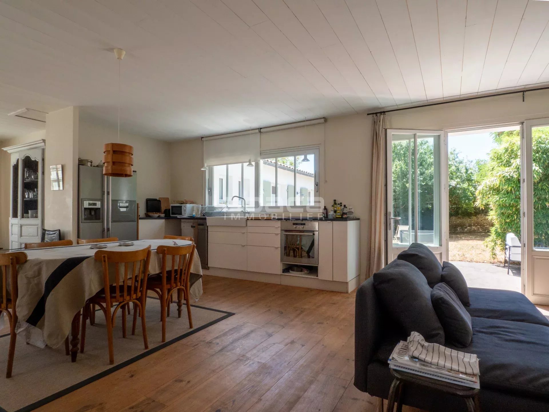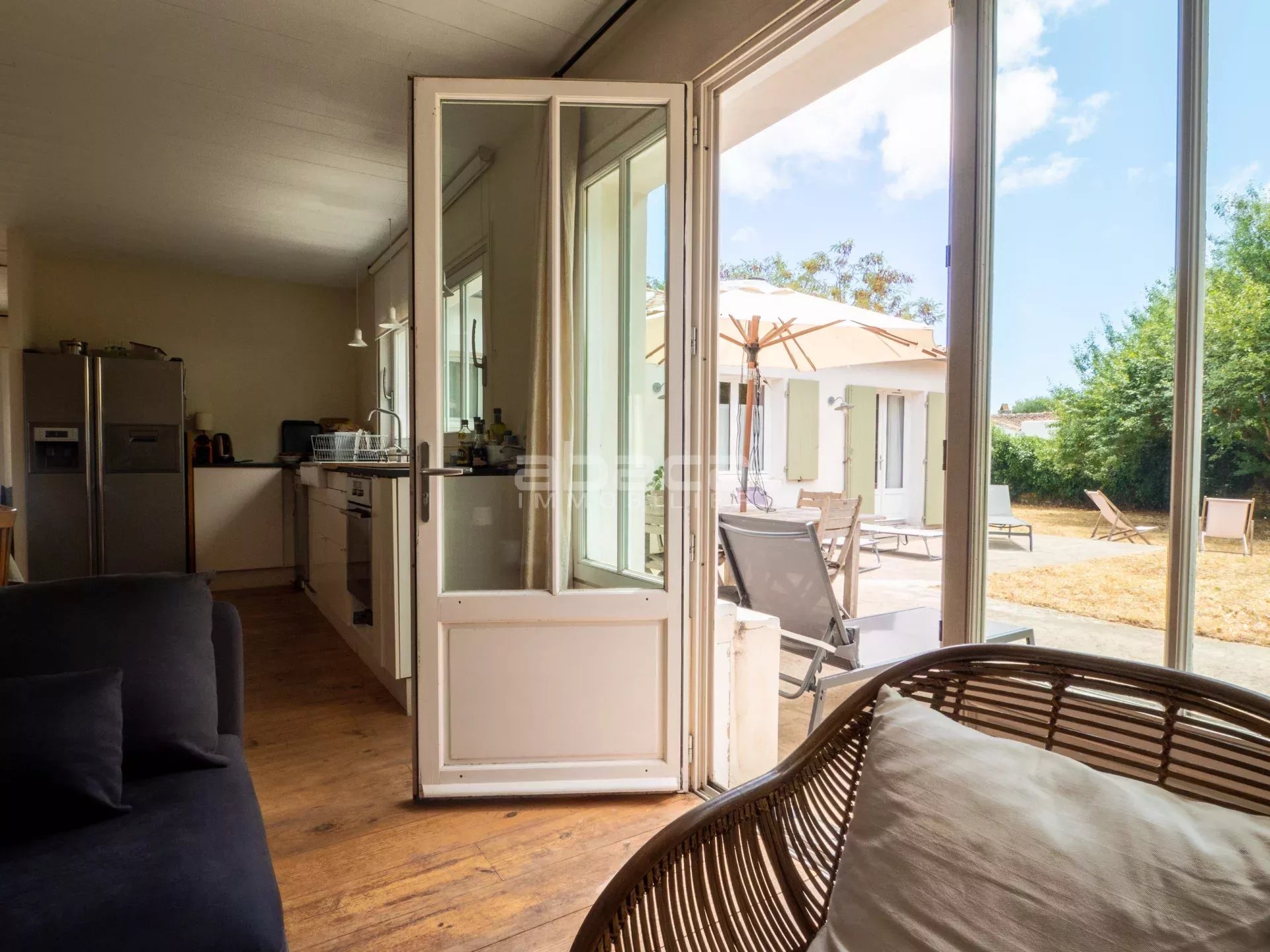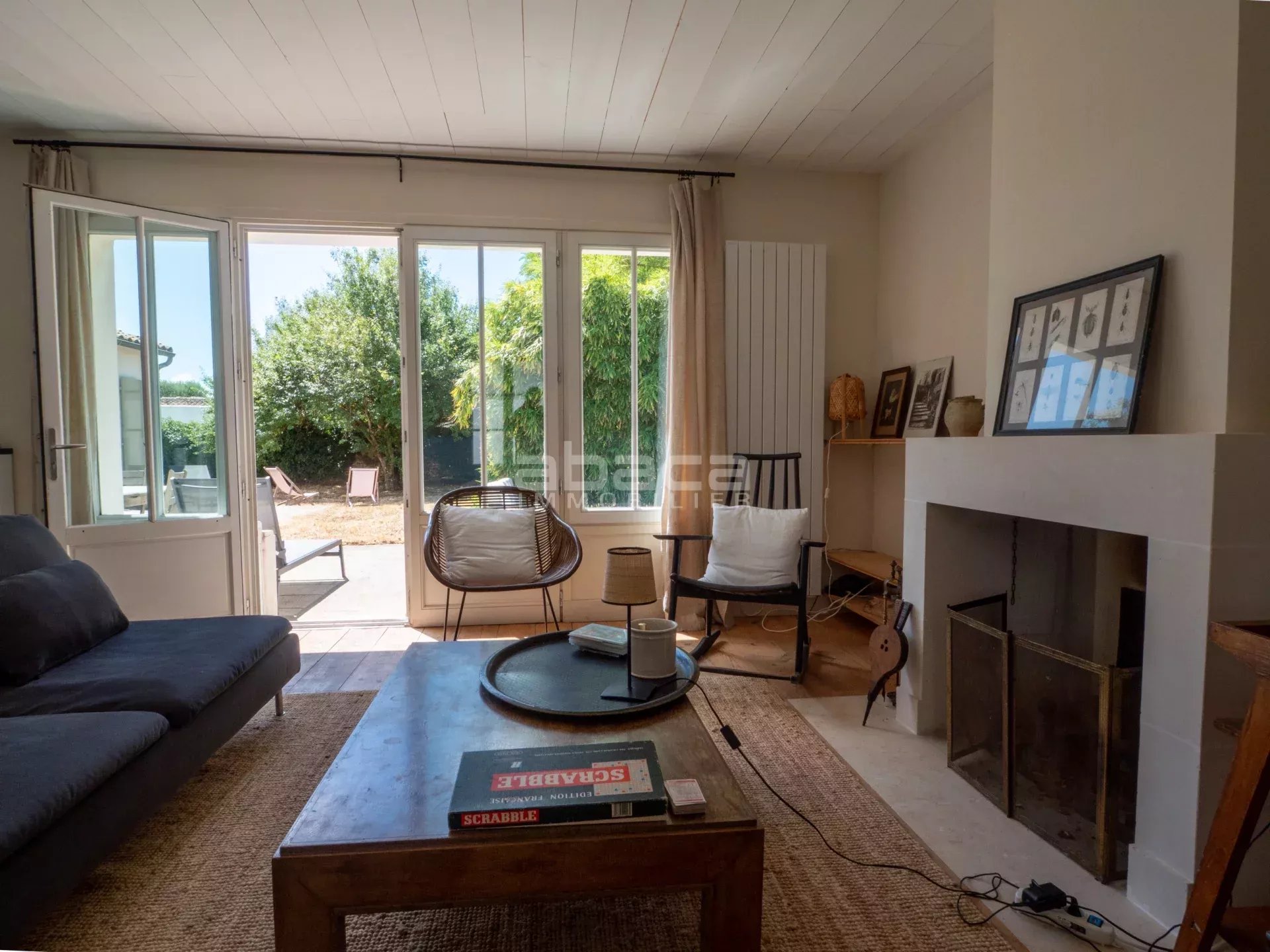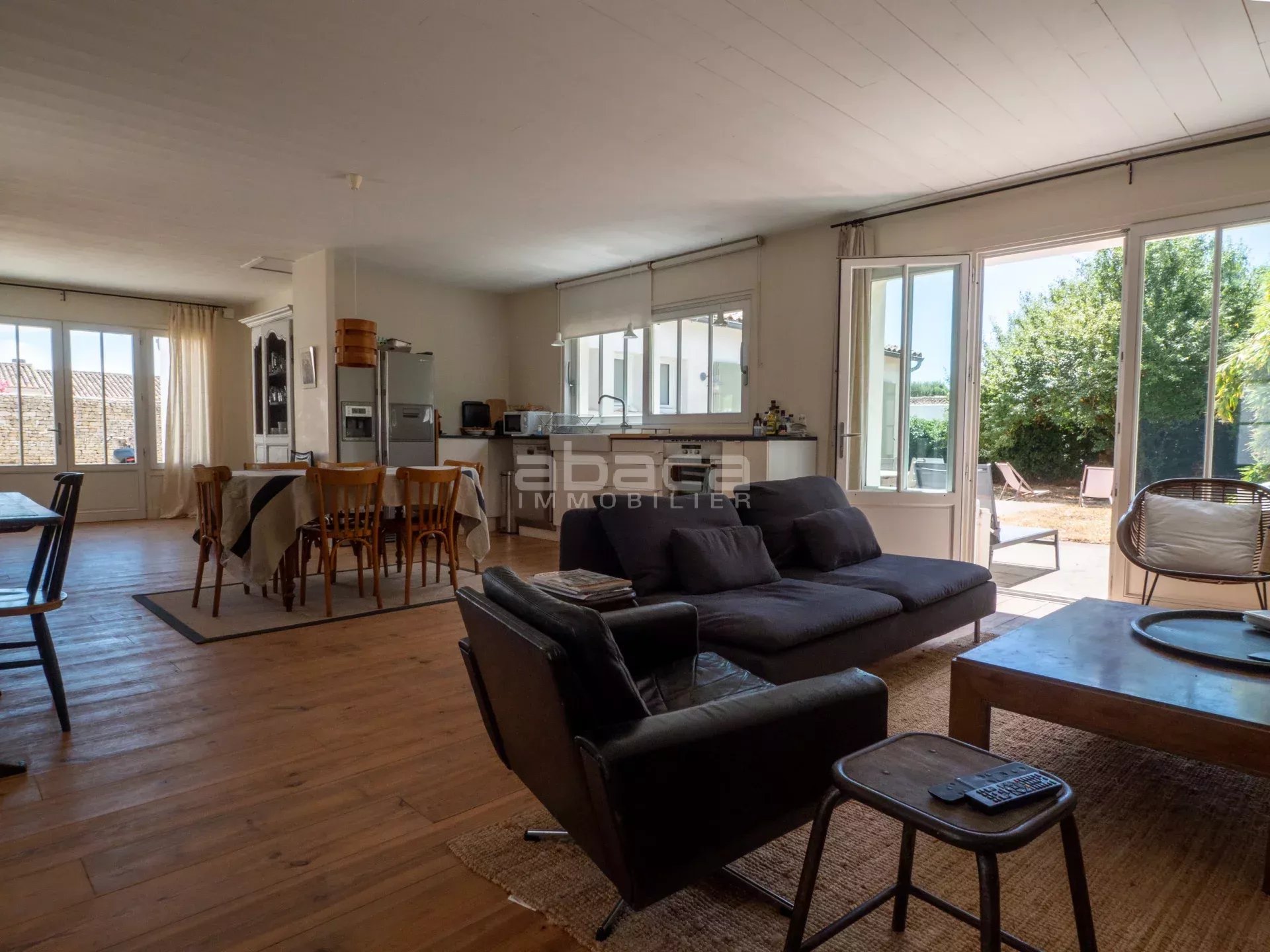 Dans un environnement privilégié à quelques pas du centre. Jolie maison de plain pied lumineuse comprenant : entrée, séjour avec cuisine équipée et aménagée ouverte, dégagement vers un couloir desservant 2 chambres avec salle d'eau et toilettes, grande chambre principale avec salle de bains et toilettes. Le tout ouvre sur une terrasse et jardin avec garage traversant. C'est un bien rare à découvrir avec l'Agence Abaca des Portes en Ré.