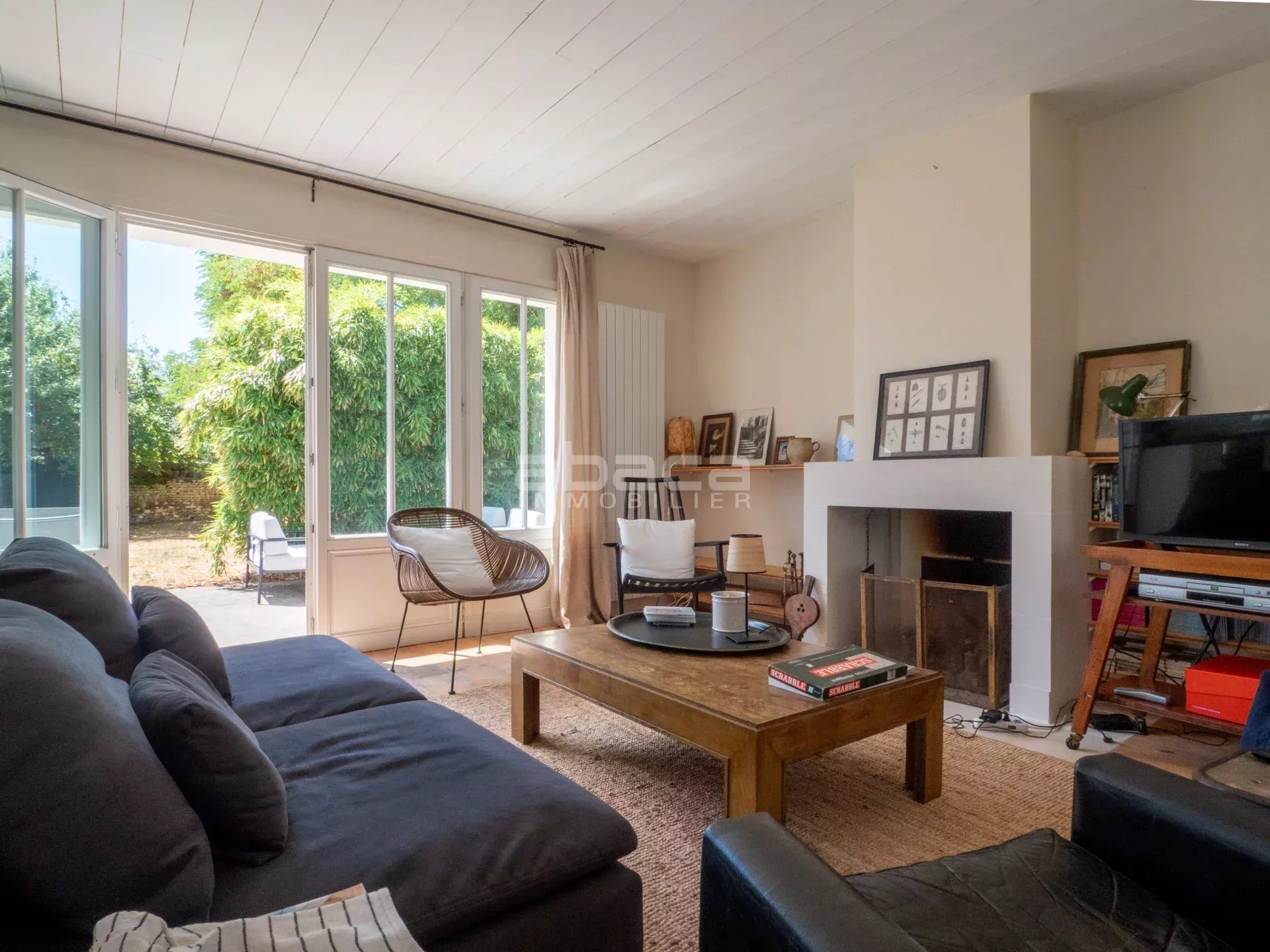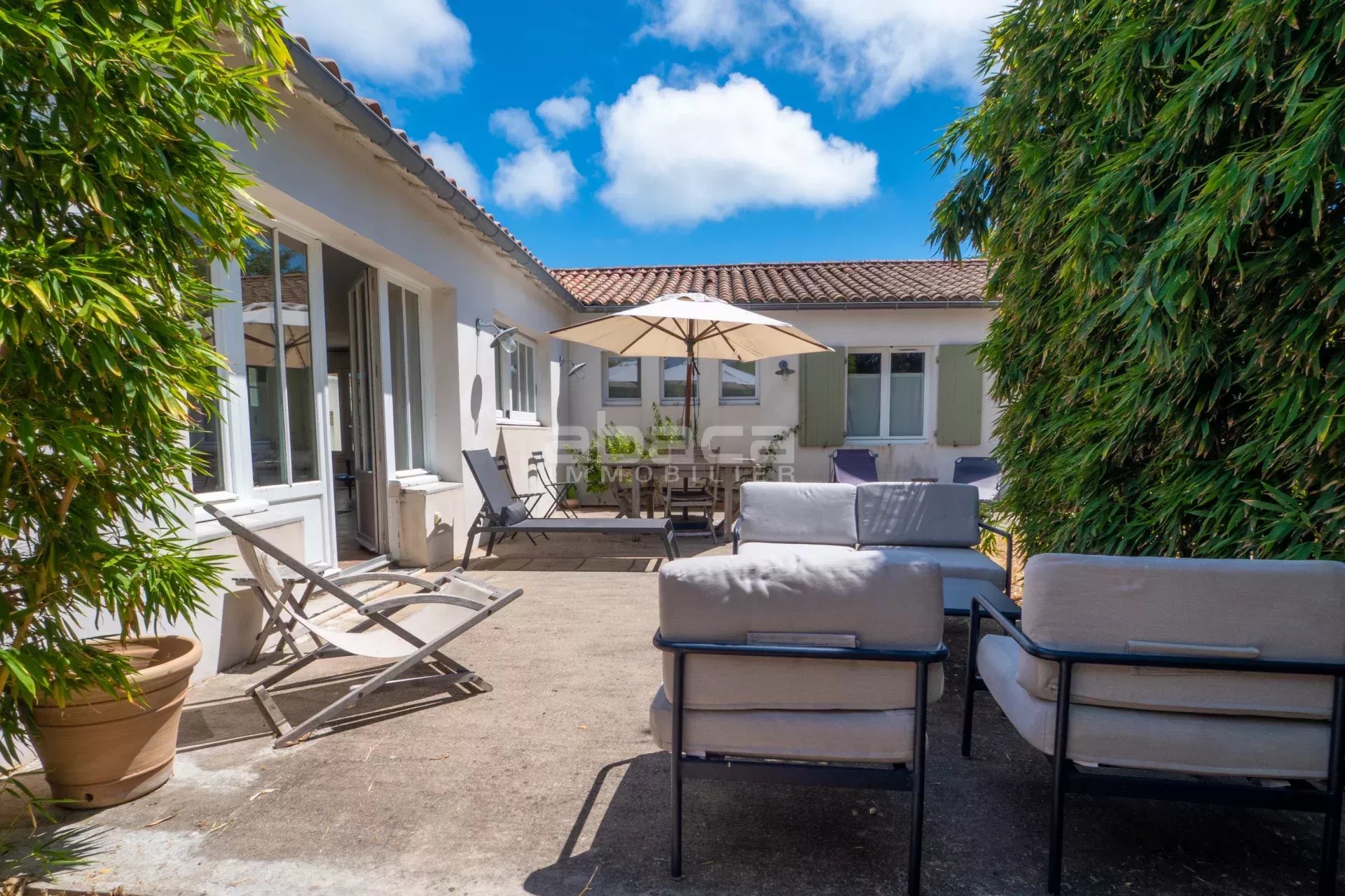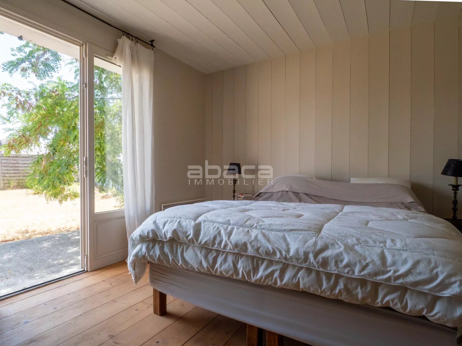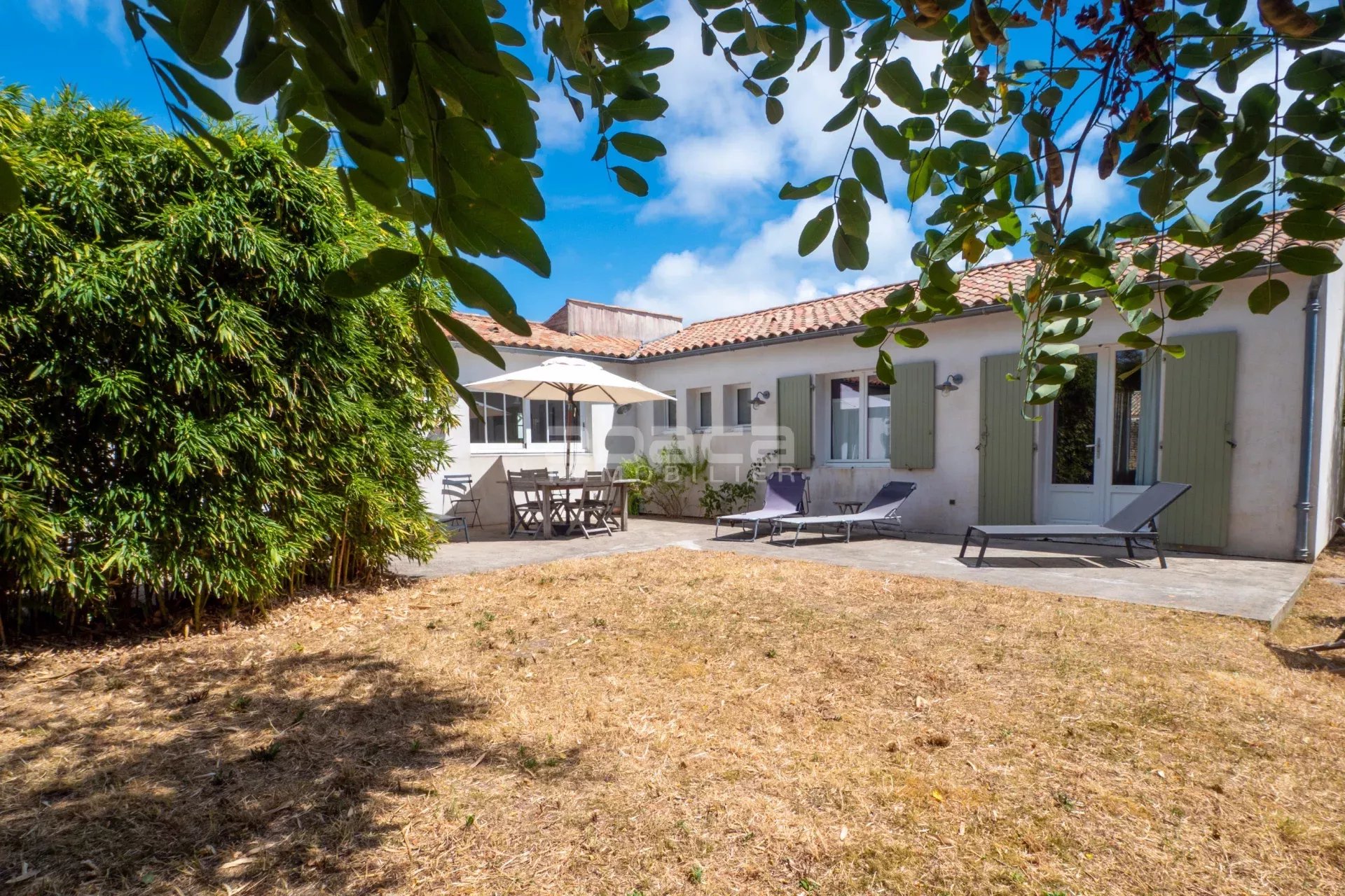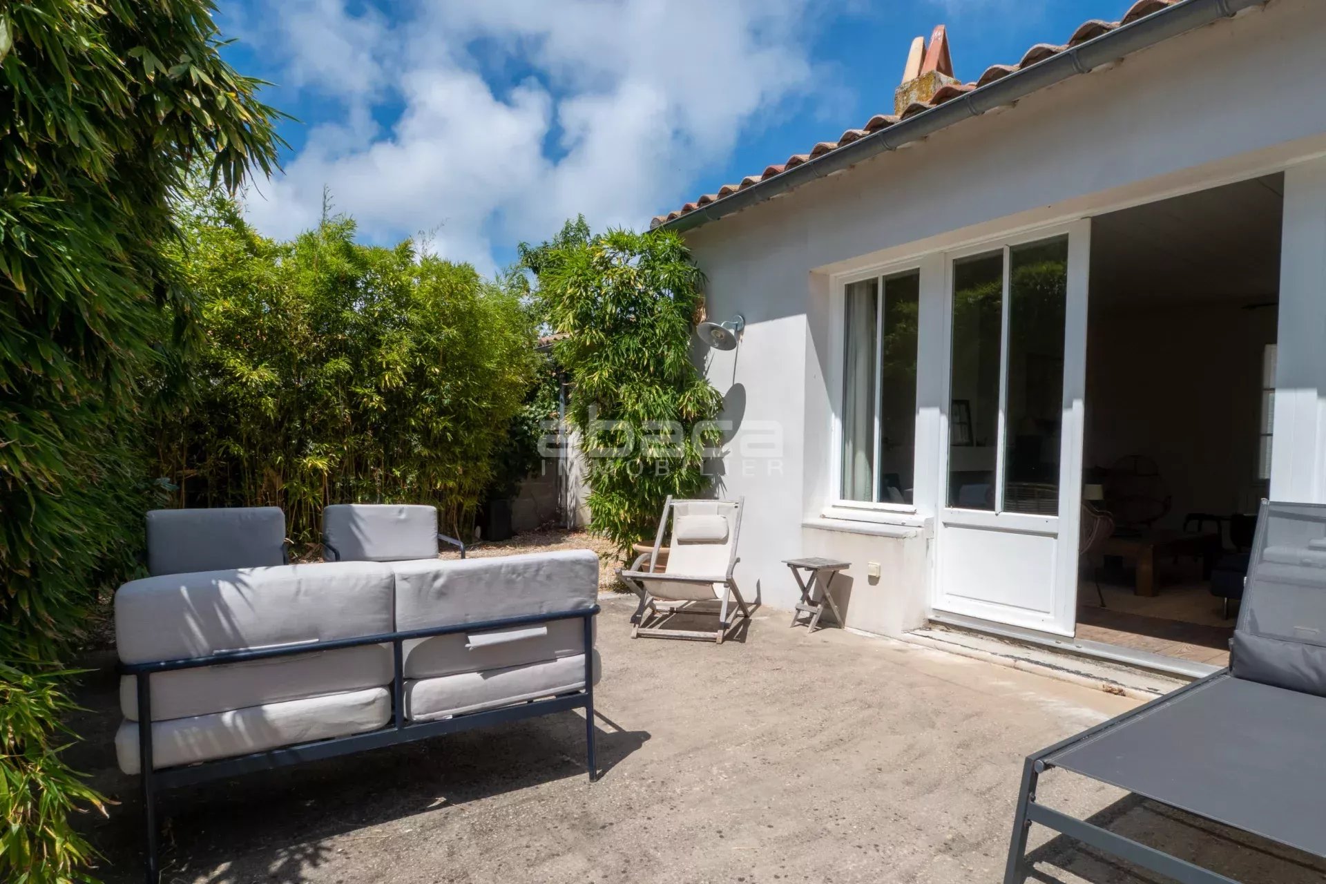 Dans un environnement privilégié à quelques pas du centre. Jolie maison de plain pied lumineuse comprenant : entrée, séjour avec cuisine équipée et aménagée ouverte, dégagement vers un couloir desservant 2 chambres avec salle d'eau et toilettes, grande chambre principale avec salle de bains et toilettes. Le tout ouvre sur une terrasse et jardin avec garage traversant. C'est un bien rare à découvrir avec l'Agence Abaca des Portes en Ré.