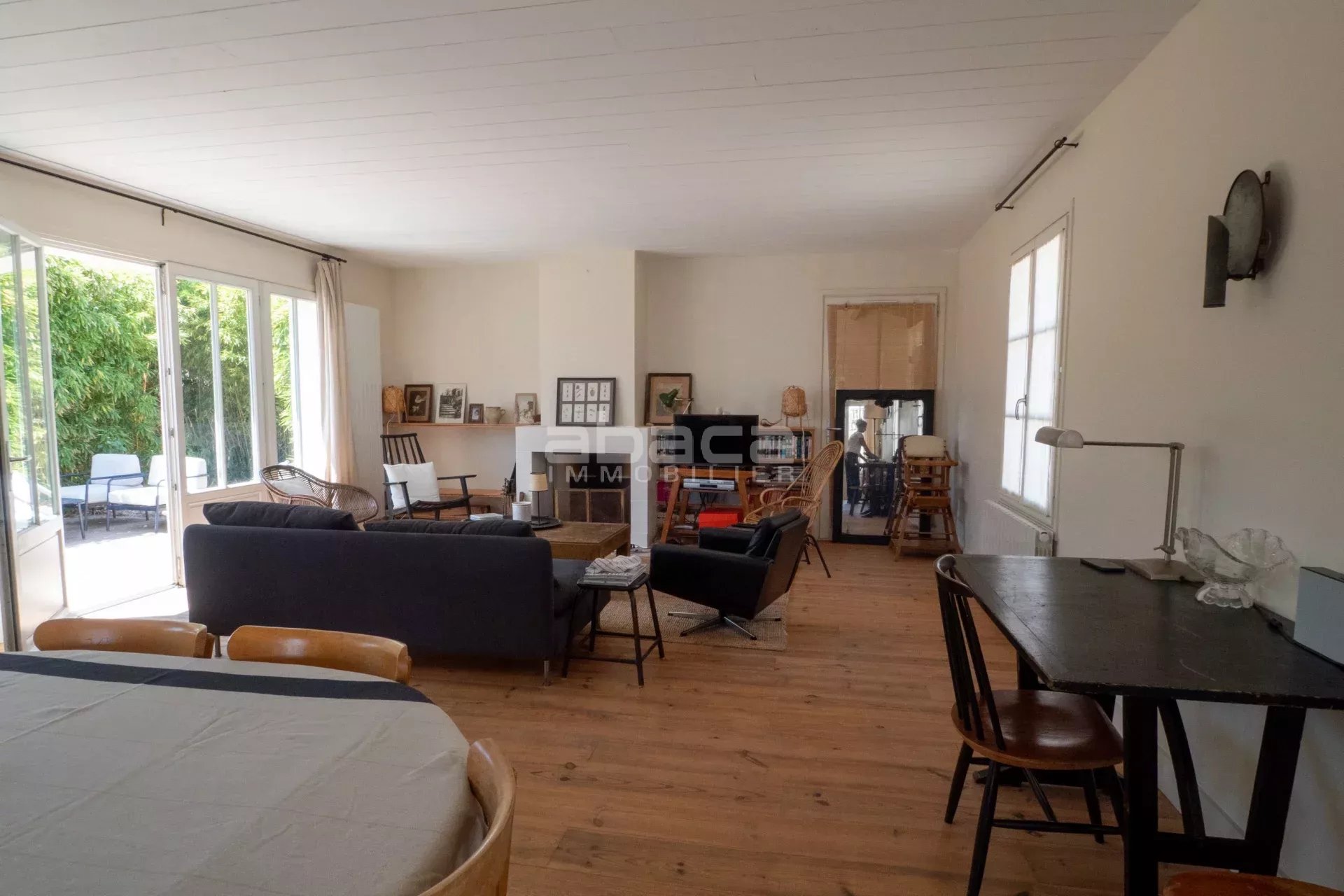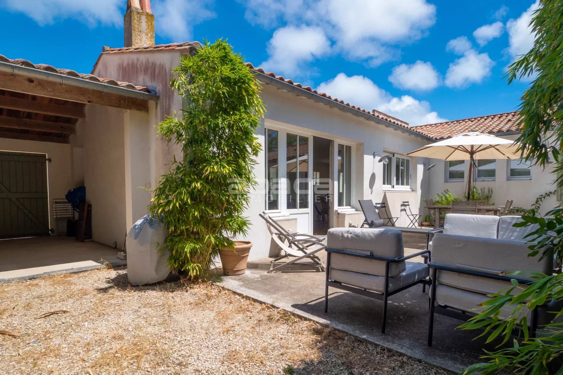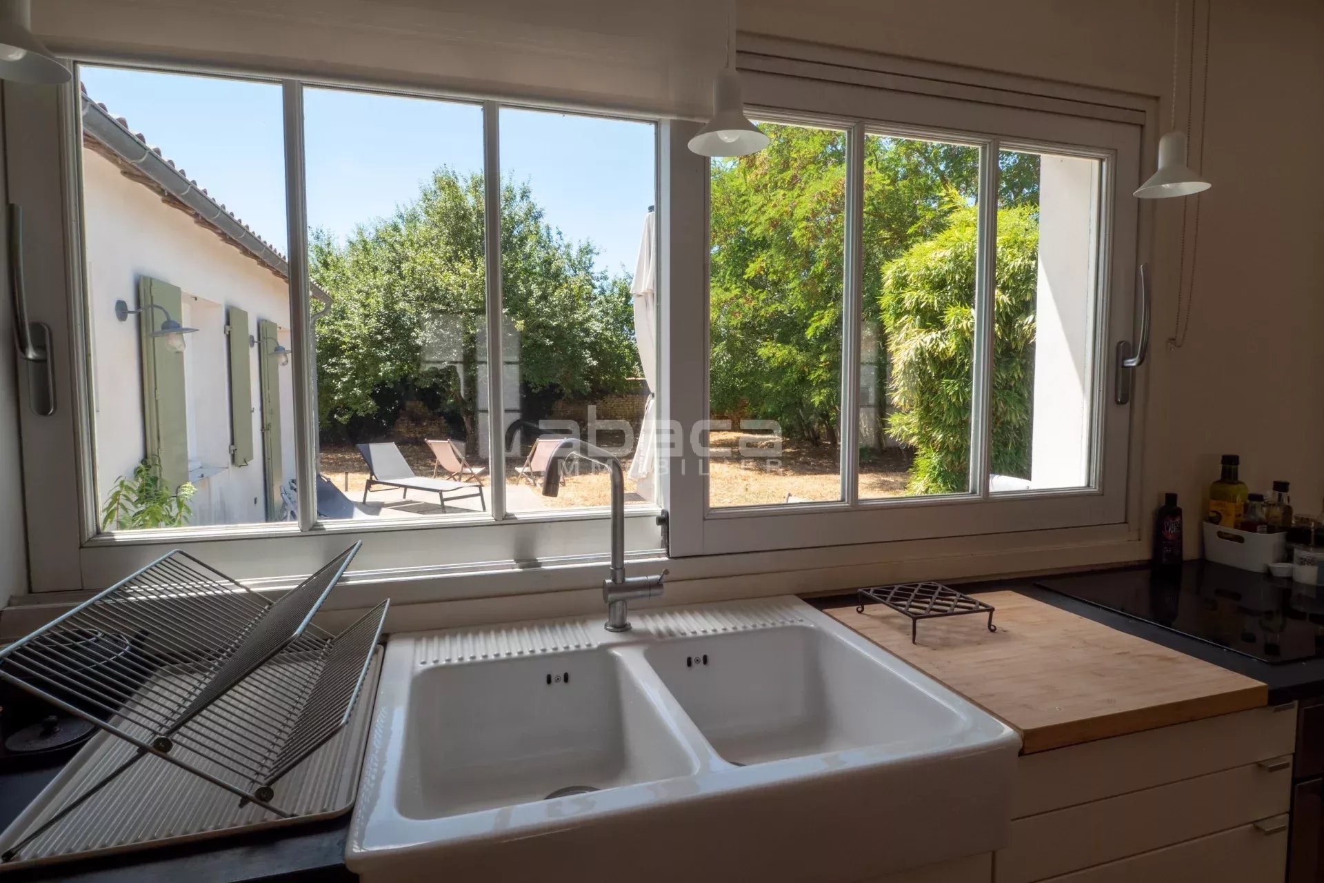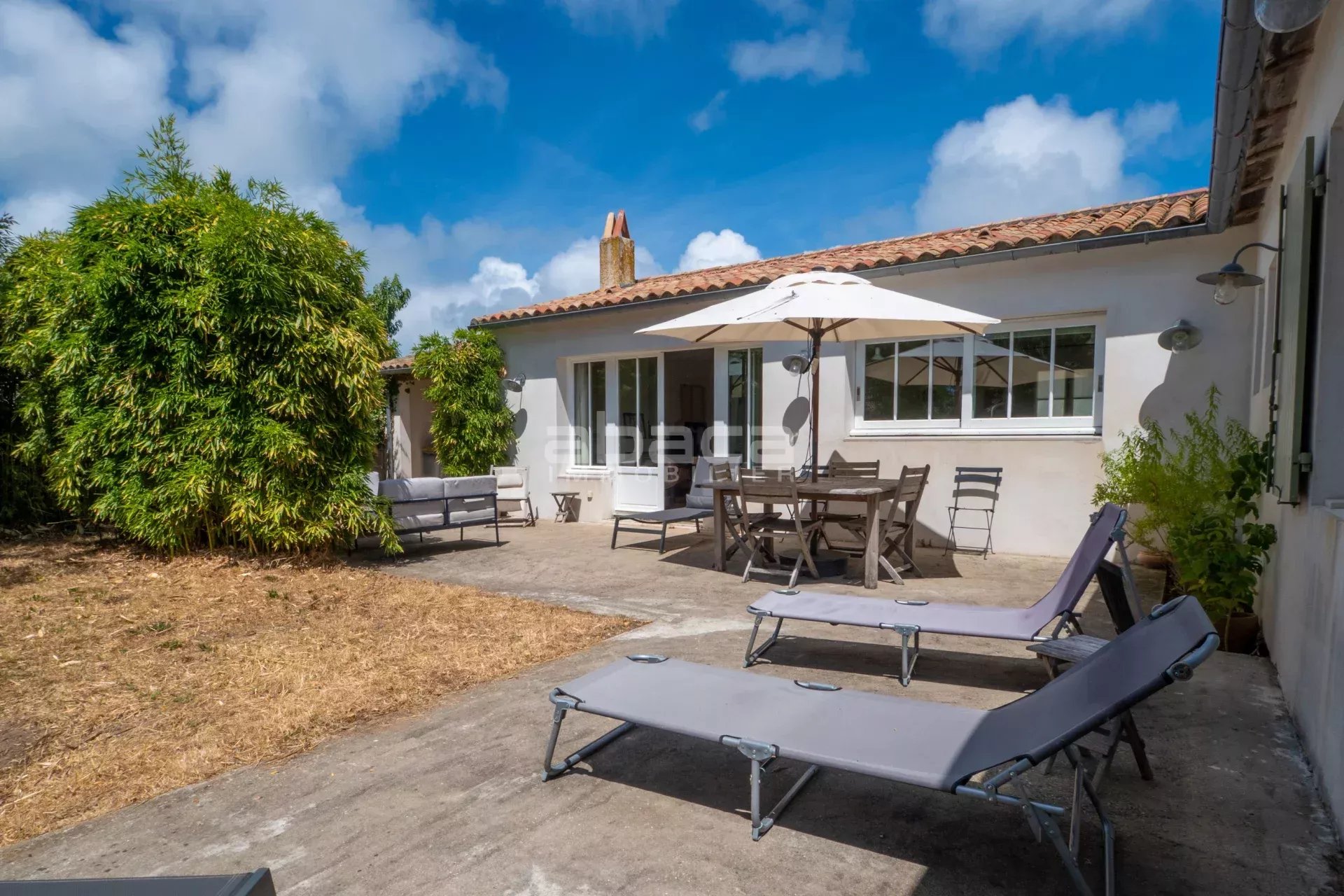 Dans un environnement privilégié à quelques pas du centre. Jolie maison de plain pied lumineuse comprenant : entrée, séjour avec cuisine équipée et aménagée ouverte, dégagement vers un couloir desservant 2 chambres avec salle d'eau et toilettes, grande chambre principale avec salle de bains et toilettes. Le tout ouvre sur une terrasse et jardin avec garage traversant. C'est un bien rare à découvrir avec l'Agence Abaca des Portes en Ré.