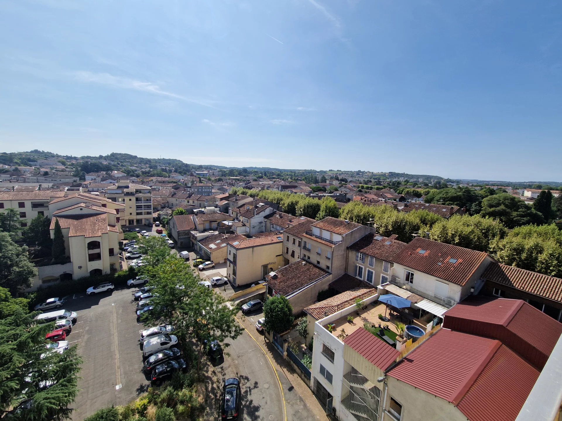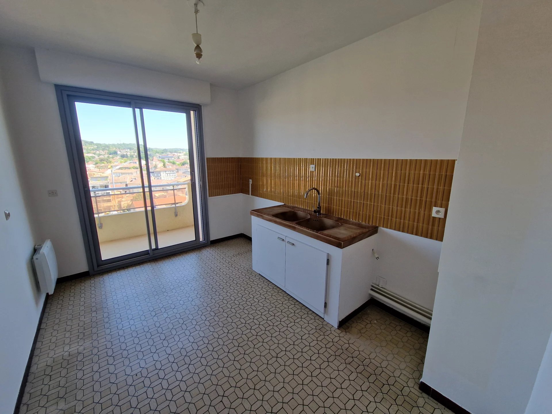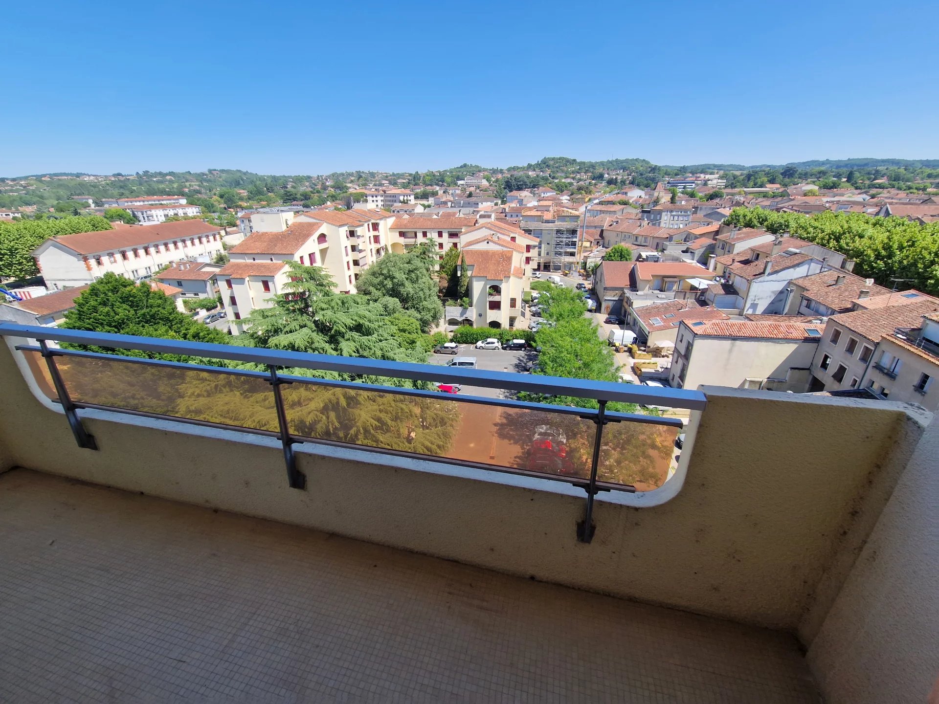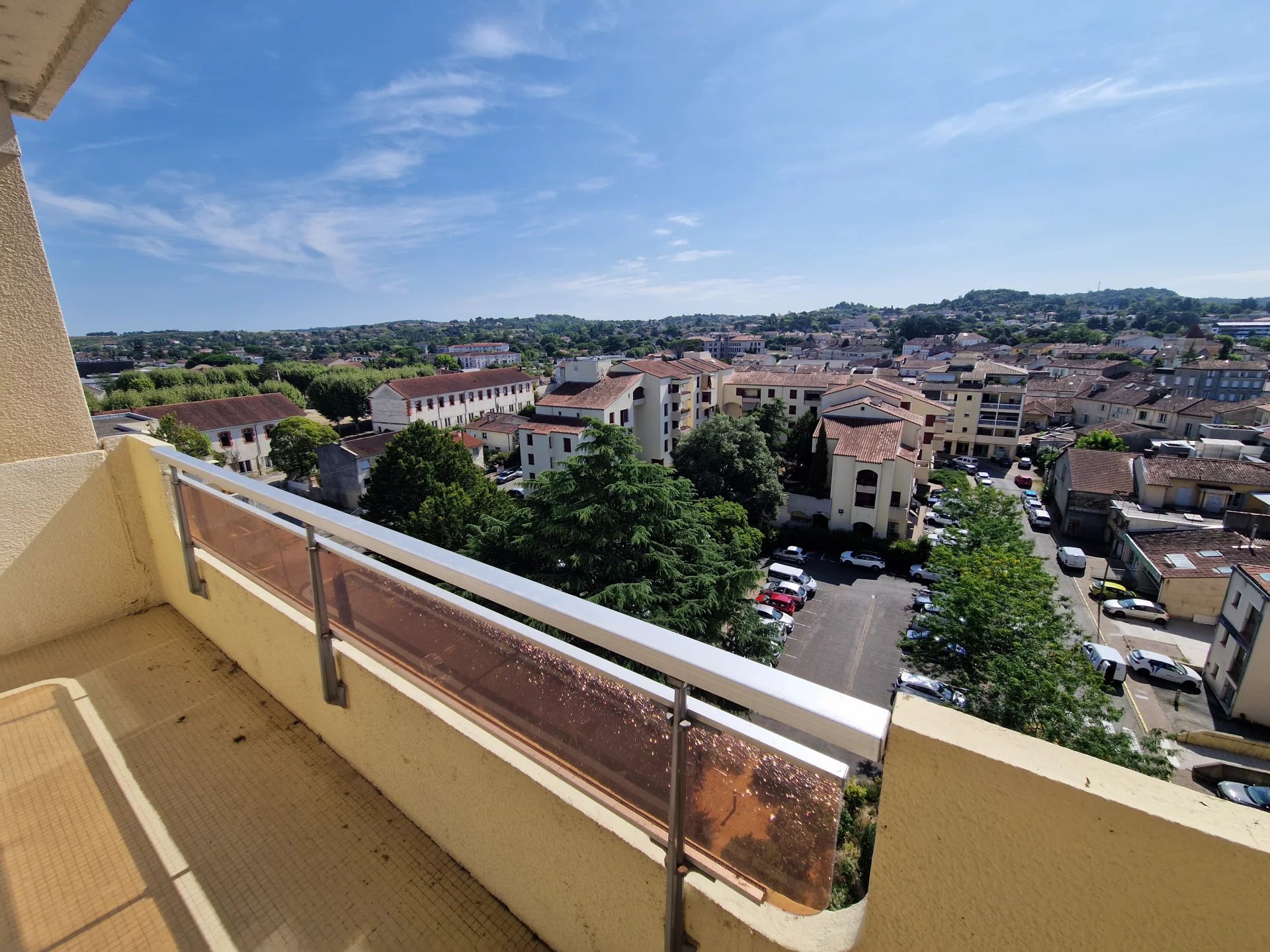 Dans résidence prisée du centre ville d'Auch, Situé au dernier étage avec ascenseur vous profiterez d'une vue dominante et dégagée. Cet appartement T3 de 90m² offre de vrais espaces, une belle entrée avec de grands placards, une cuisine avec coin repas ouvrant sur le balcon, un salon lumineux avec également son accès au balcon, un cellier/buanderie de 8m², deux chambres avec du rangement et une spacieuse salle d'eau. Possibilité de louer une place de parking dans la résidence pour 60 euros. Toutes les commodités sont situées au bas de l'immeuble, commerces, cinéma...