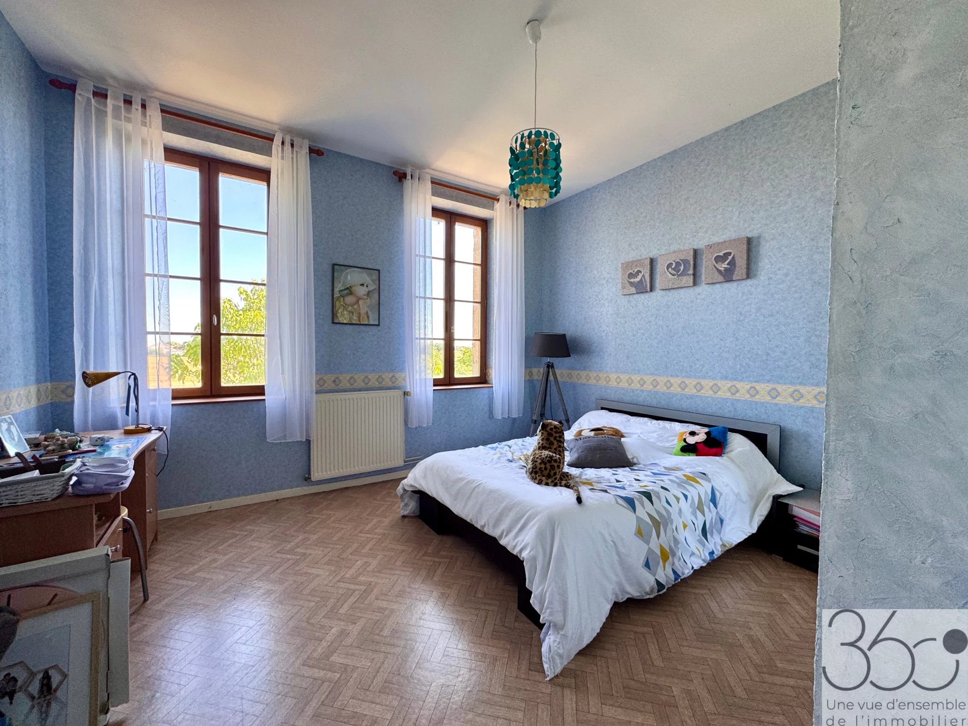 A l'étage quatre grandes chambres avec une belle hauteur sous plafond, une salle de bain/douche et un WC séparé.