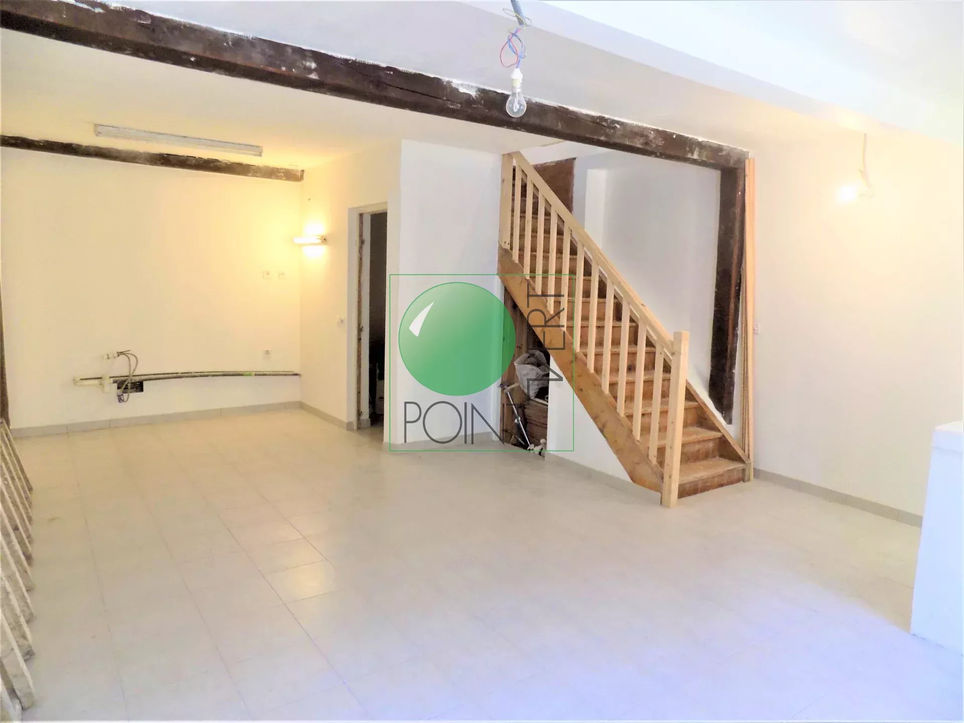 Maison de ville de type F5 sur 3 niveaux comprenant séjour salon avec coin cuisine à créer, cellier, wc. Au 1er étage dégagement desservant 2 chambres, salle d'eau avec baignoire à terminer, wc. Au 2ème étage dégagement, 1 chambre, salle d'eau avec wc à créer. - TRAVAUX A PREVOIR - DPE : E (NOUVELLE VERSION)
