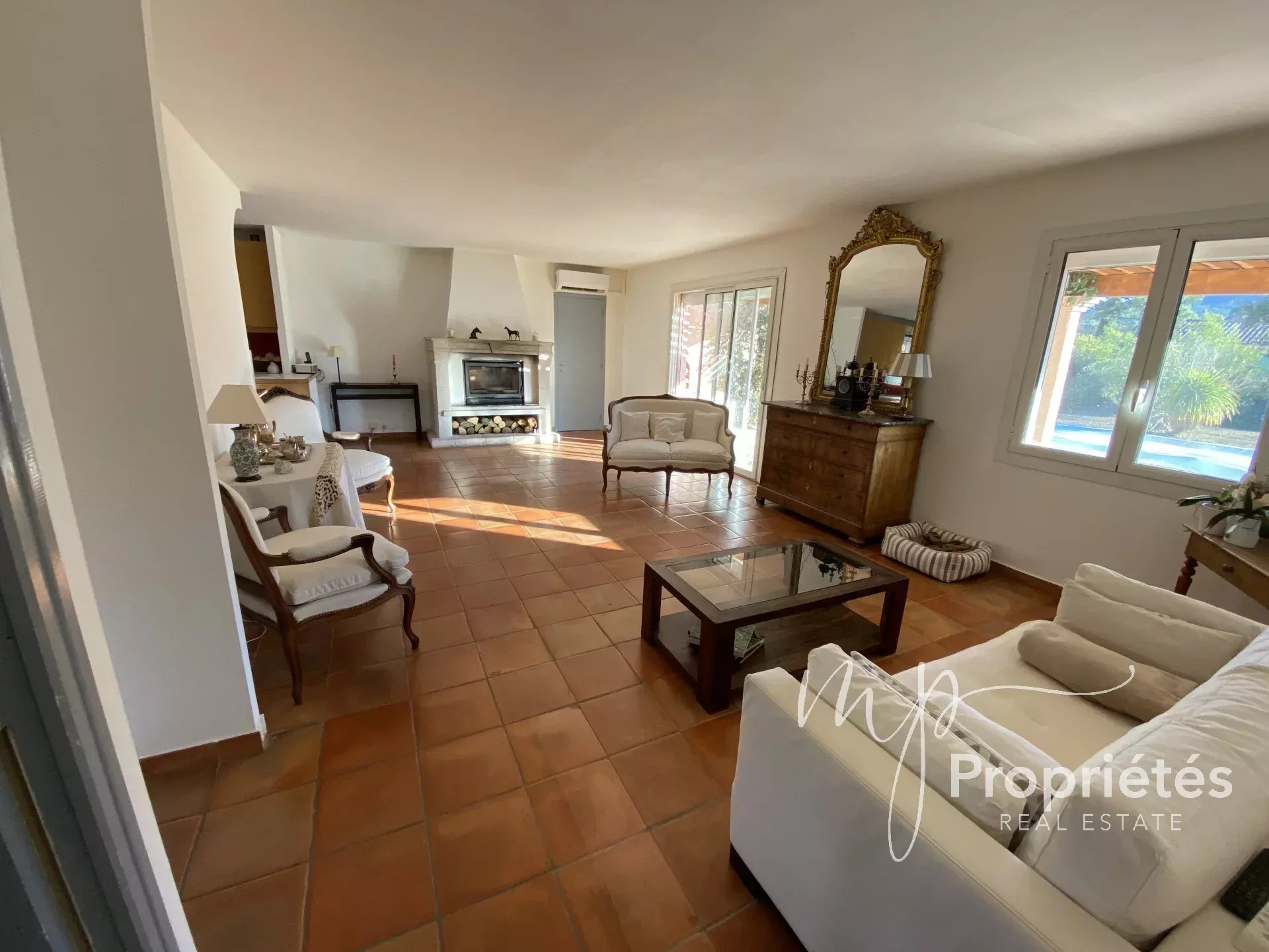 La villa est composée d’un grand salon avec cheminée donnant sur la terrasse et piscine.