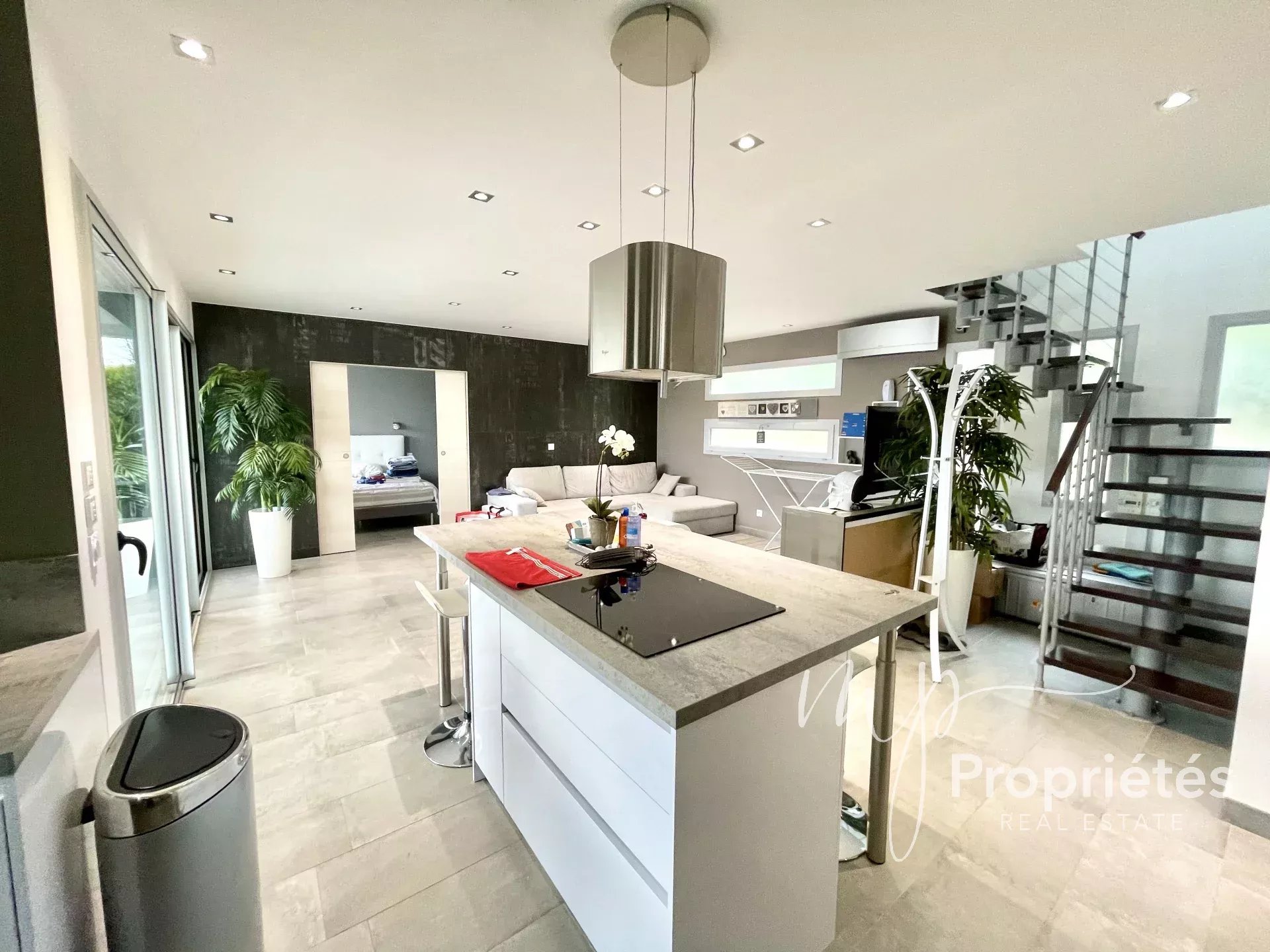La maison est composée au rez-de-chaussée d'un grand salon lumineux, une cuisine ouverte équipée et aménagée, une chambre avec placard, douche et toilette, et un toilette séparé. Le tout donnant sur une large terrasse et piscine chauffée 6x4 (exposée sud).