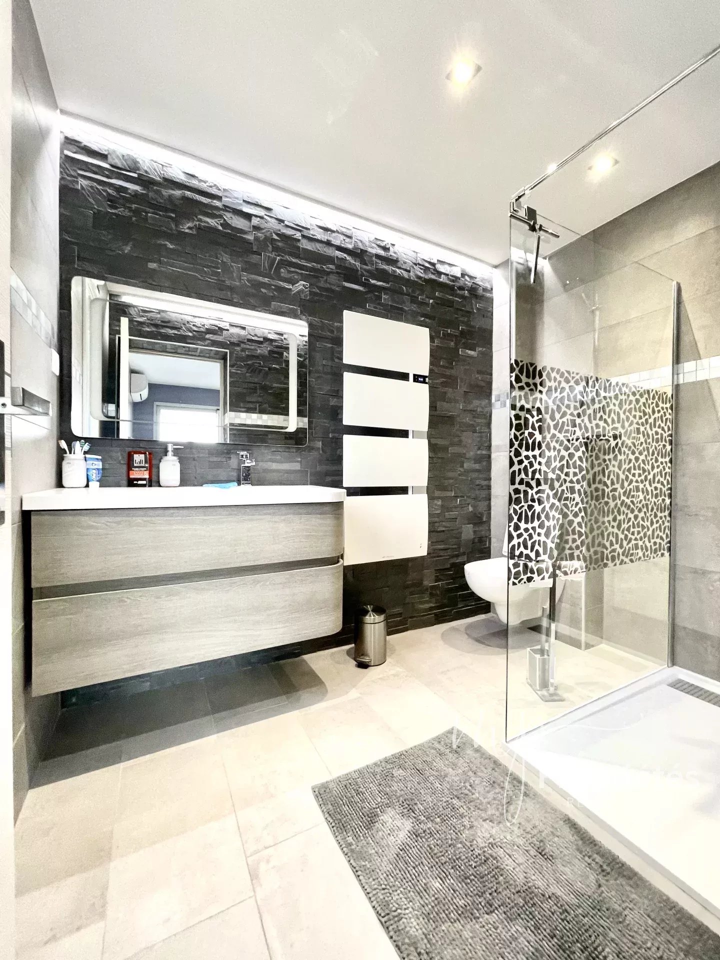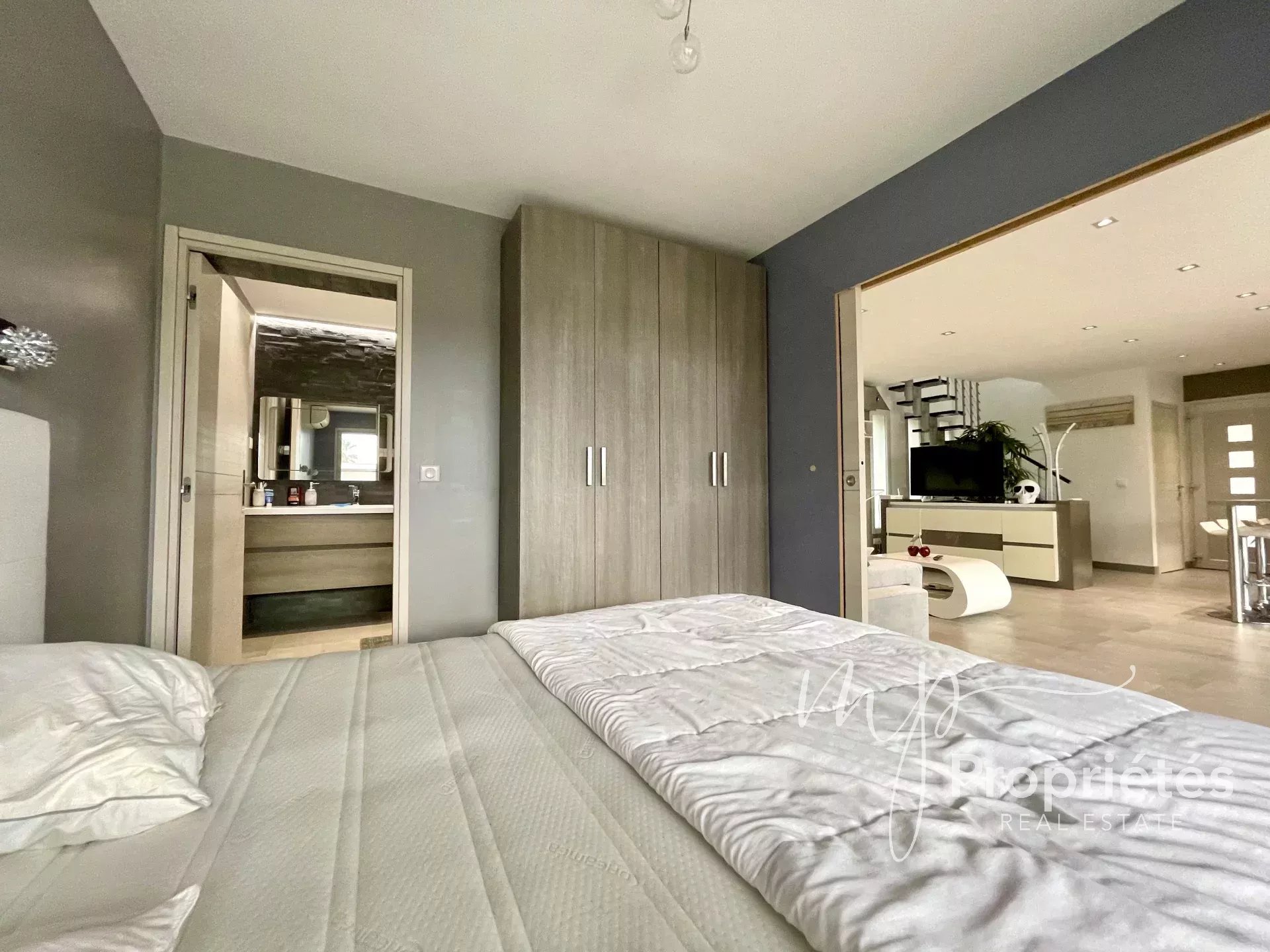 A l'étage : 2 chambres avec salle d'eau et placards aménagés donnant sur une grande terrasse vue mer. Un toilette séparé.