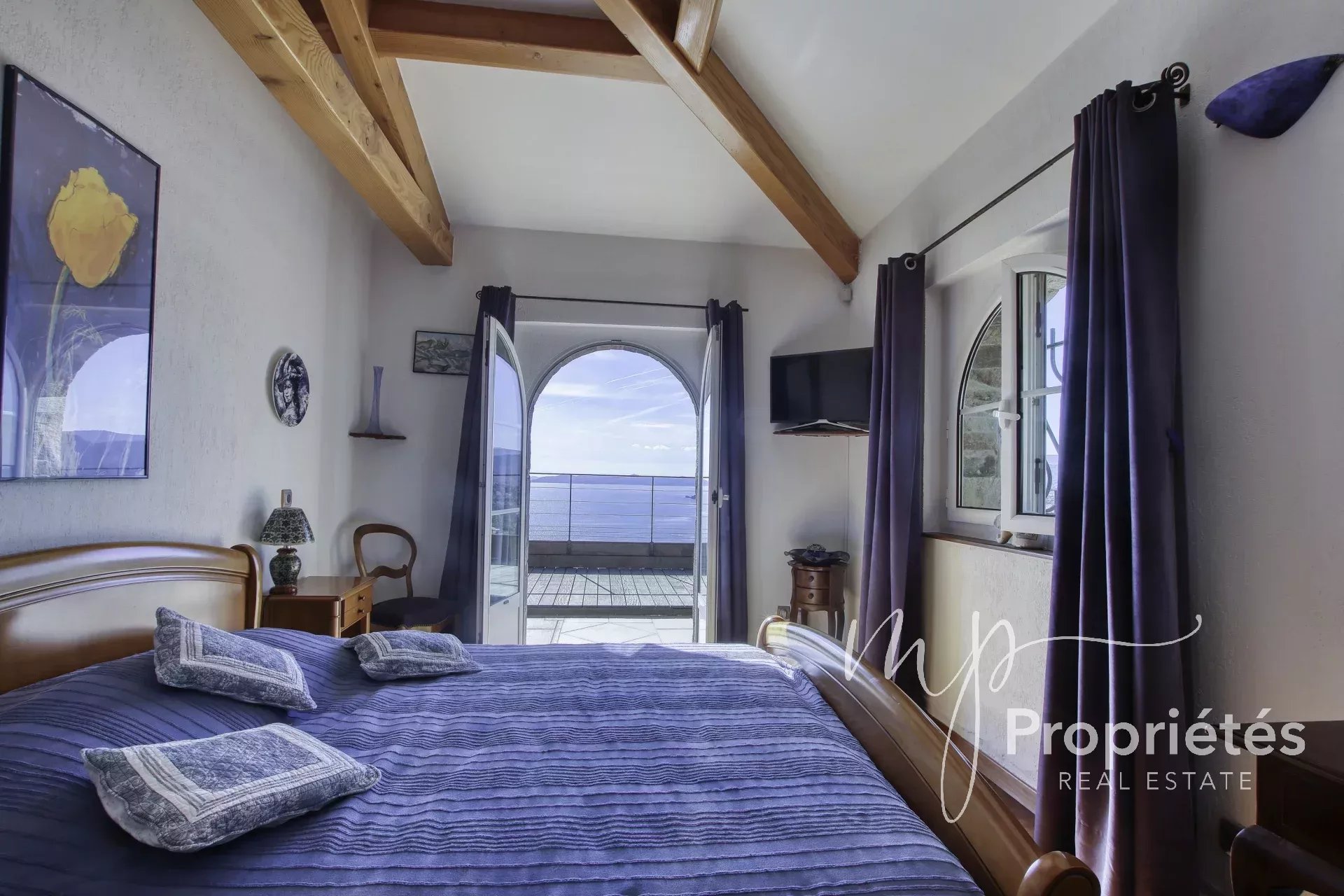 À l’étage, quatre chambres climatisées, chacune avec salle d’eau ou salle de bains privative, bénéficient toutes d’une vue mer et d’un accès terrasse.