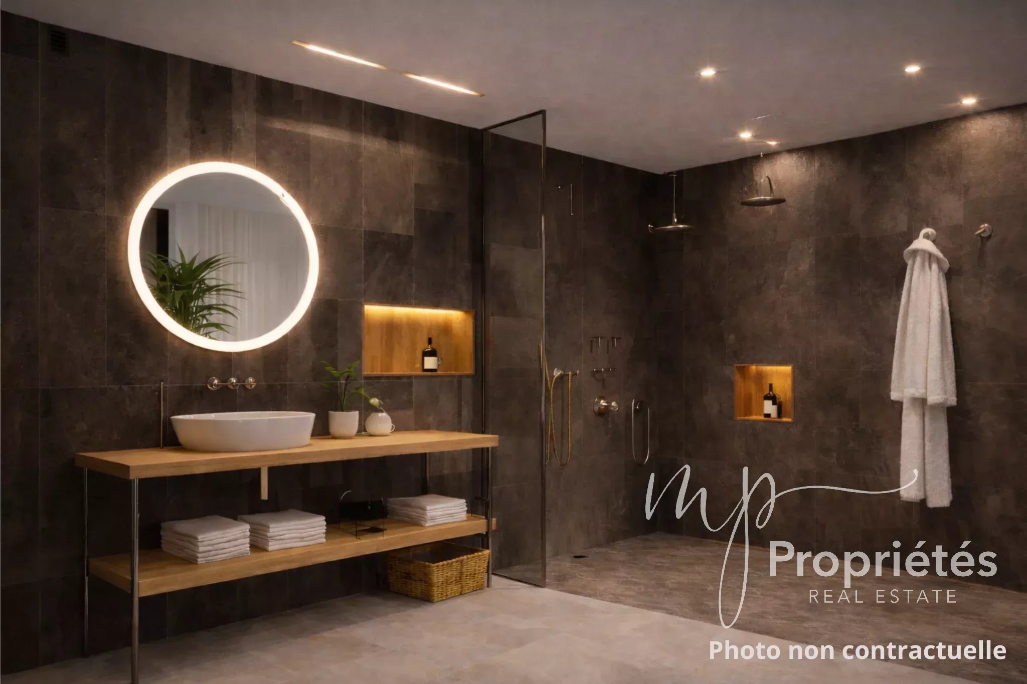 D'une surface de 220 m² environ, cette villa offre au rez de chaussé; un espace de vie spacieux et lumineux de 65.35m² donnant sur une terrasse de plus de 124m² avec sa piscine à débordement, une suite parentale avec sa salle de bain et un toilette visiteur.