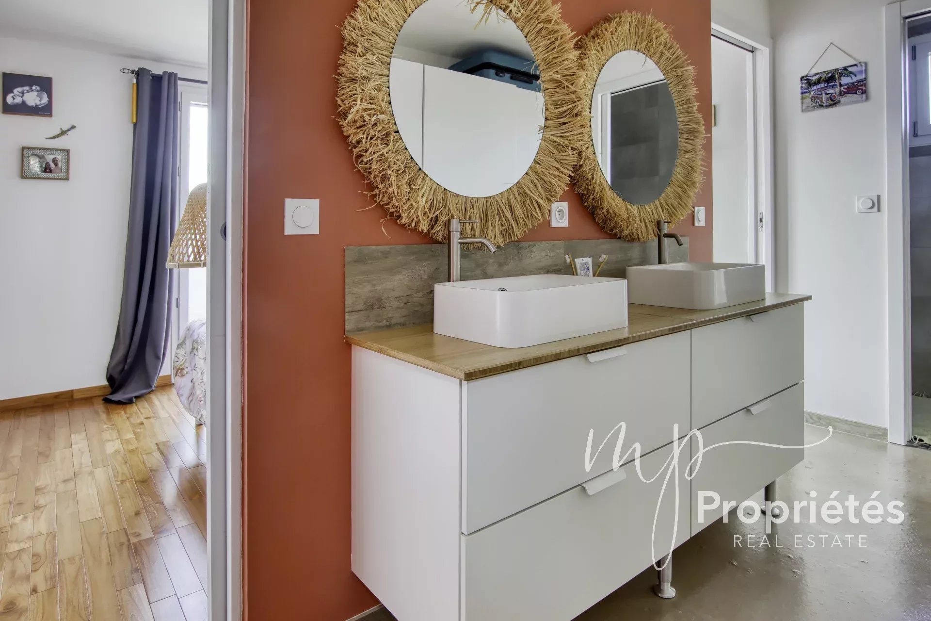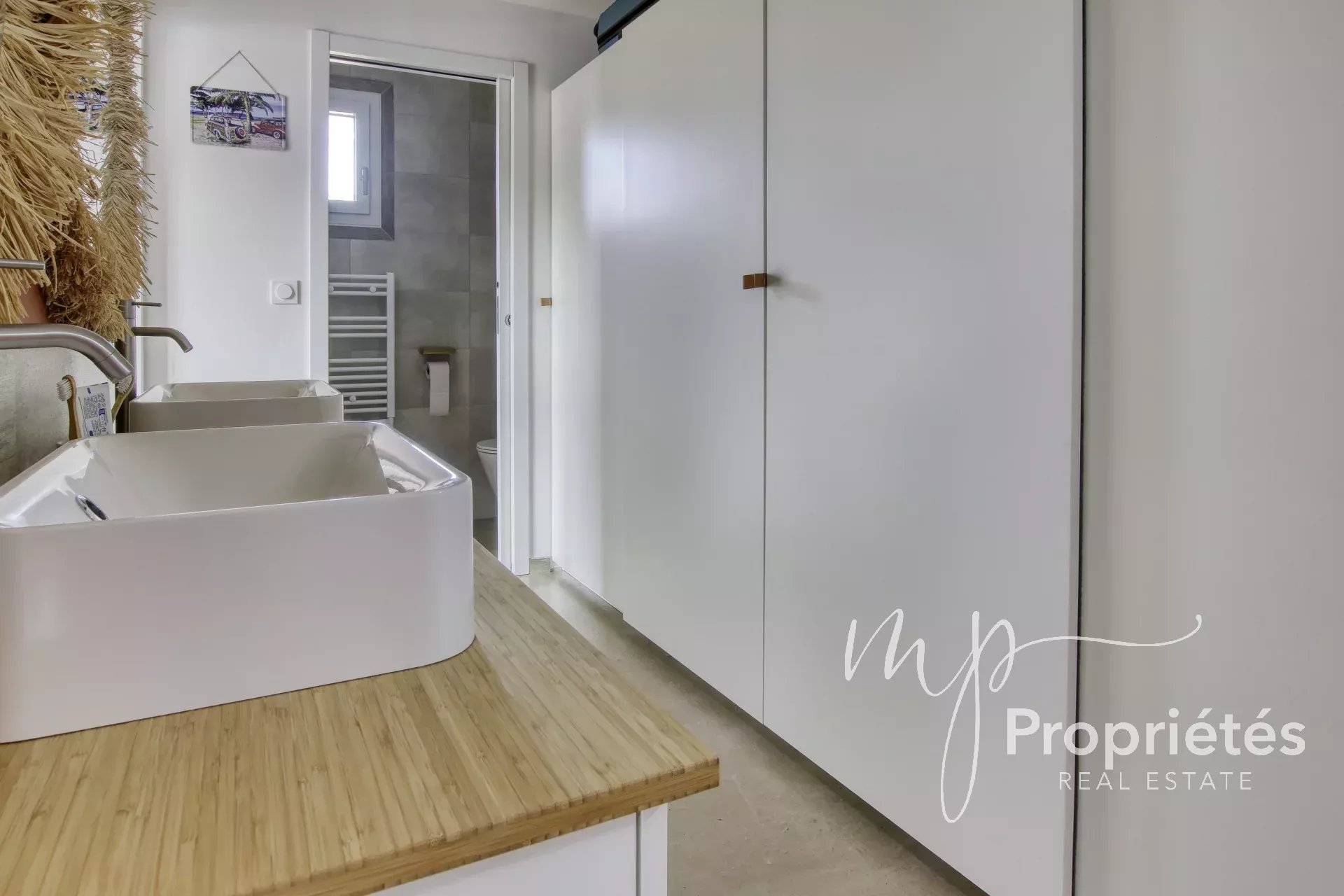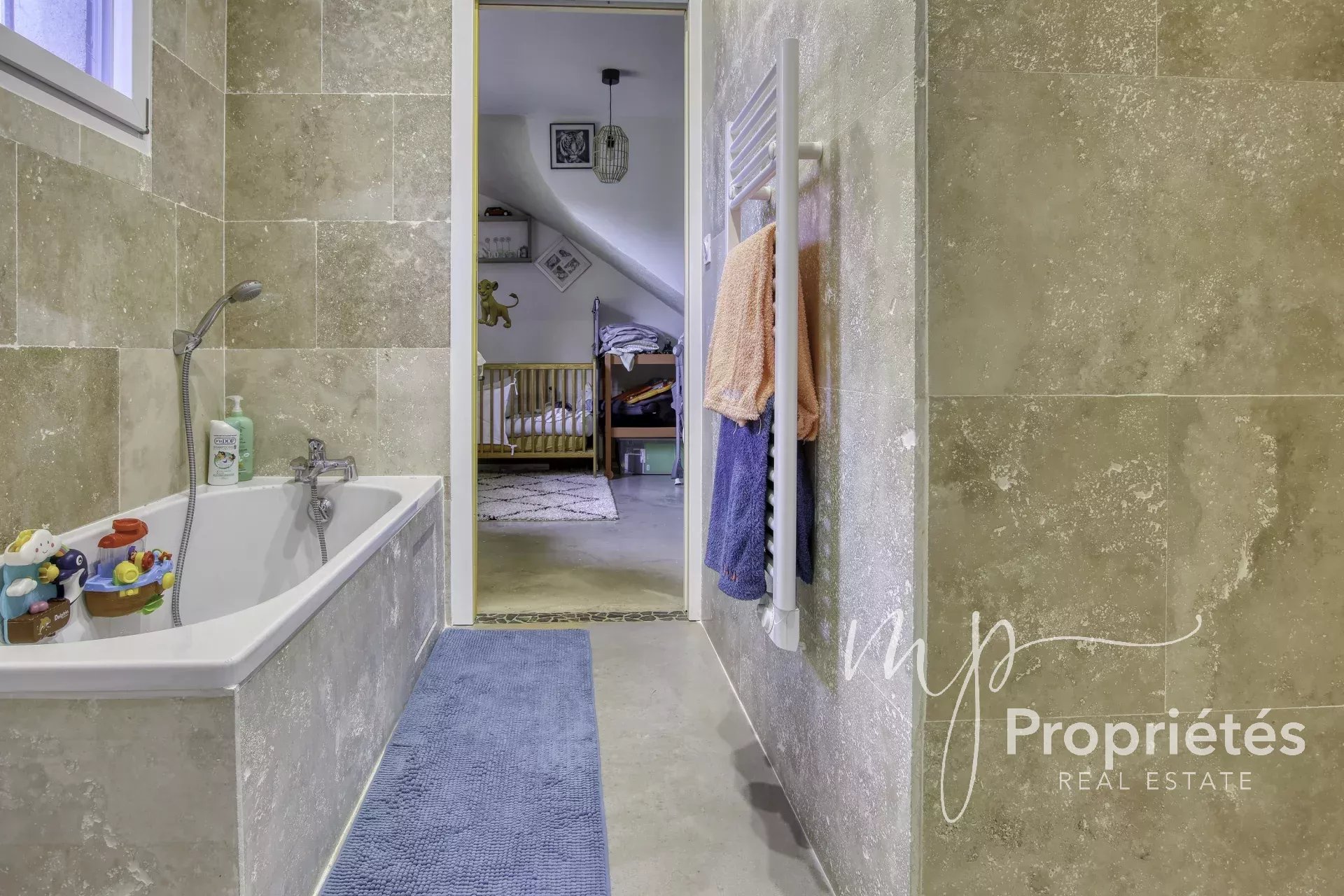 À l'étage, vous découvrirez une chambre parentale élégante avec un dressing généreux avec double vasque et une salle de douche avec toilette privée.
