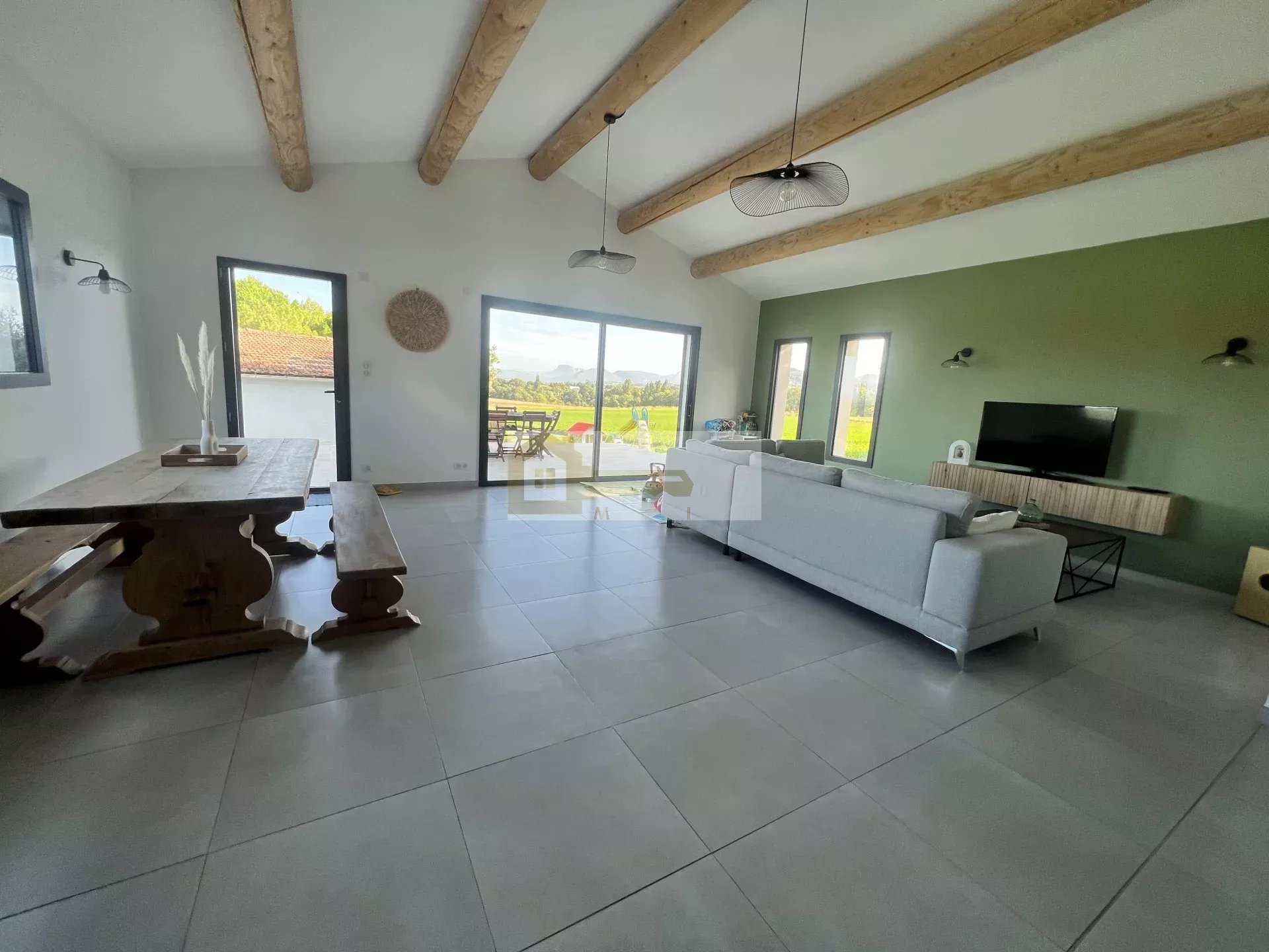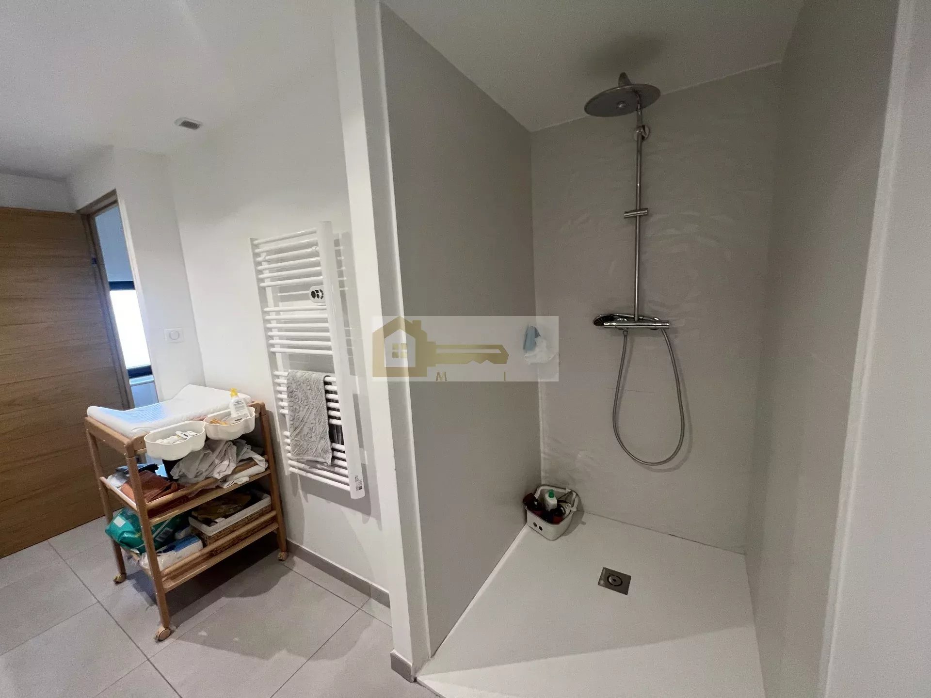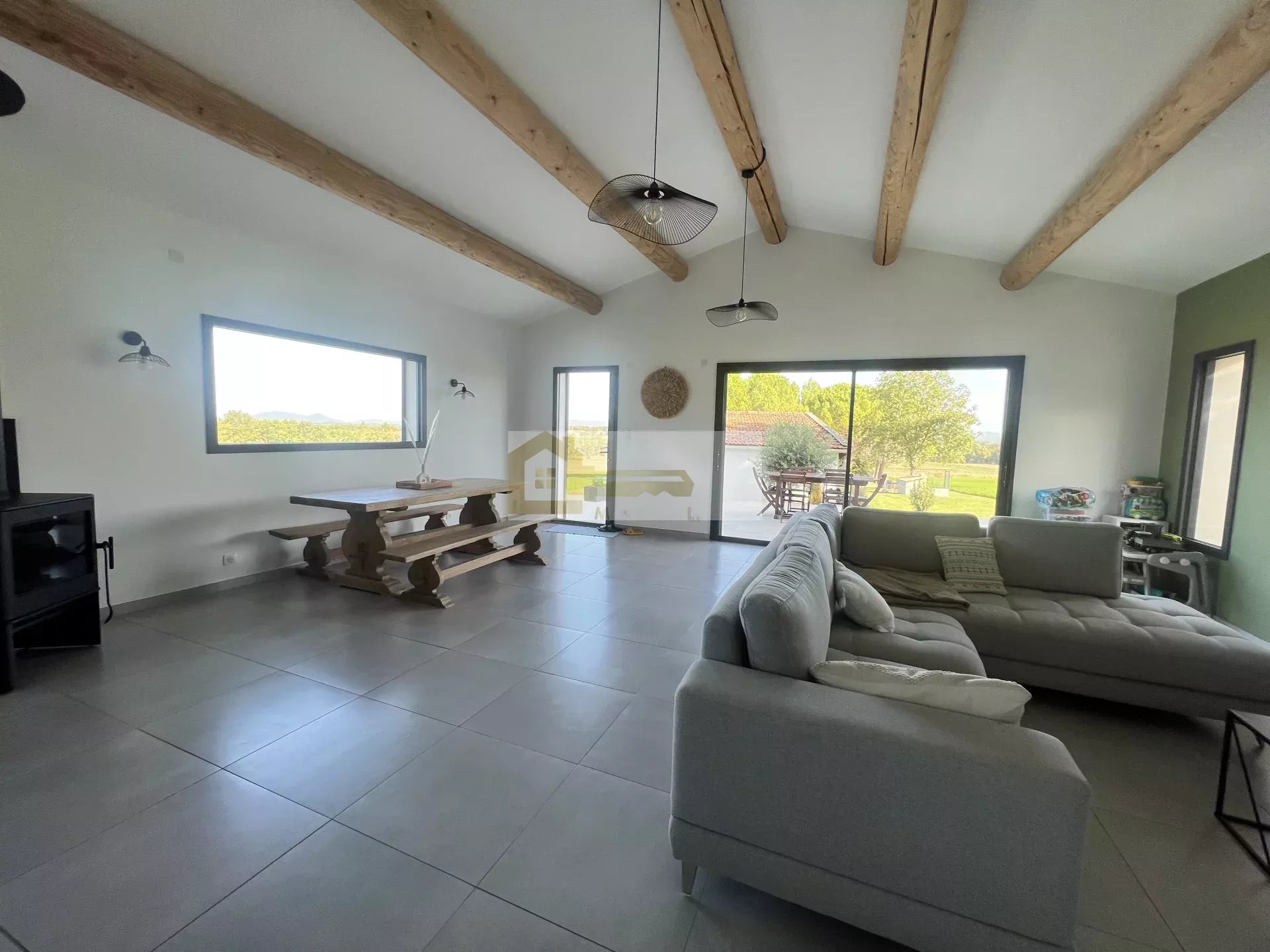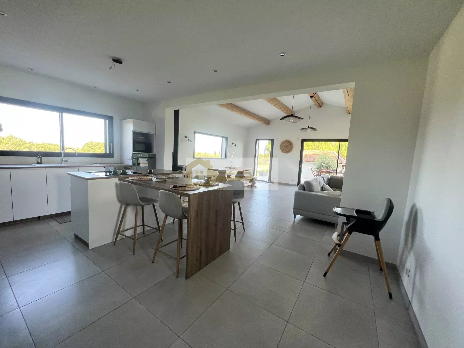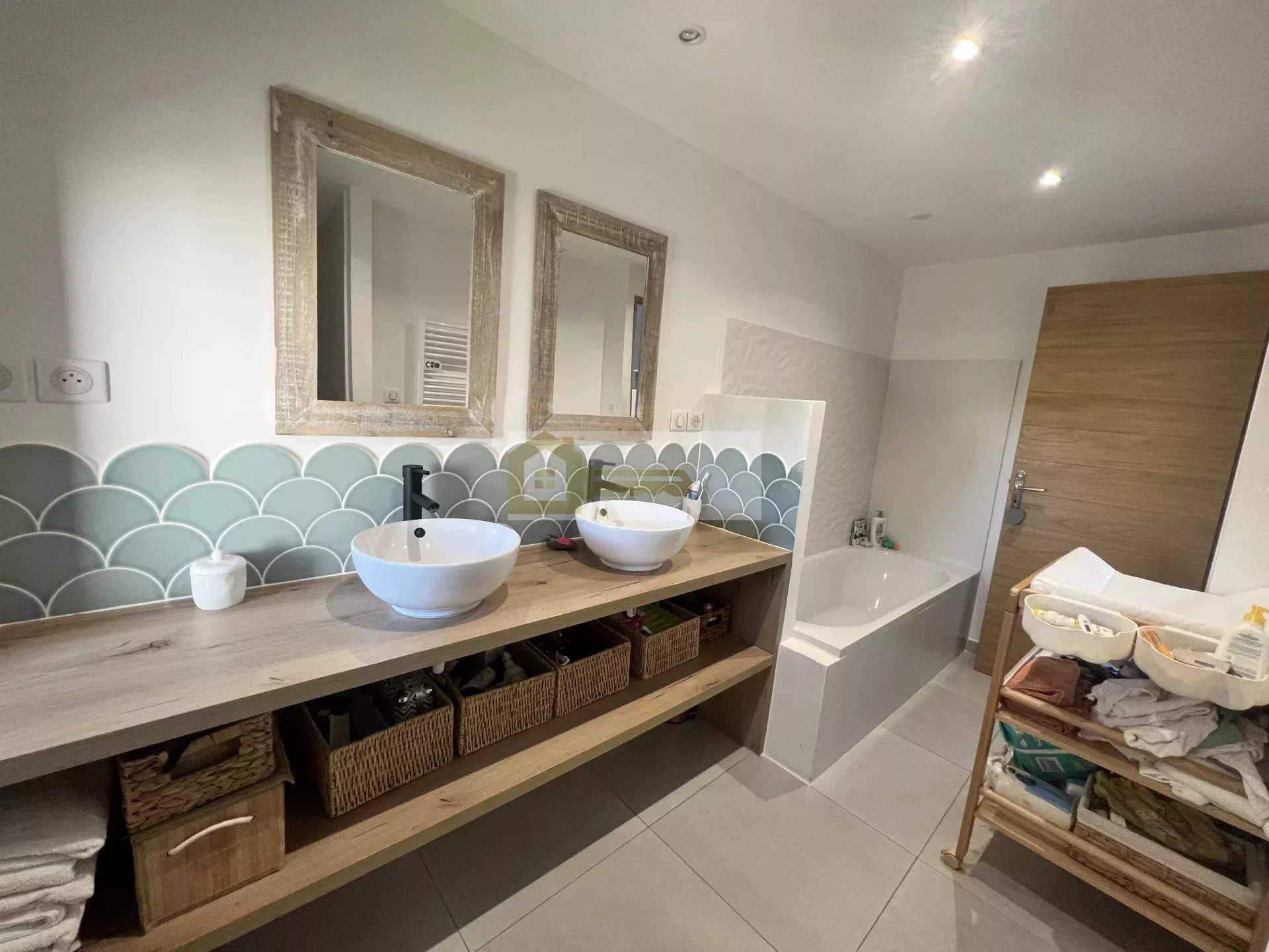 Elle se compose en rez-de-chaussée d'un spacieux hall d'entrée donnant sur une agréable pièce de vie de 60 m2 avec cuisine équipée et ouverte avec accès à un cellier/buanderie. Dans la partie nuit on y découvre une chambre, un WC séparé ainsi qu'une salle de bain qui comprend une grande douche à l'italienne, une double vasque et une baignoire, l'étage est disposé de 2 chambres.