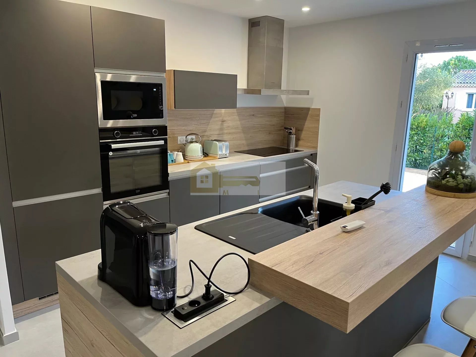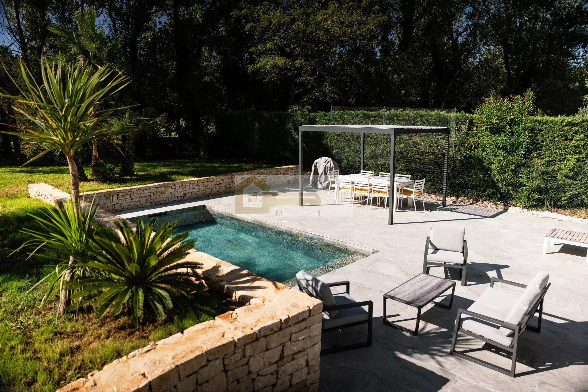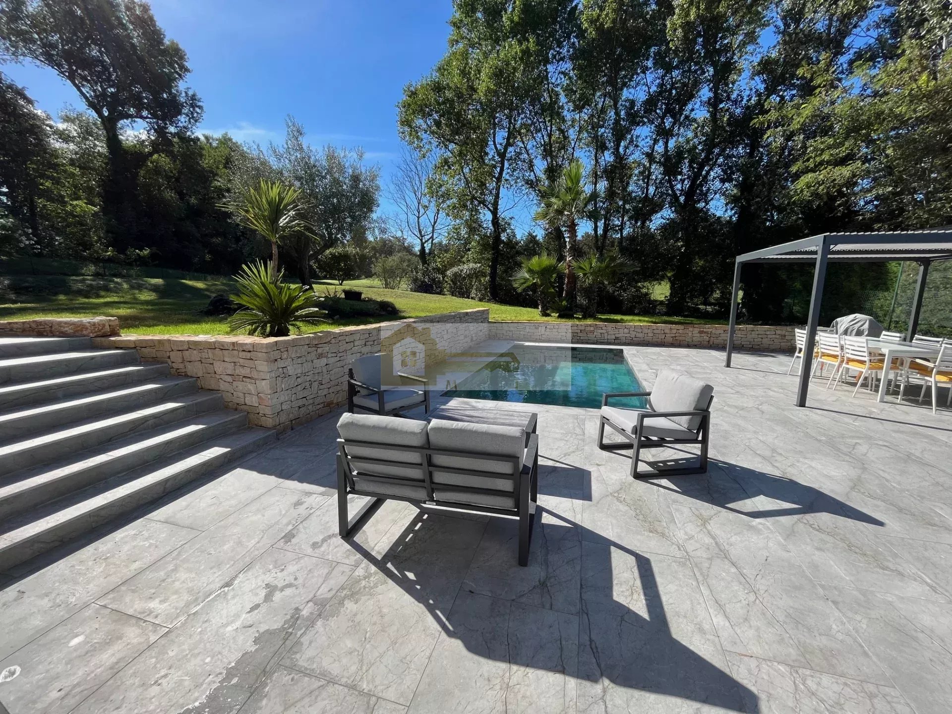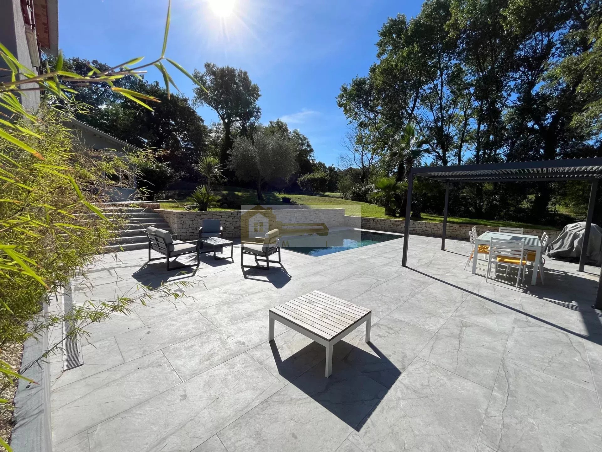 Ce bien est implanté sur un agréable terrain avec vue dégagée, un bel espace gazonné et arboré, ainsi qu'une agréable terrasse avec piscine au sel.