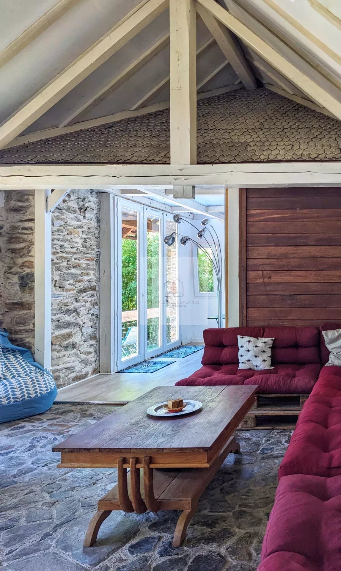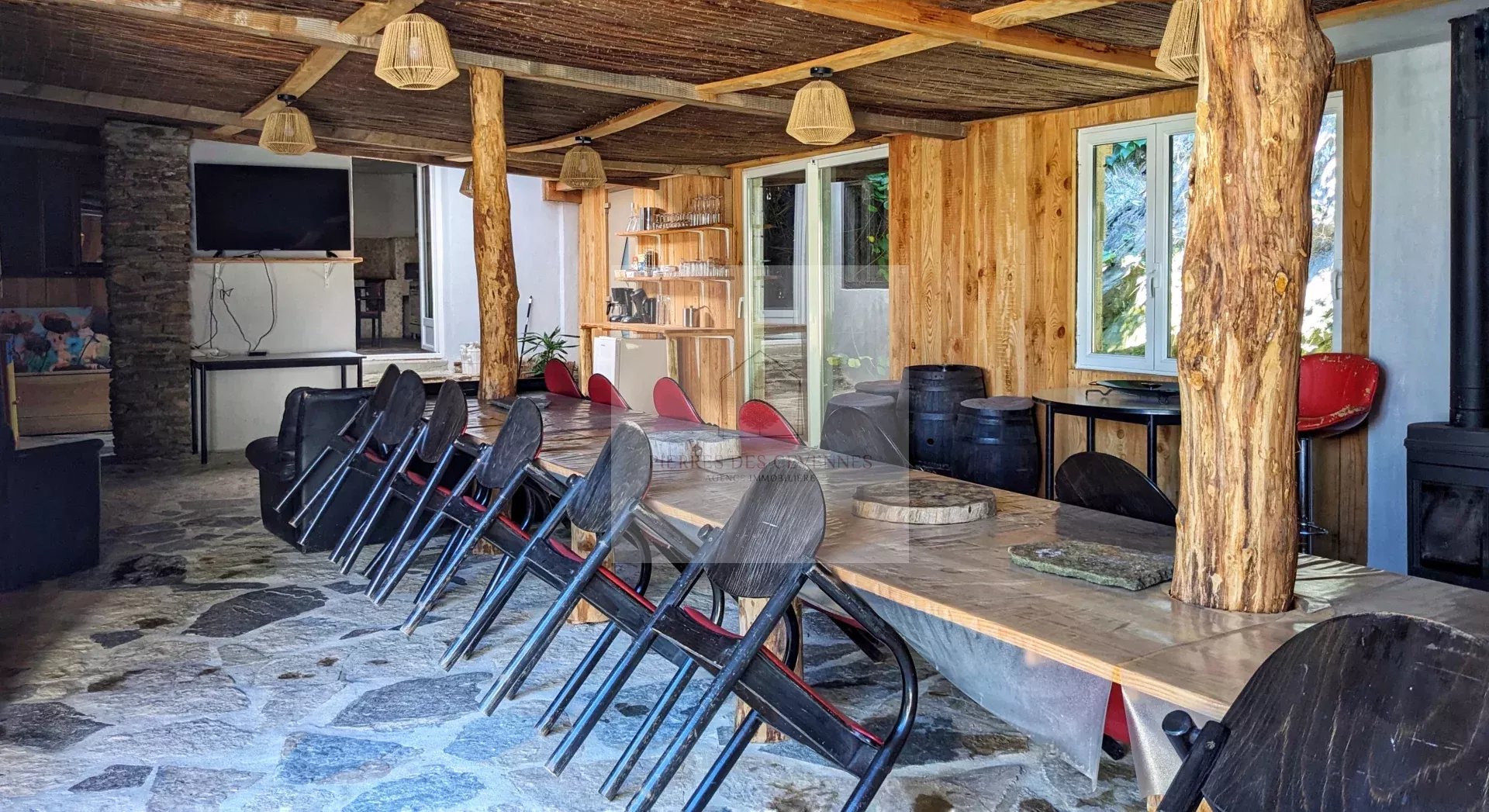Bien d'exception unique en pierres et bois exotique, de 180 m² en excellent état. Maison chaleureuse et spacieuse, de plain-pied et bien exposée. Elle se compose d'une pièce de réception de 66 m², une cuisine de 20 m², salon, bureau, bibliothèque et 3 suites. Terrain de 1428 m² piscine et une vue dégagée, sur la vallée. La propriété est actuellement exploitée en locations saisonnières En limite du parc national des Cévennes, dans un secteur préservé,