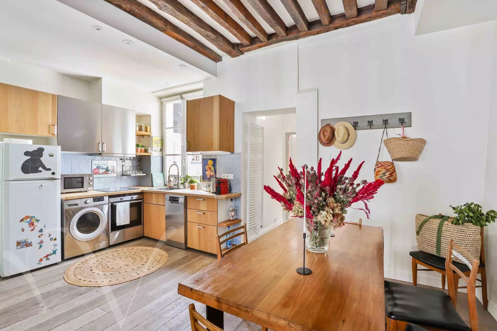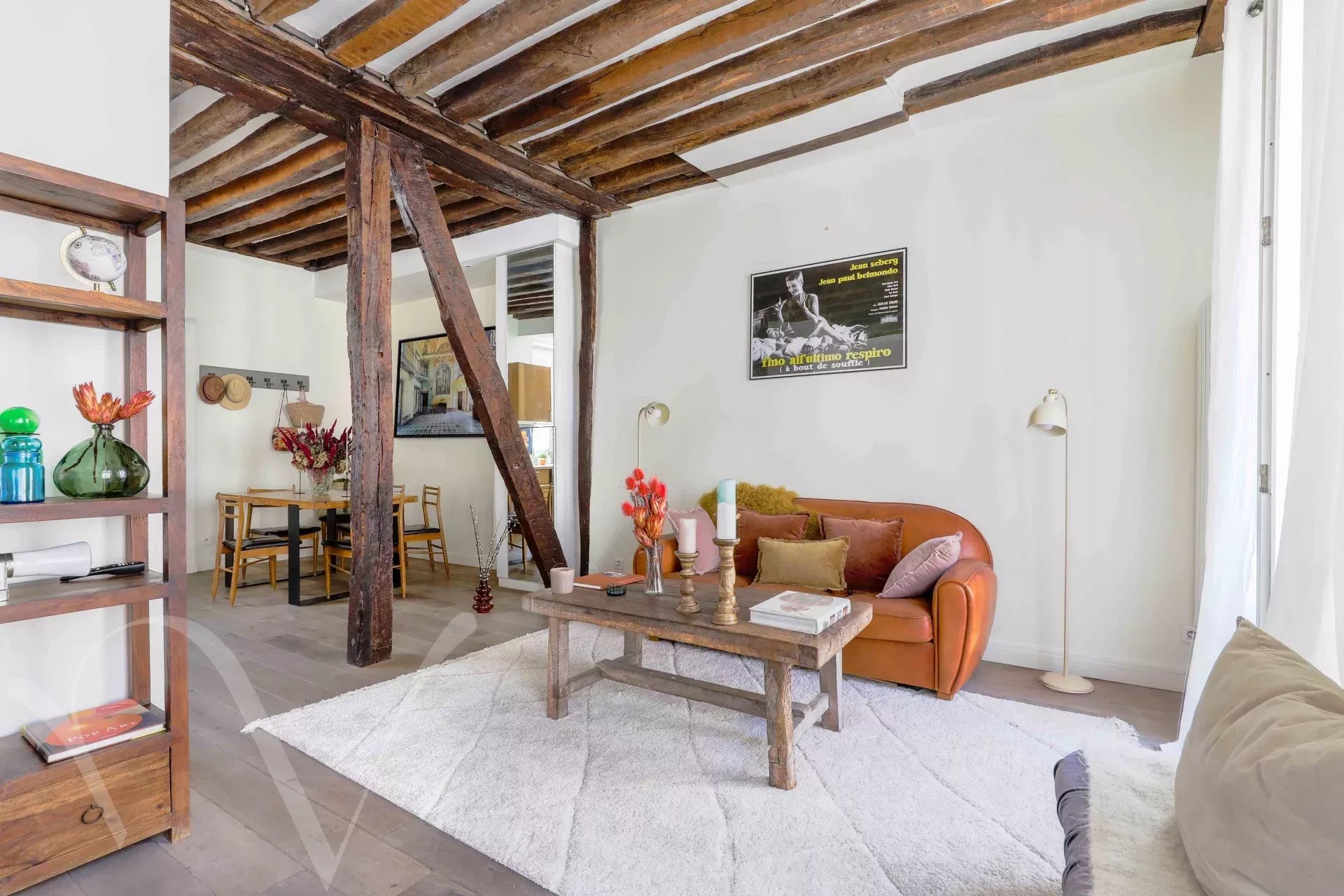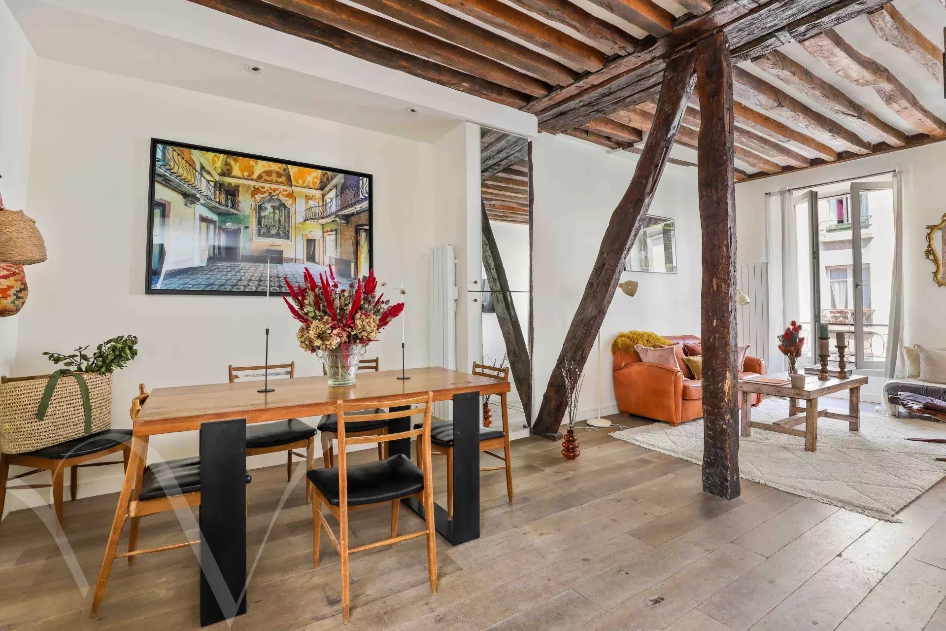 Exclusivité. Situé au 3e étage sans ascenseur d'un immeuble de la fin du XIXe siècle, cet ravissant appartement de 61 m² est niché dans le quartier prisé des Archives, au cœur du 3e arrondissement de Paris. Il se compose d'un beau salon, d'un agréable espace salle à manger avec cuisine ouverte et, de part et d'autre des pièces de réception, des deux chambres lumineuses. Il comprend enfin une salle d'eau et des toilettes séparées. Un mélange de modernité et de charme avec ses poutres apparentes et son parquet chaleureux. Idéalement localisé au cœur d'une rue calme du Haut-Marais, cet appartement est proche de tous les commerces et restaurants, et est bien desservi par les transports en commun.