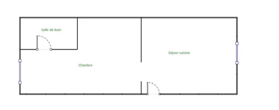En Rez de chaussée : Appartement 2 pièces, avec une cuisine ouverte équipée, un salon, une chambre, une salle de bain et un jardin de 36 m2.