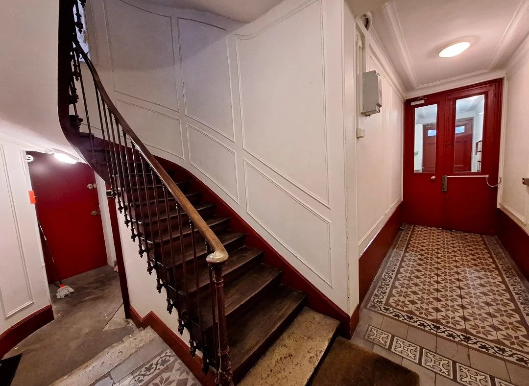 Au 1er étage d'une petite copropriété avec des parties communes entretenues.