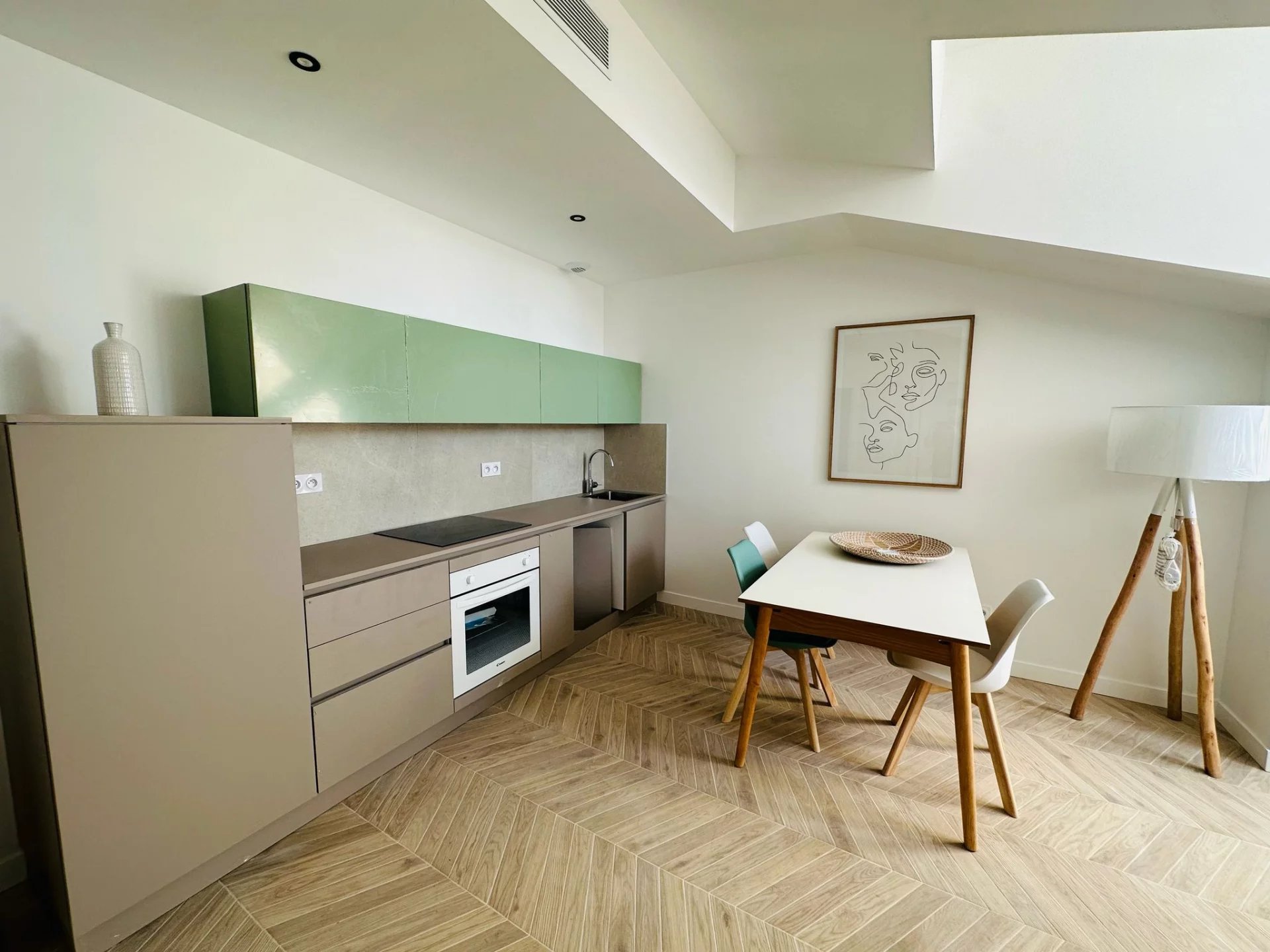 L'appartement est situé au dernier étage d'un bel immeuble bourgeois avec ascenseur. Il y a également de belles parties communes avec du marbre de Marfil crema au sol. Le 2 pièces est lumineux est consiste en: un beau séjour avec une cuisine ouverte équipée et aménagée d'environ 27 m² et une belle chambre. La salle d'eau dispose d'une douche à l'italienne, un lavabo et un WC suspendu Geberit et robinetterie Grohe. Il y a également la climatisation gainable réversible Daikin.