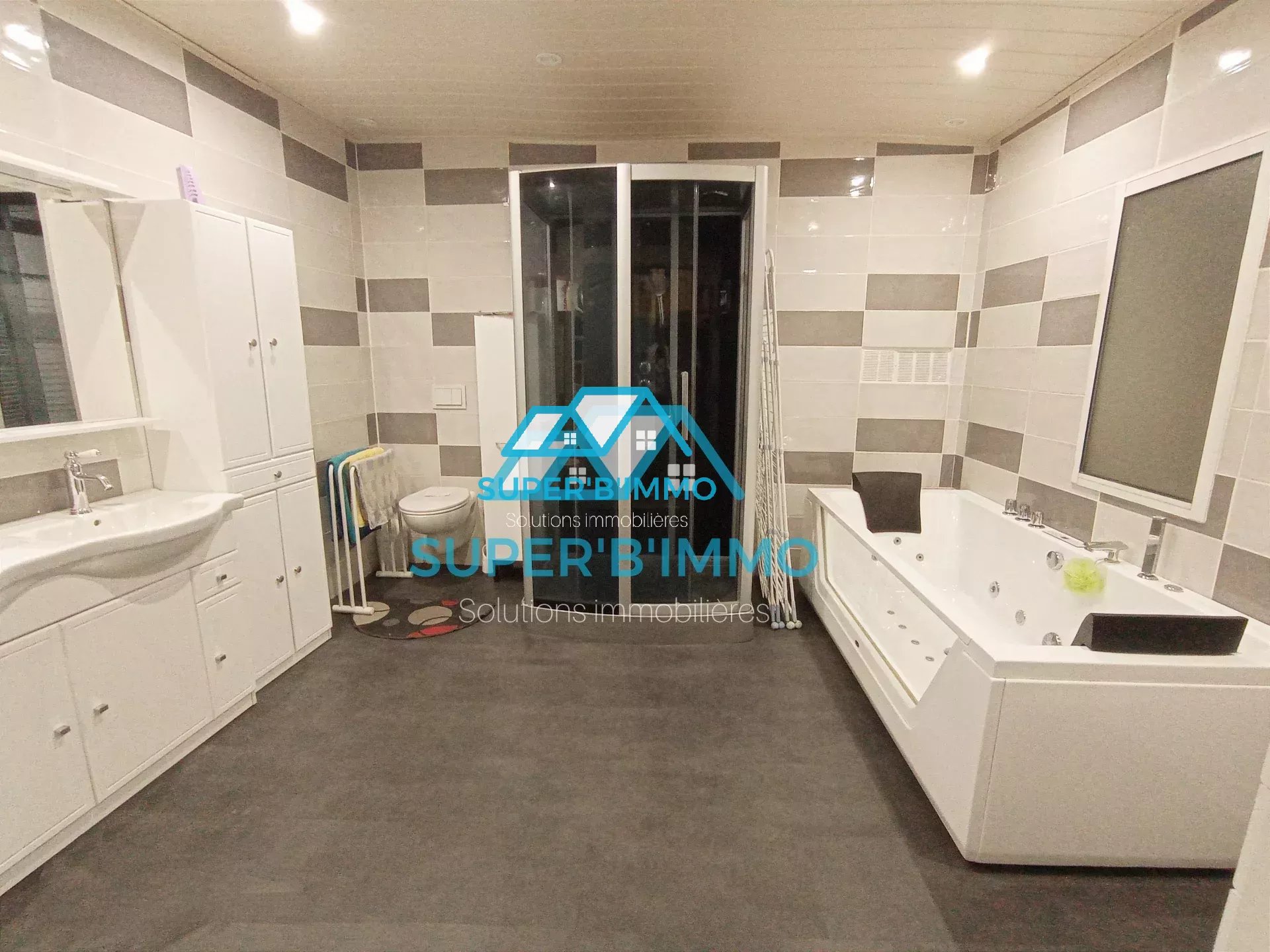- Au rez-de-chaussée : une entrée avec un grand couloir desservant une chambre spacieuse avec son dressing, une buanderie, de nombreux placards et rangements, une salle de bains avec douche connectée et jets massant, une baignoire de type jacuzzi avec de nombreux jets d'eau et un lumineux et un grand séjour de 55m2 ouvert sur une cuisine aménagée et équipée toute en marbre.