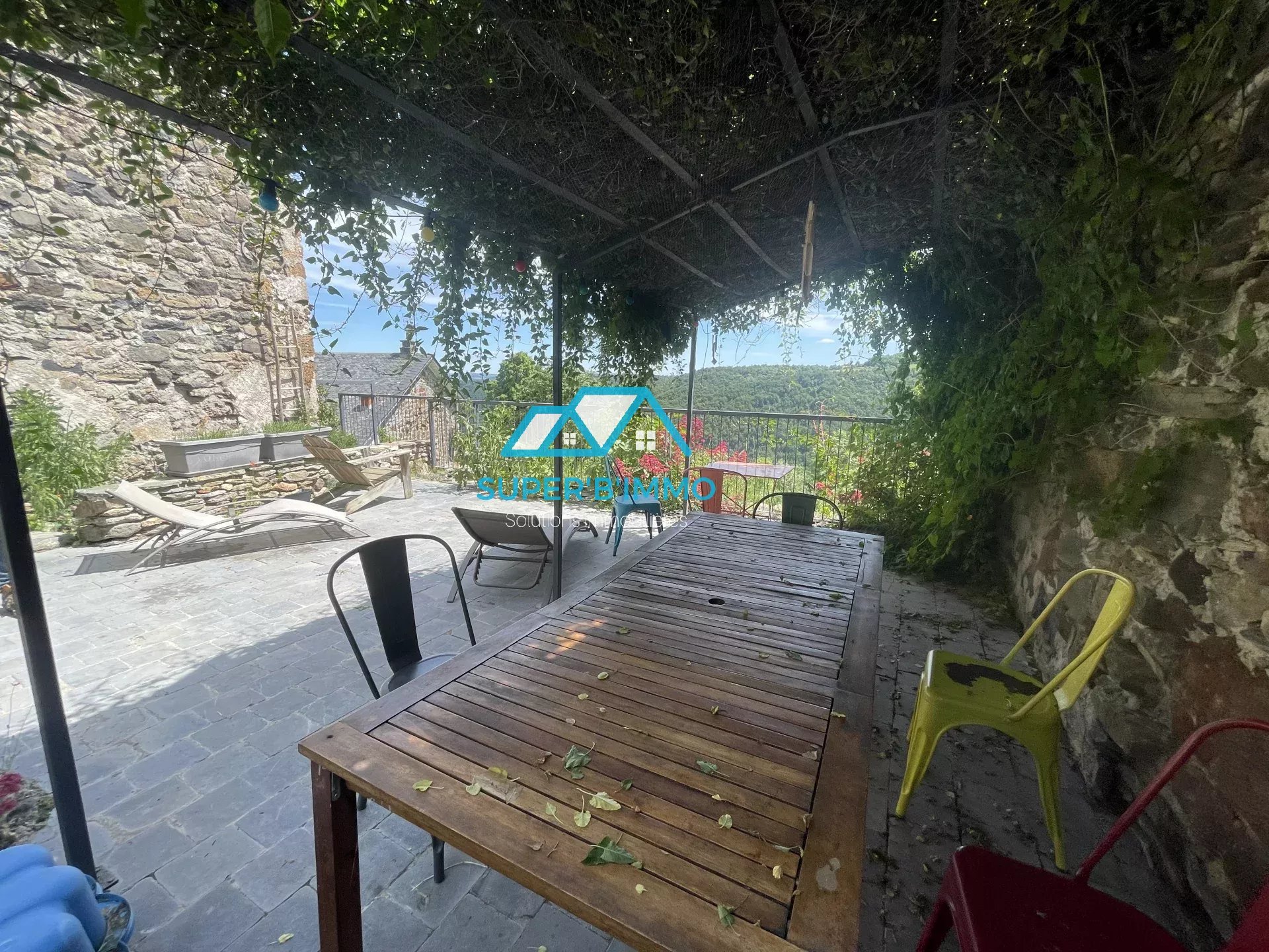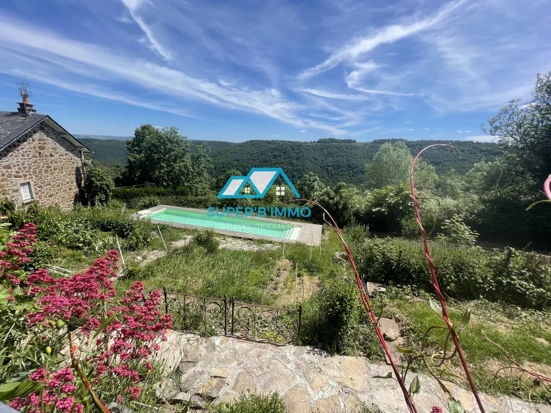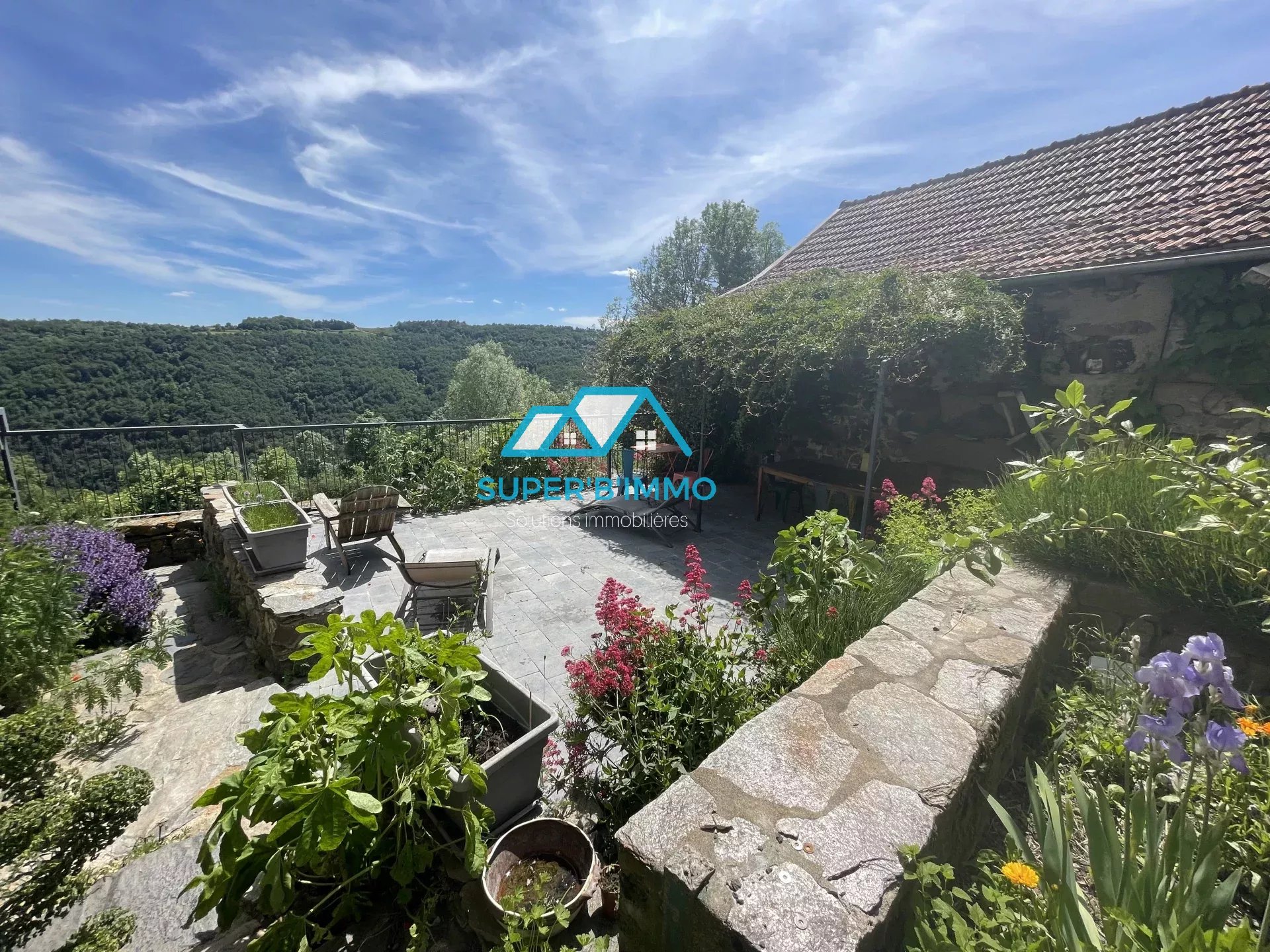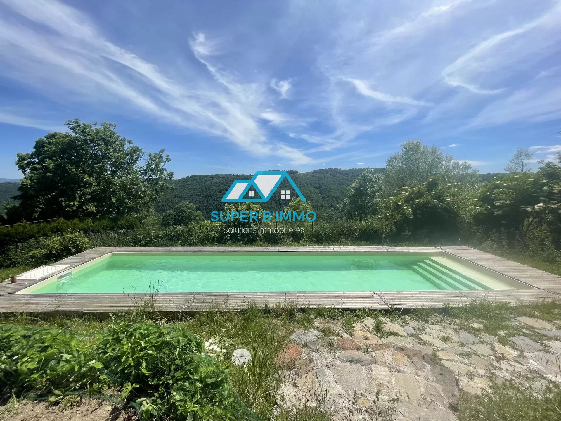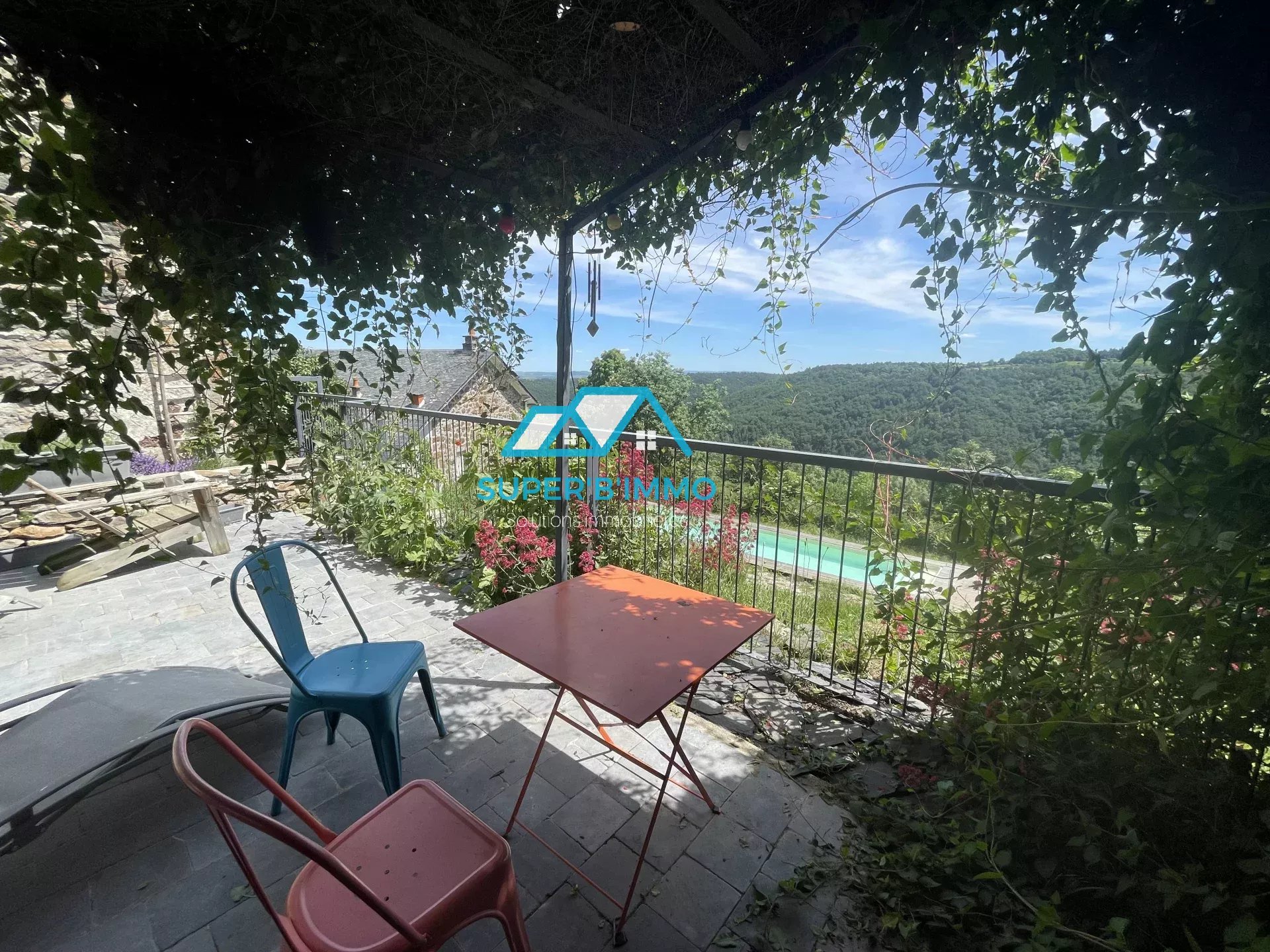 Terrasse surplombant la piscine en couloir de nage et terraina avec potager.