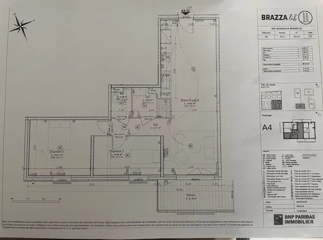 Disponible immédiatement. "Résidence Brazza Lib" située 15 sente Yvette Horner à Bordeaux 33100. Bel appartement neuf T3 de 69,75m² se composant d'une entrée sur pièce de vie, une cuisine aménagée/ équipée (plaque et hotte), une pièce de vie donnant sur un balcon de 9,19m², 2 chambres, une salle d'eau et un wc séparé. L'appartement est chauffé par un chauffage Urbain qui est compris dans les charges. Une place de parking privative couverte.
