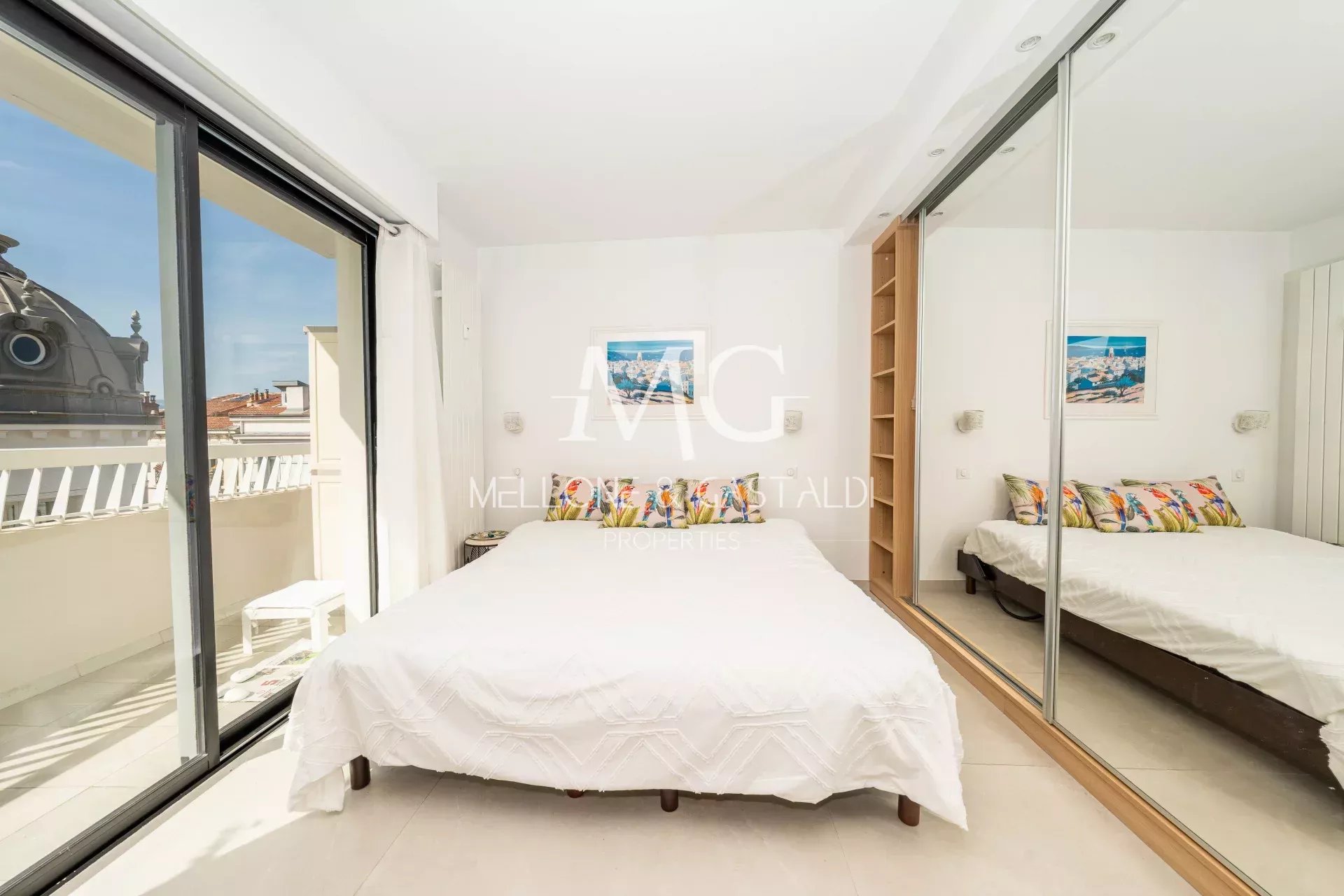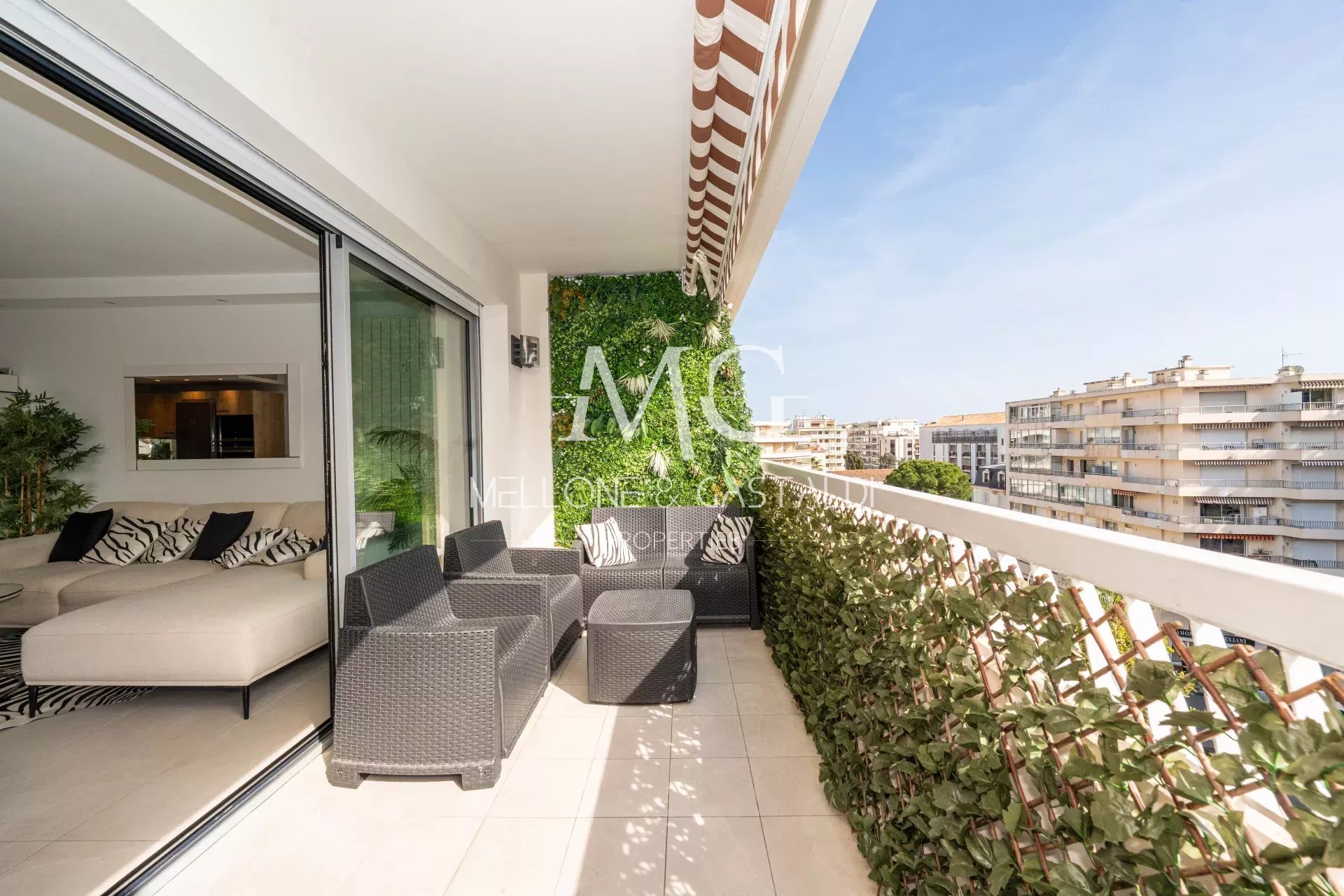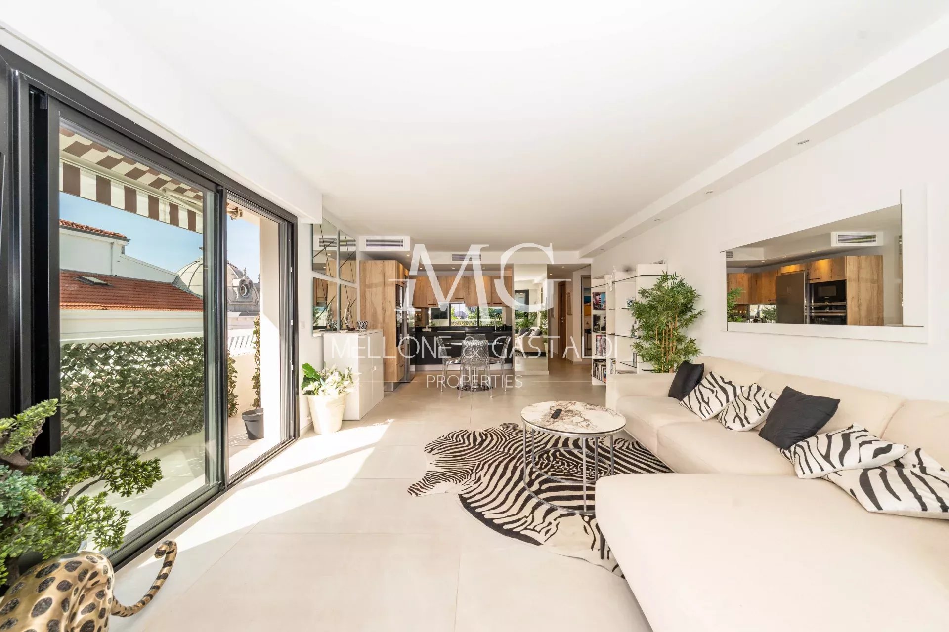 Idéalement situé en plein centre de Cannes, à deux pas de la rue d’Antibes et du Marriott, ce magnifique appartement traversant se trouve au sein d’une résidence de standing, en avant-dernier étage D’une surface habitable de 79,12 m² (74,33m² Loi Carrez), il offre de beaux volumes et un agencement optimisé. L’entrée mène à un vaste séjour lumineux avec une cuisine contemporaine entièrement équipée. Deux belles chambres en suite viennent compléter ce bien : l’une avec salle de douche, l’autre avec salle de bain et WC. Un WC invité est également présent La terrasse d’angle, baignée de soleil, permet de profiter d’une vue dégagée sur la ville Entièrement rénové avec goût, cet appartement lumineux et confortable vous séduira par sa situation exceptionnelle et la qualité de ses prestations. Restaurants, plages, commerces et animations sont accessibles à pied Un garage au sein de la résidence est disponible en option
