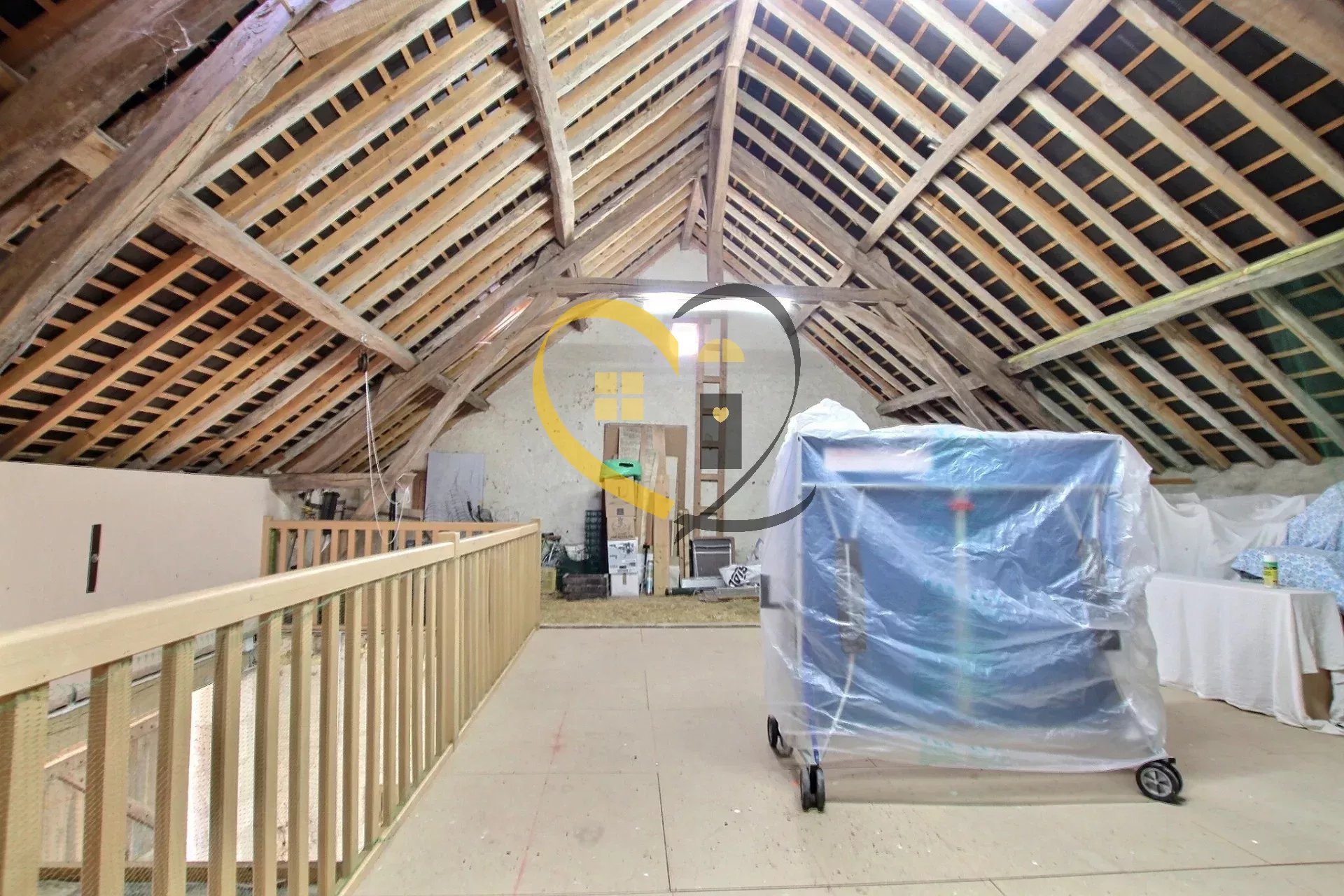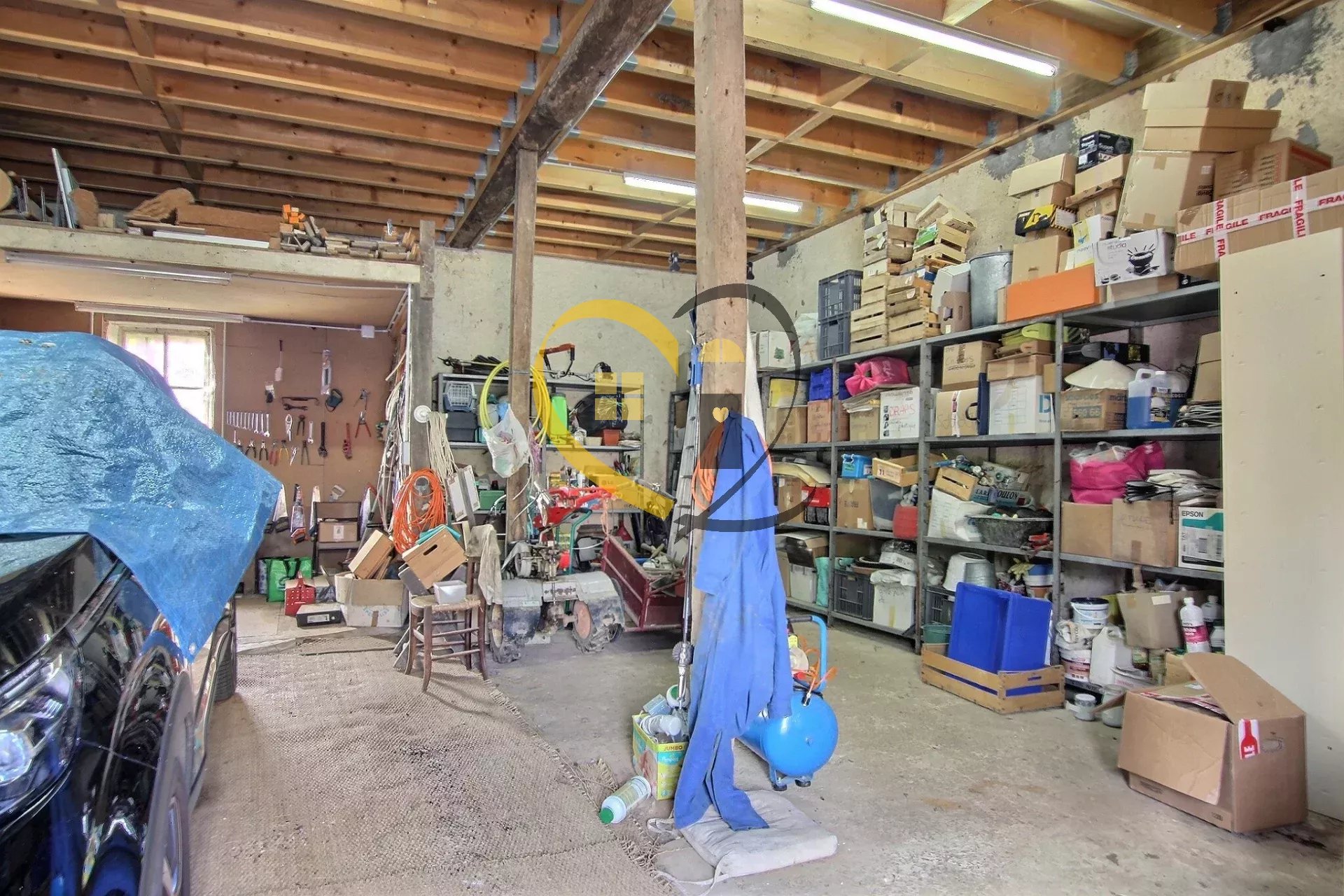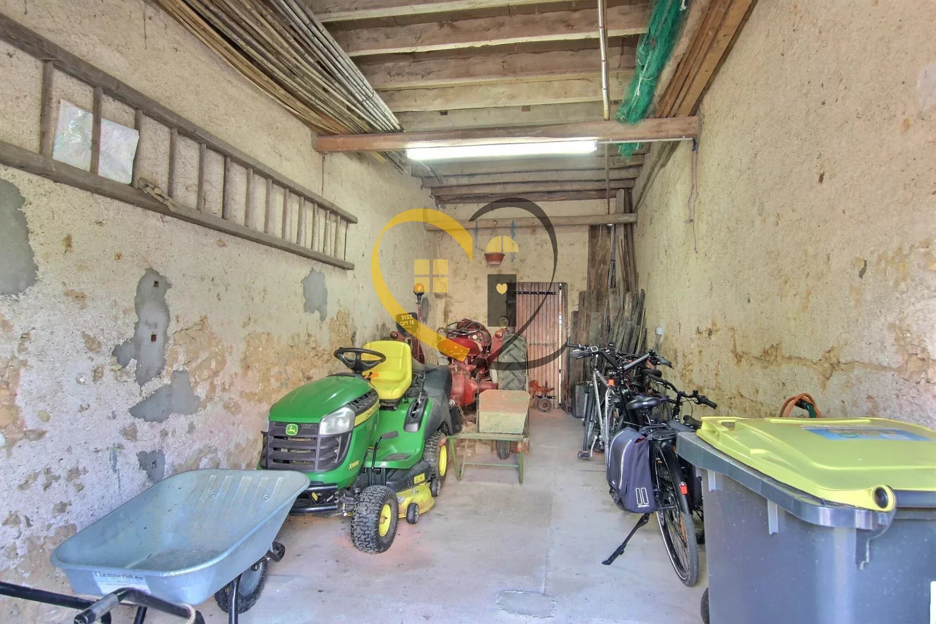 Une grange (110m²) sur deux niveaux proposant au rez-de-chaussée un espace de rangement et un espace garage/atelier, l’étage offre un espace aménagé en salle de jeux.