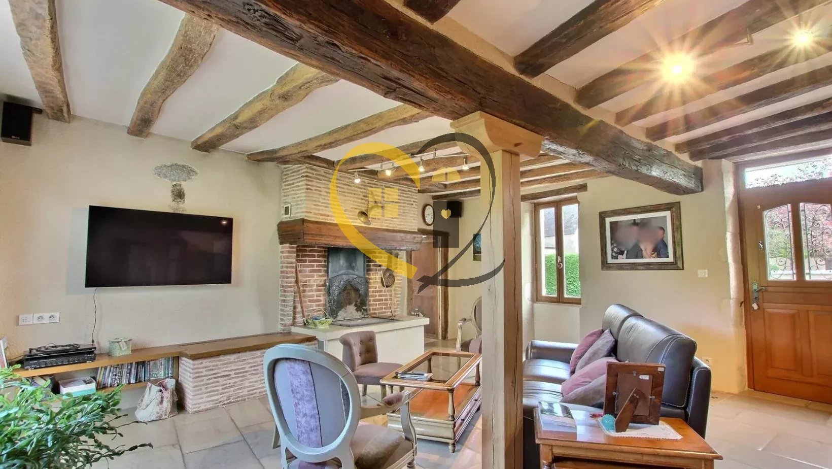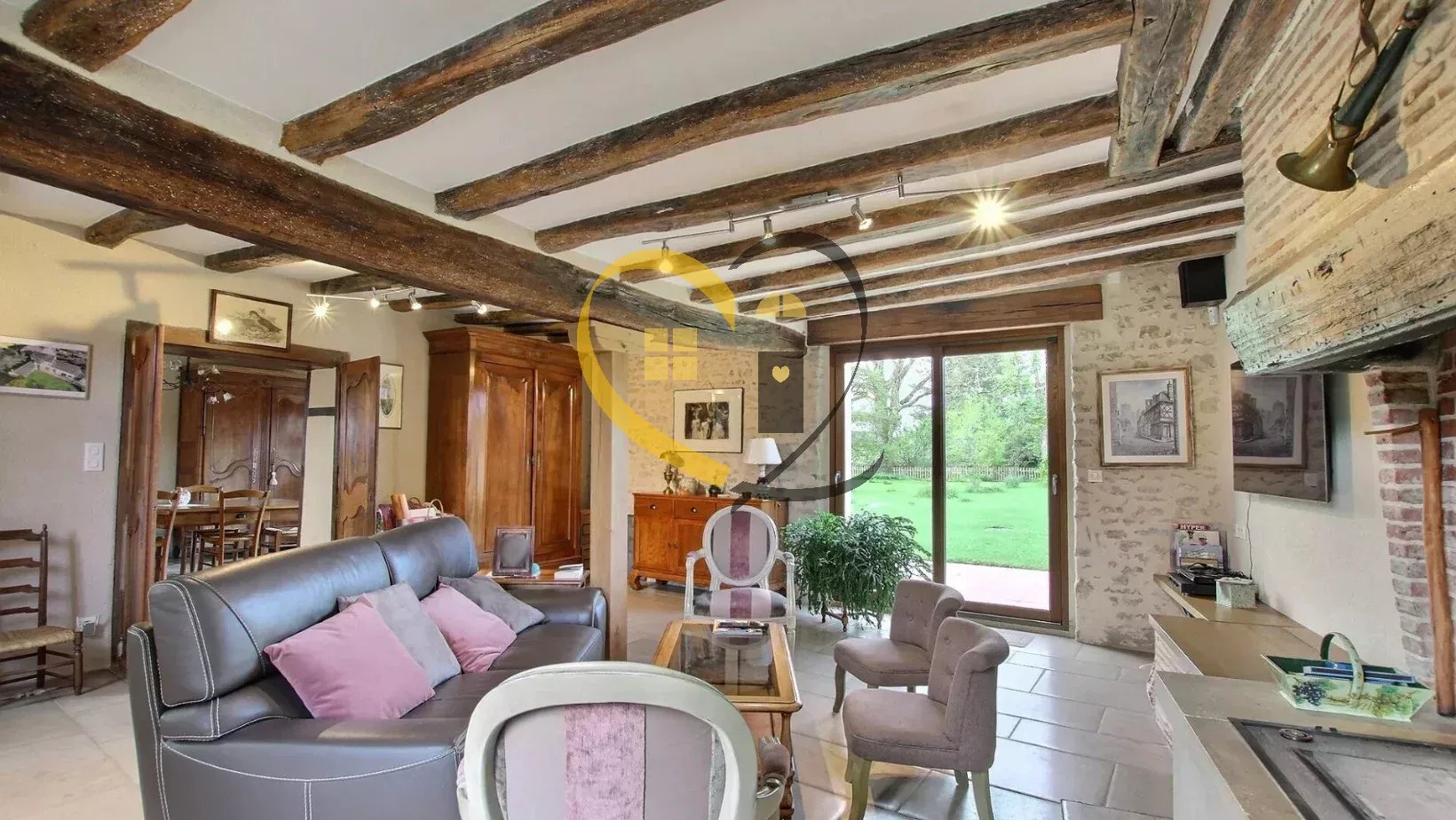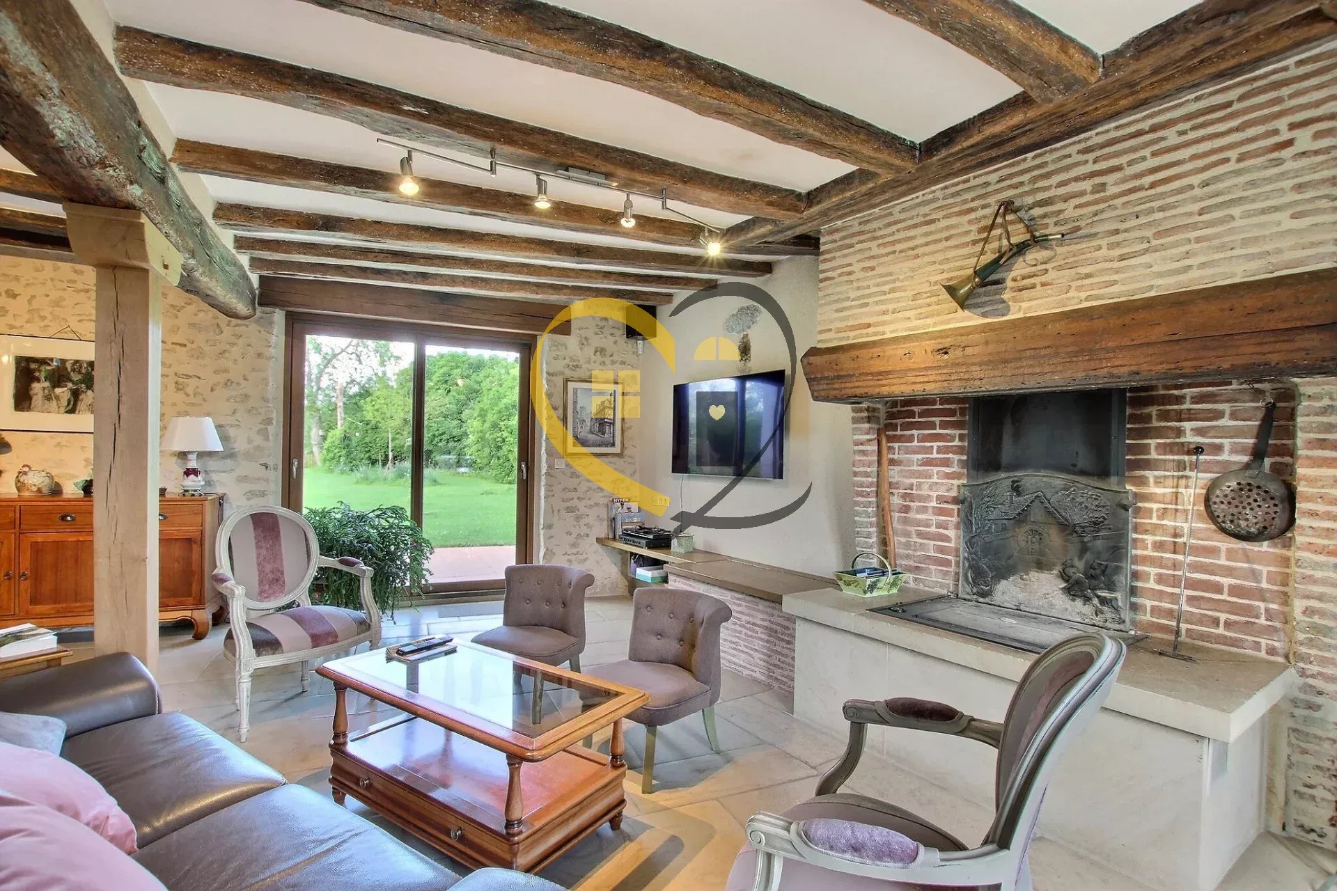 - Salon (33 m²) baigné de lumière, ouvert sur l’extérieur avec un sol en pierre naturelle de Bourgogne, cheminée « polyflam system ».
