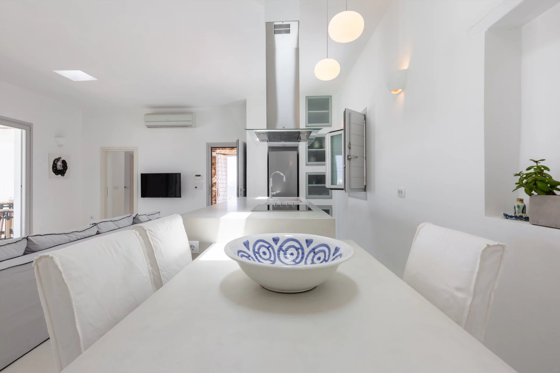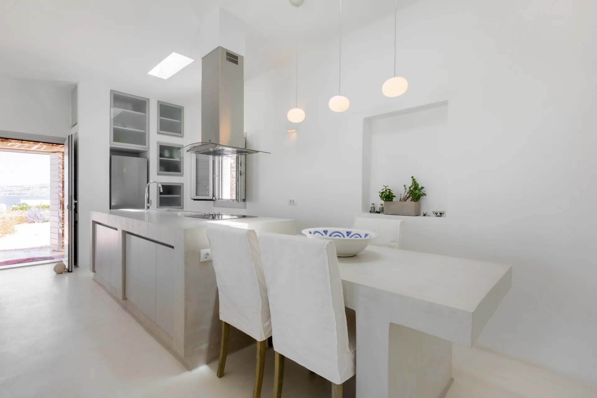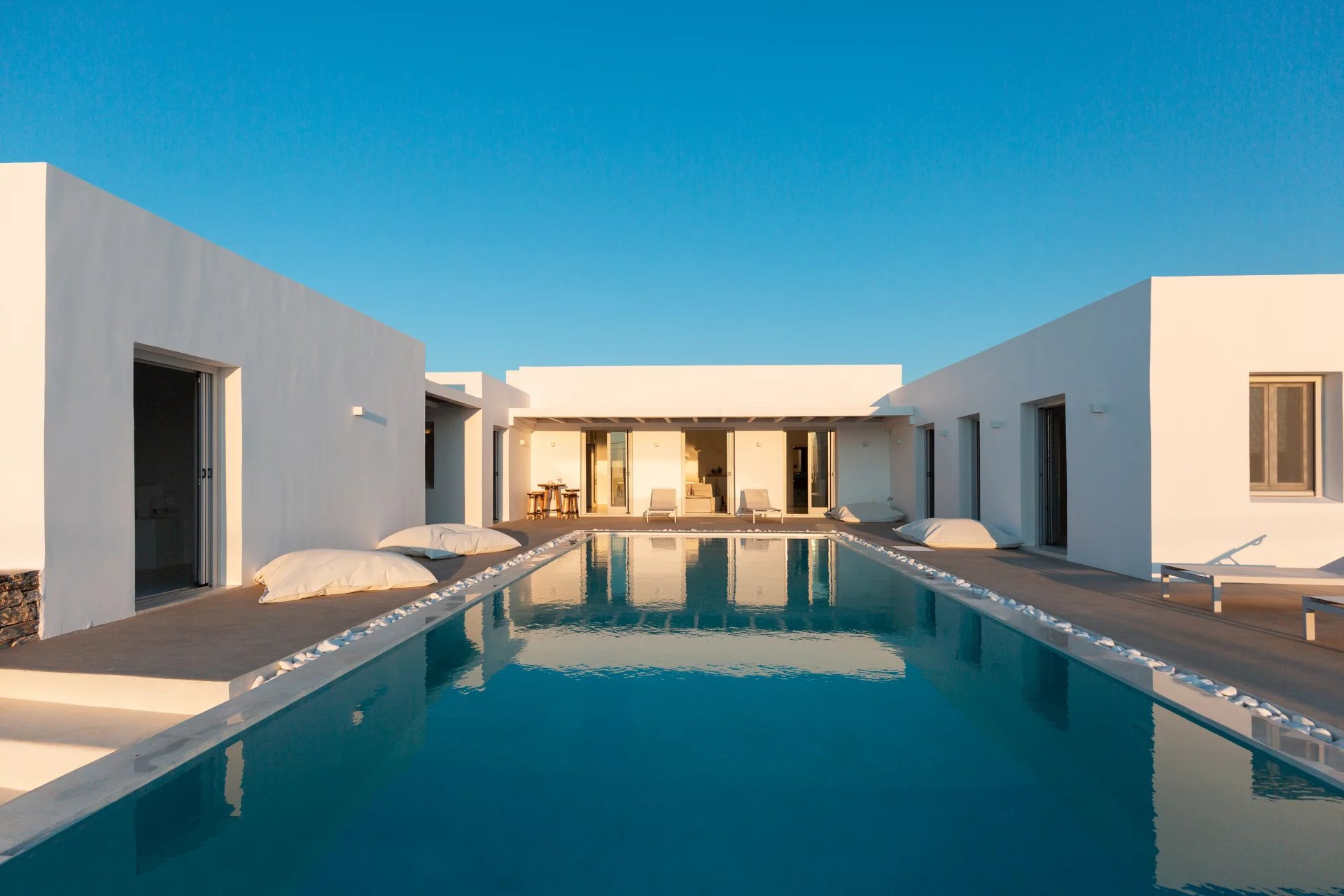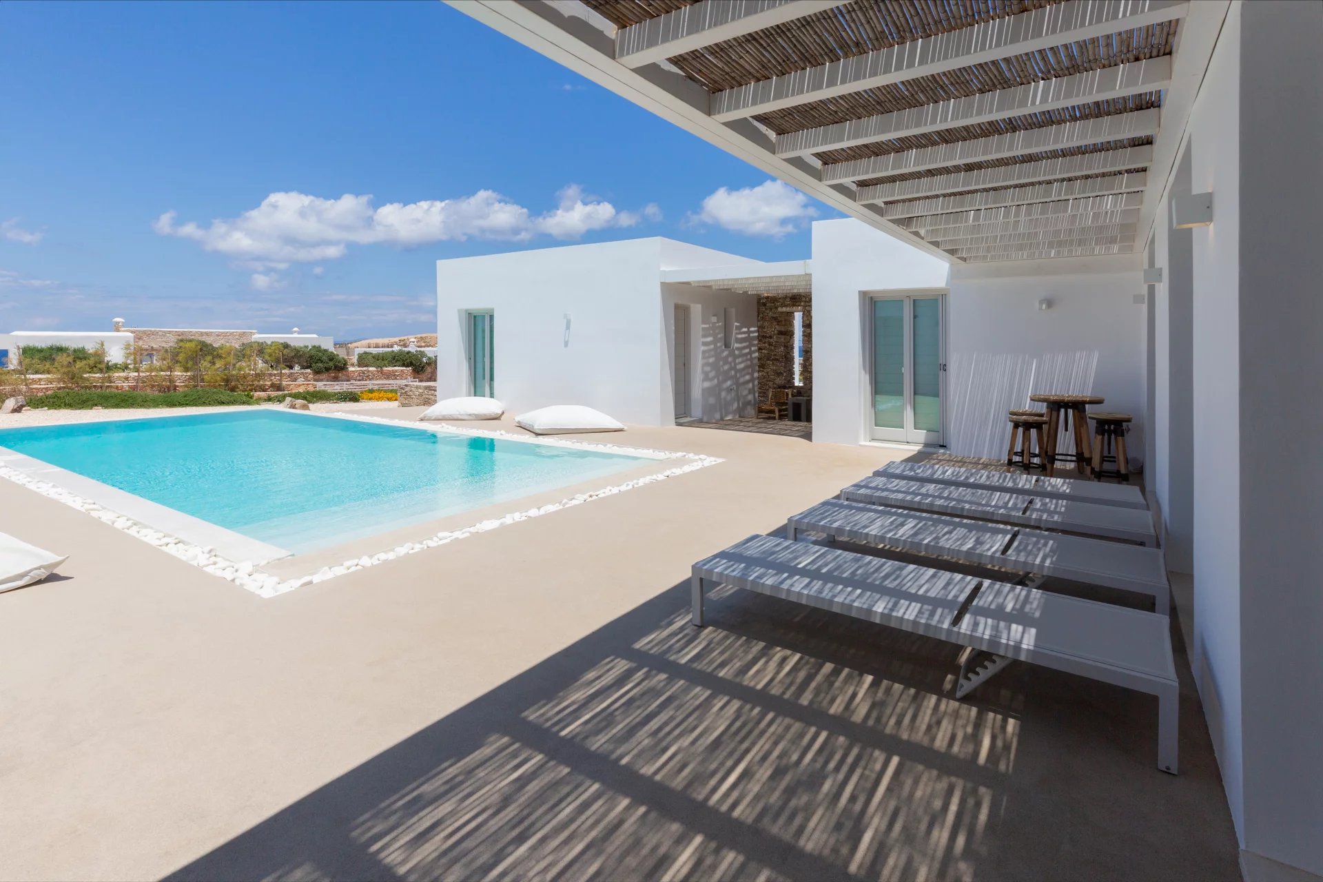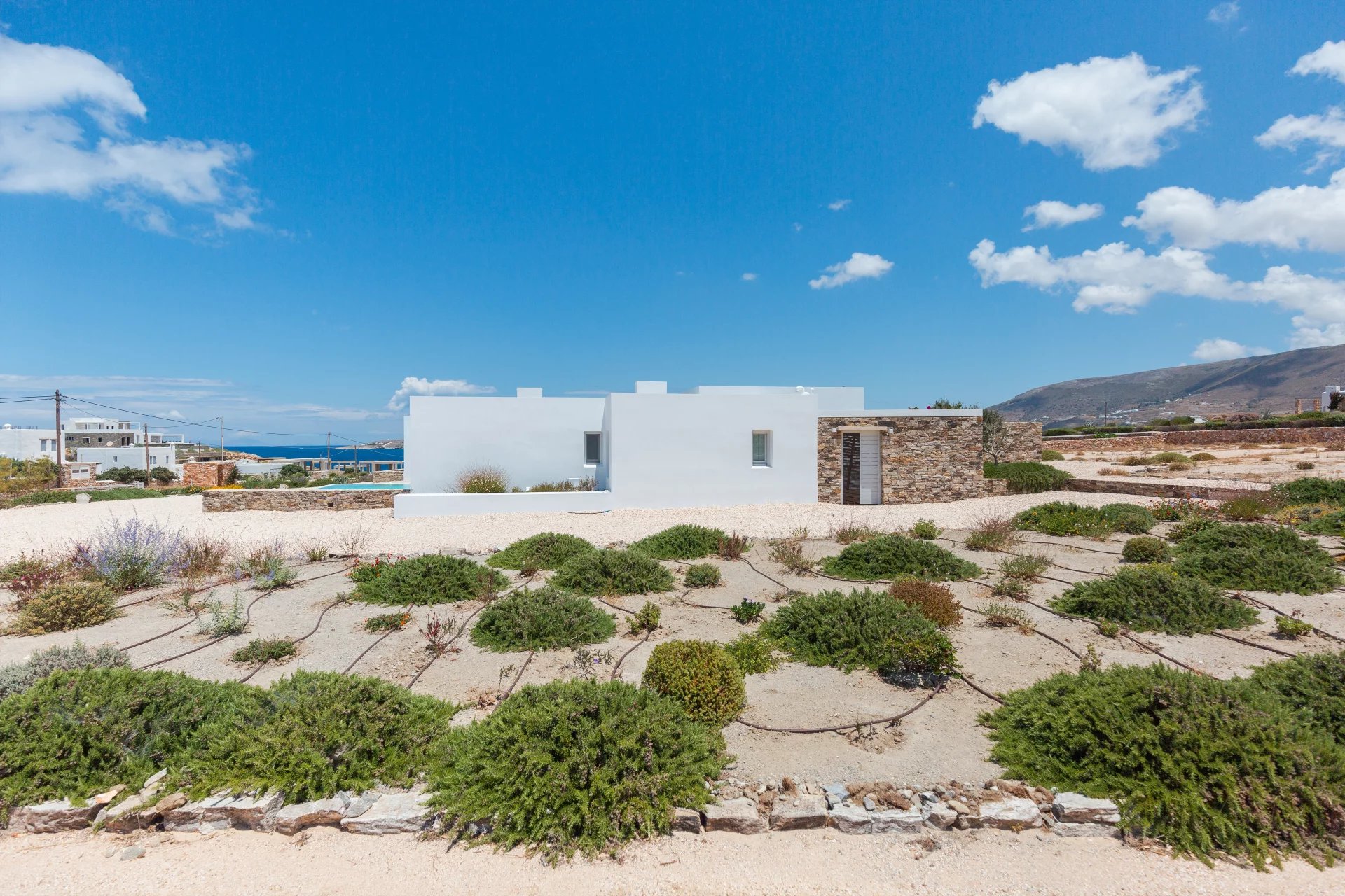 Évadez-vous dans une villa cycladique moderne, un paradis paisible situé à seulement 5 km de la capitale animée de l'île et à quelques minutes de la célèbre plage de Parasporos. Idéalement positionnée pour capturer des couchers de soleil à couper le souffle sur la mer, cette demeure luxueuse est conçue pour des vacances inoubliables.