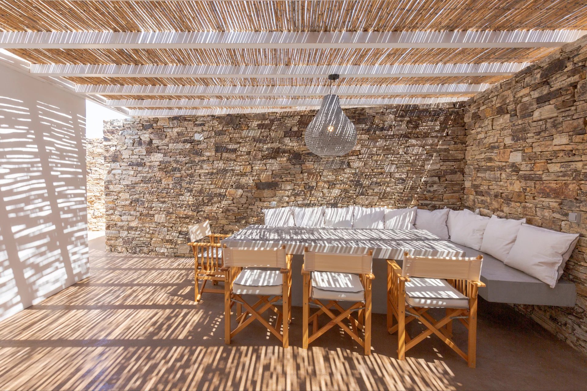 - Salle à manger d’été – abritée par une pergola et des murs en pierre, idéale pour des dîners en plein air inoubliables