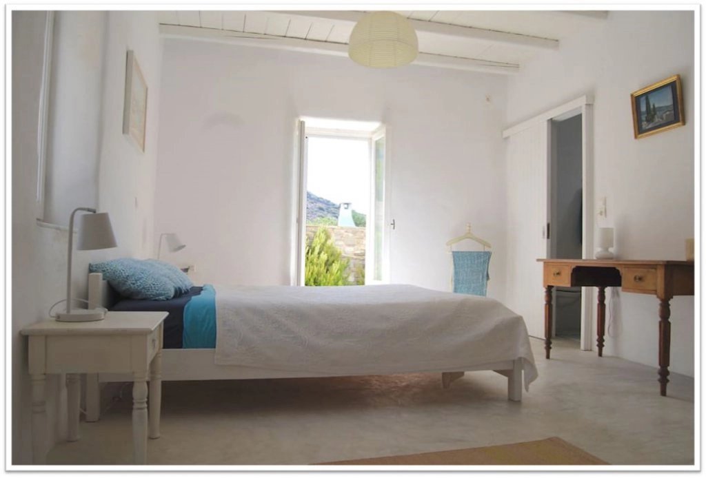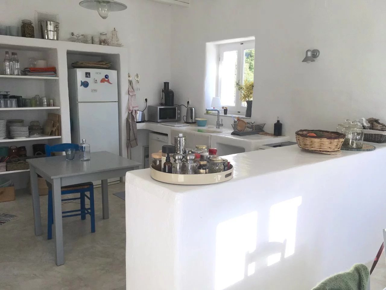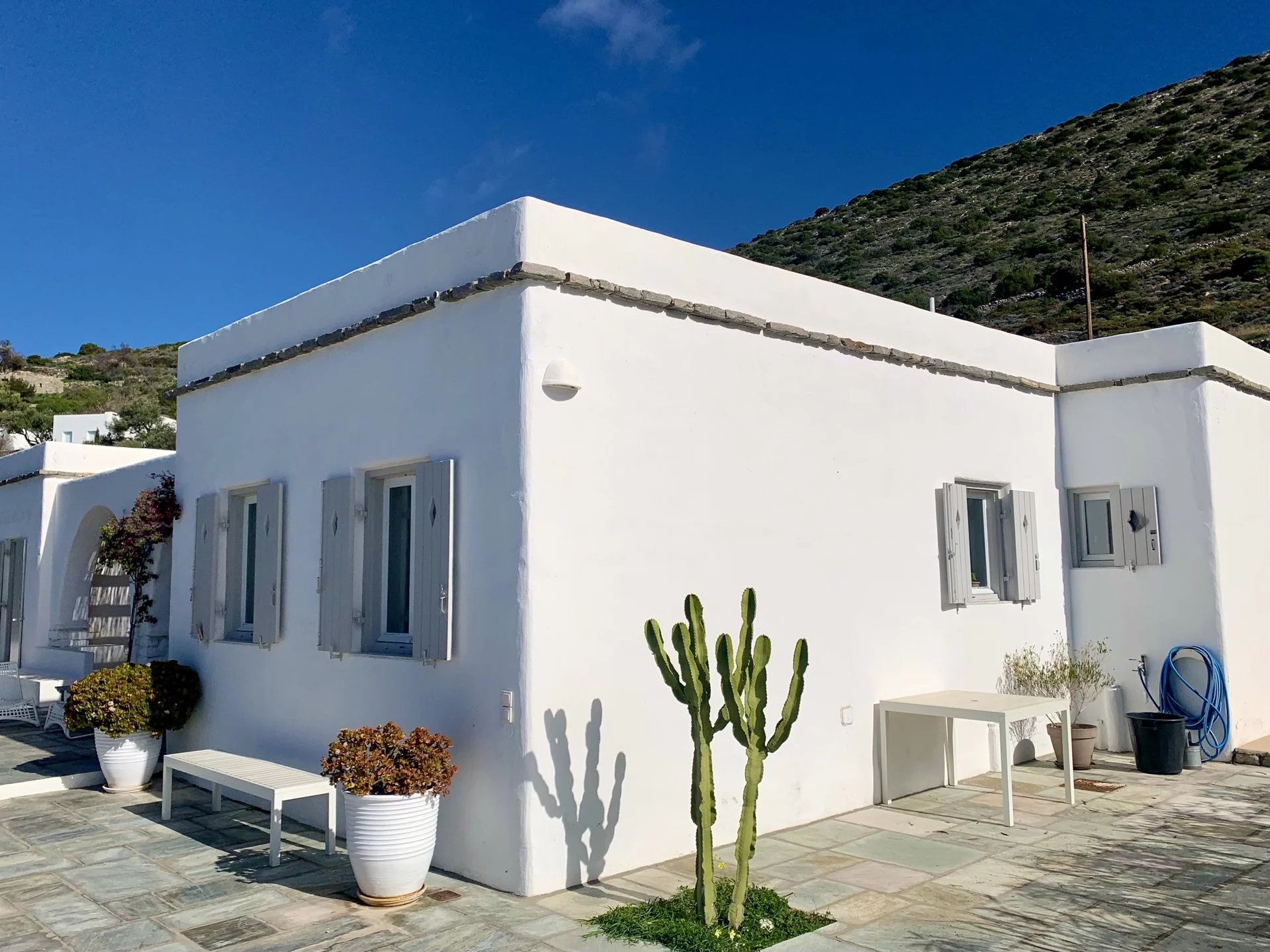 Située au sud de l'île à Kamari, jolie maison cycladique de plain pied avec une très belle vue mer, au calme absolu, en pleine nature. A 2 km du village de pêcheurs et des plages d'Aliki. Maison idéale pour 4 à 7 personnes. Elle se compose d'un séjour avec cheminée, une cuisine familiale, une chambre double avec sa salle de douche + wc, une seconde chambre double et une chambre triple (trois lits simples), 1 salle de douche + wc. Belles et grandes terrasses, une cuisine d'été avec BBQ. Tarif Location (frais de ménage inclus) De 2 395 € à 3 195 € la semaine selon la saison TTC Numéro d'enregistrement : 0145035