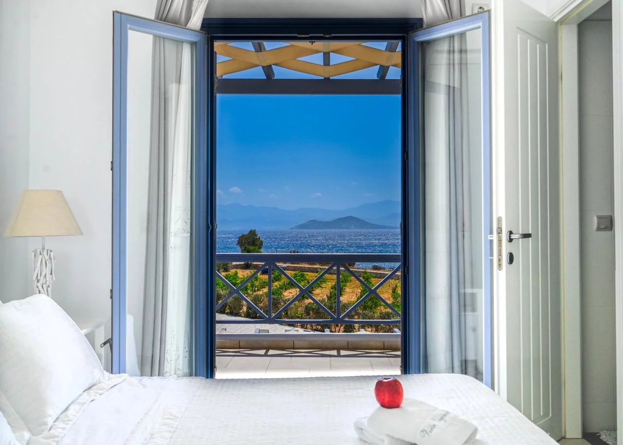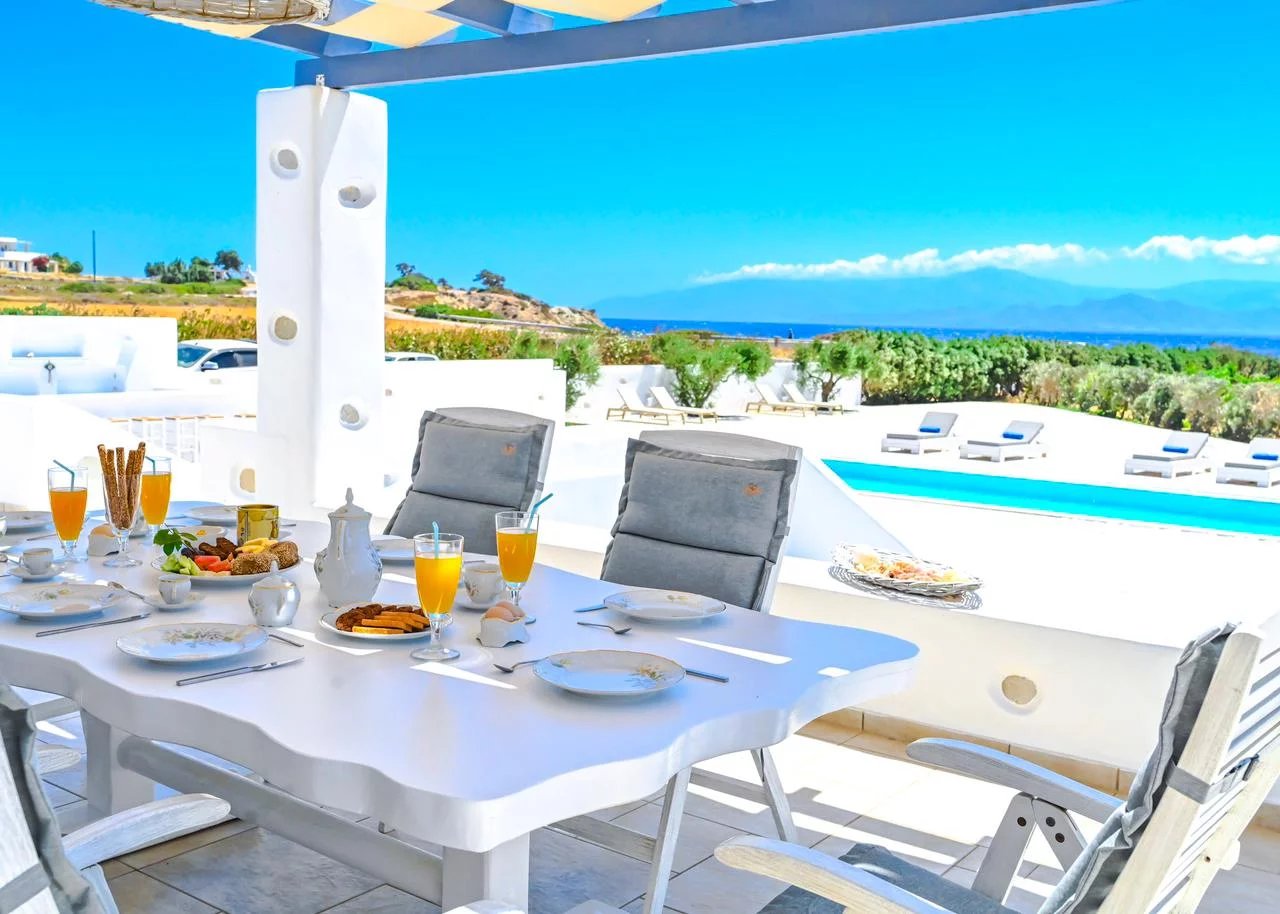 Face à une petite baie et à sa plage de sable, cette maison spacieuse et confortable jouit d'une vue sur la mer et l'île voisine de Naxos.