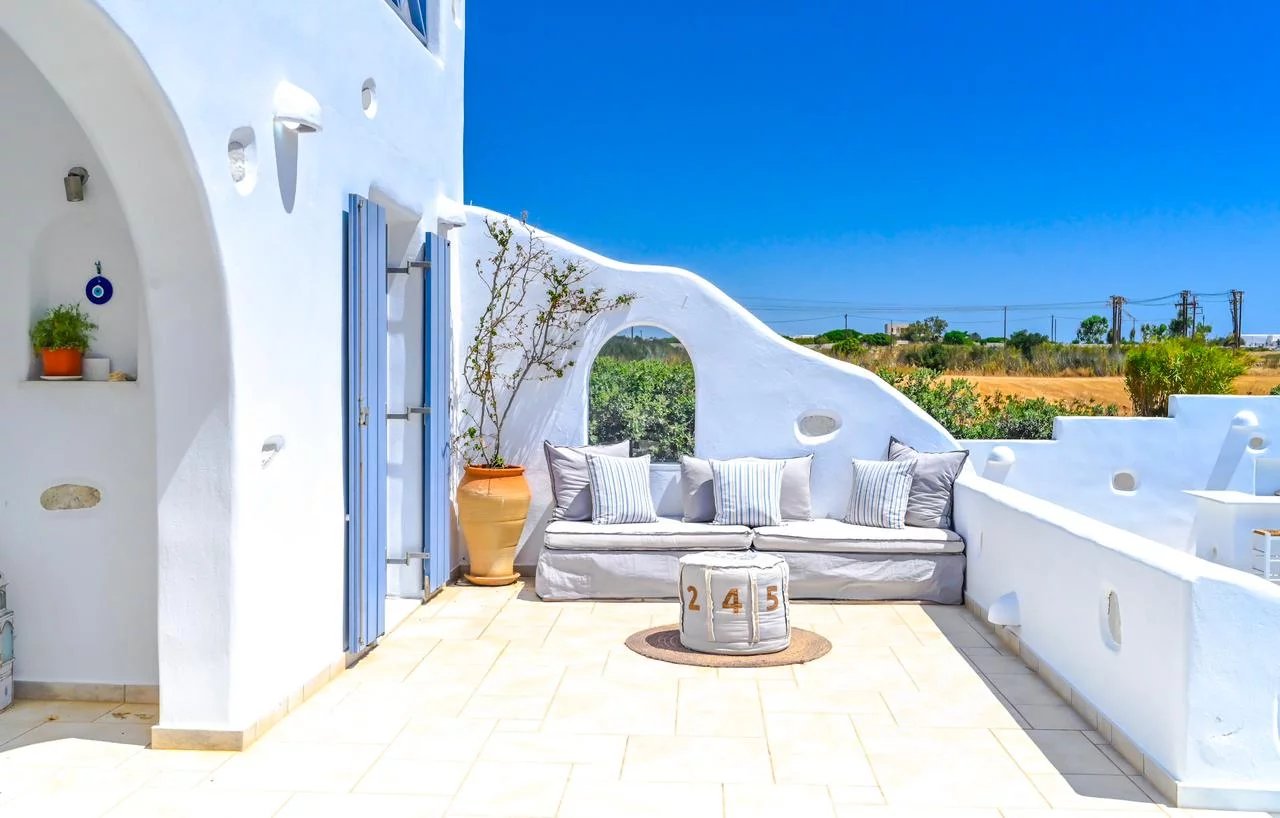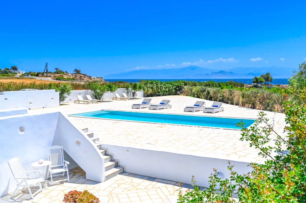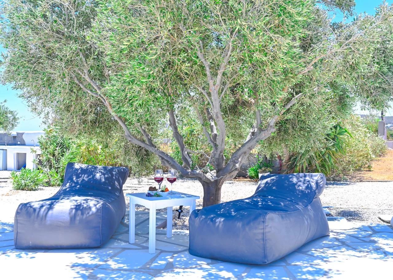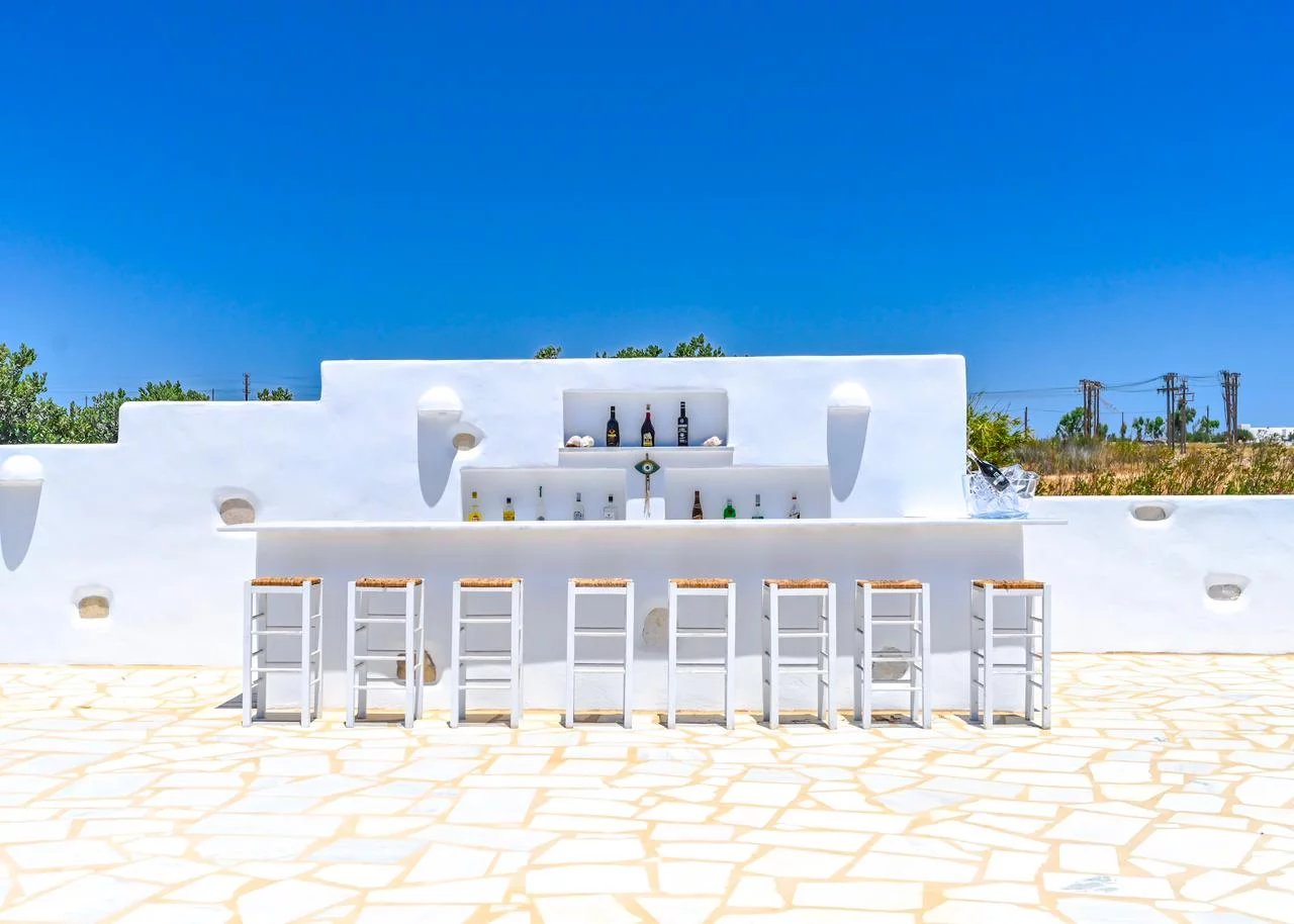 Au nord-est de Paros, à seulement 3 km du village cosmopolite de Naoussa et à quelques minutes à pied du port de pêche d'Ambelas, de ses plages et de ses tavernes, cette villa entourée d'un grand jardin est située en retrait d'une route tranquille.