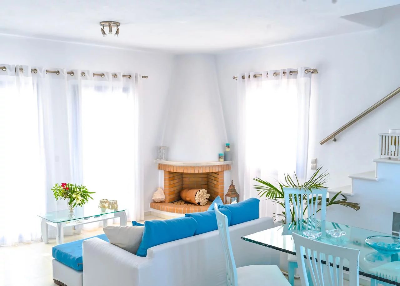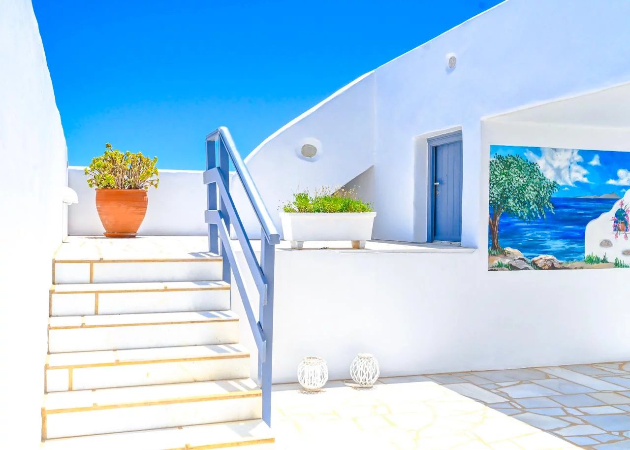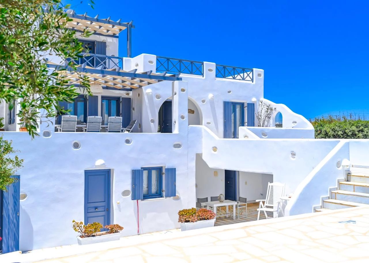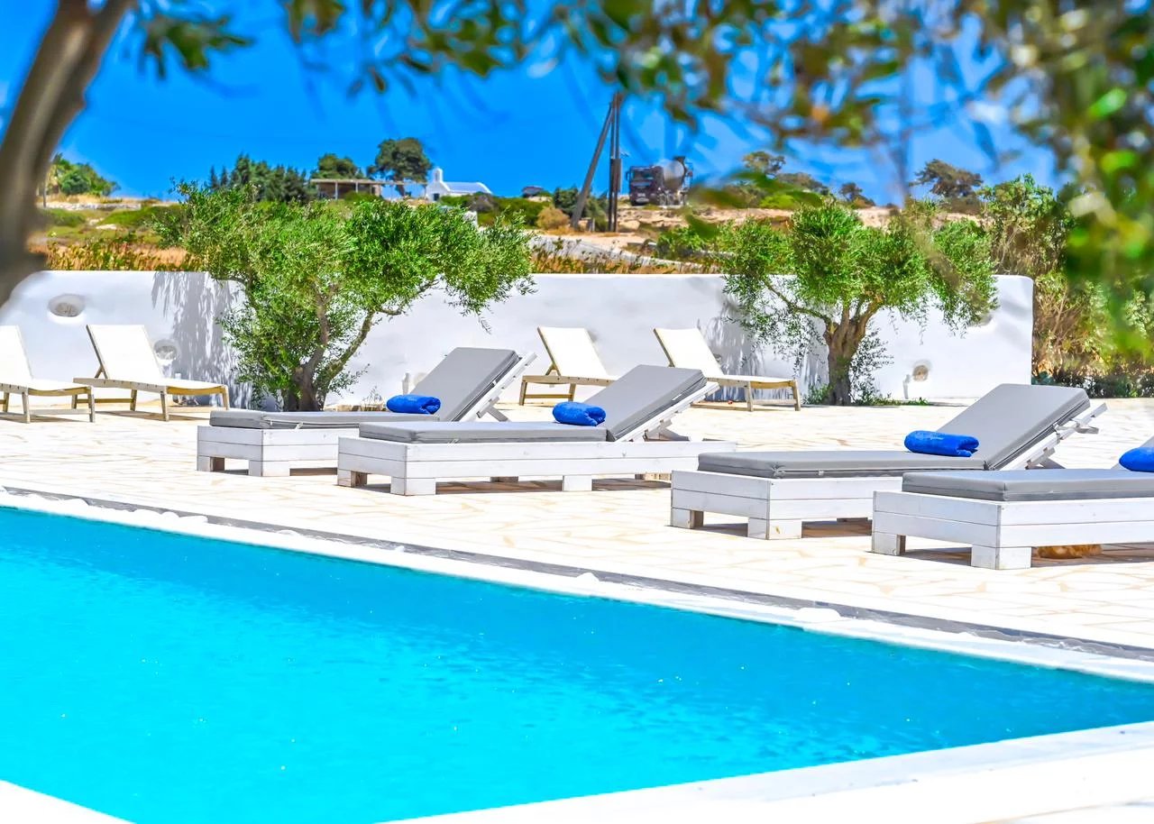 Au nord-est de Paros, à seulement 3 km du village cosmopolite de Naoussa et à quelques minutes à pied du port de pêche d'Ambelas, de ses plages et de ses tavernes, cette villa entourée d'un grand jardin est située en retrait d'une route tranquille.