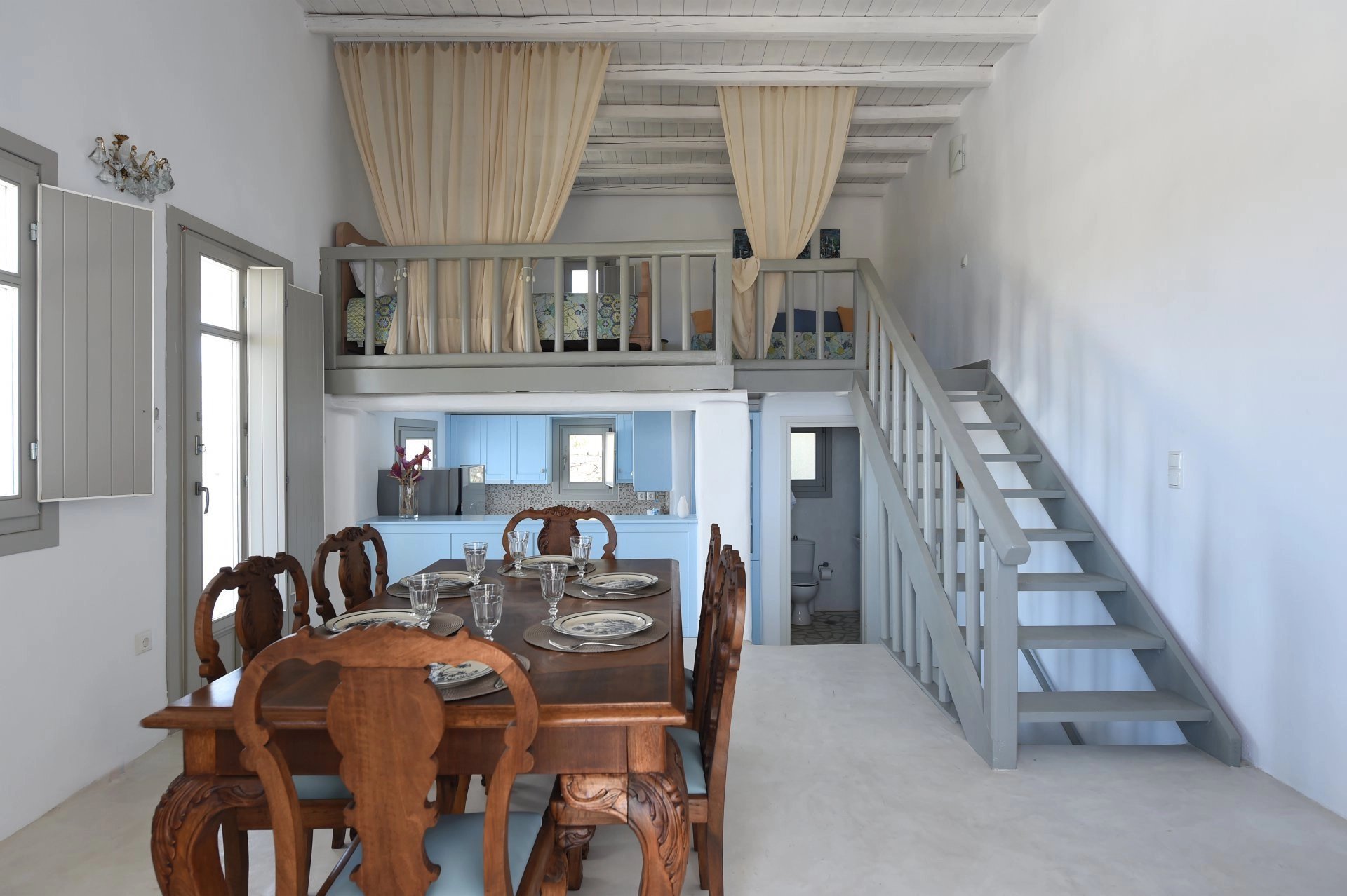 La maison de style traditionnel comprend un séjour avec cuisine ouverte entièrement équipée (réfrigérateur, plaques de cuisson, four, lave-vaisselle, bouilloire, toaster, machine à café), 3 chambres dont 1 en mezzanine, 2 salles de douche, 2 wc.