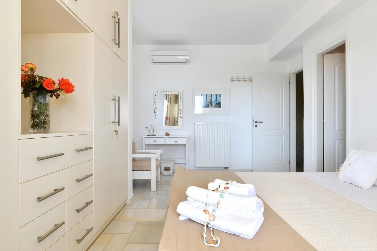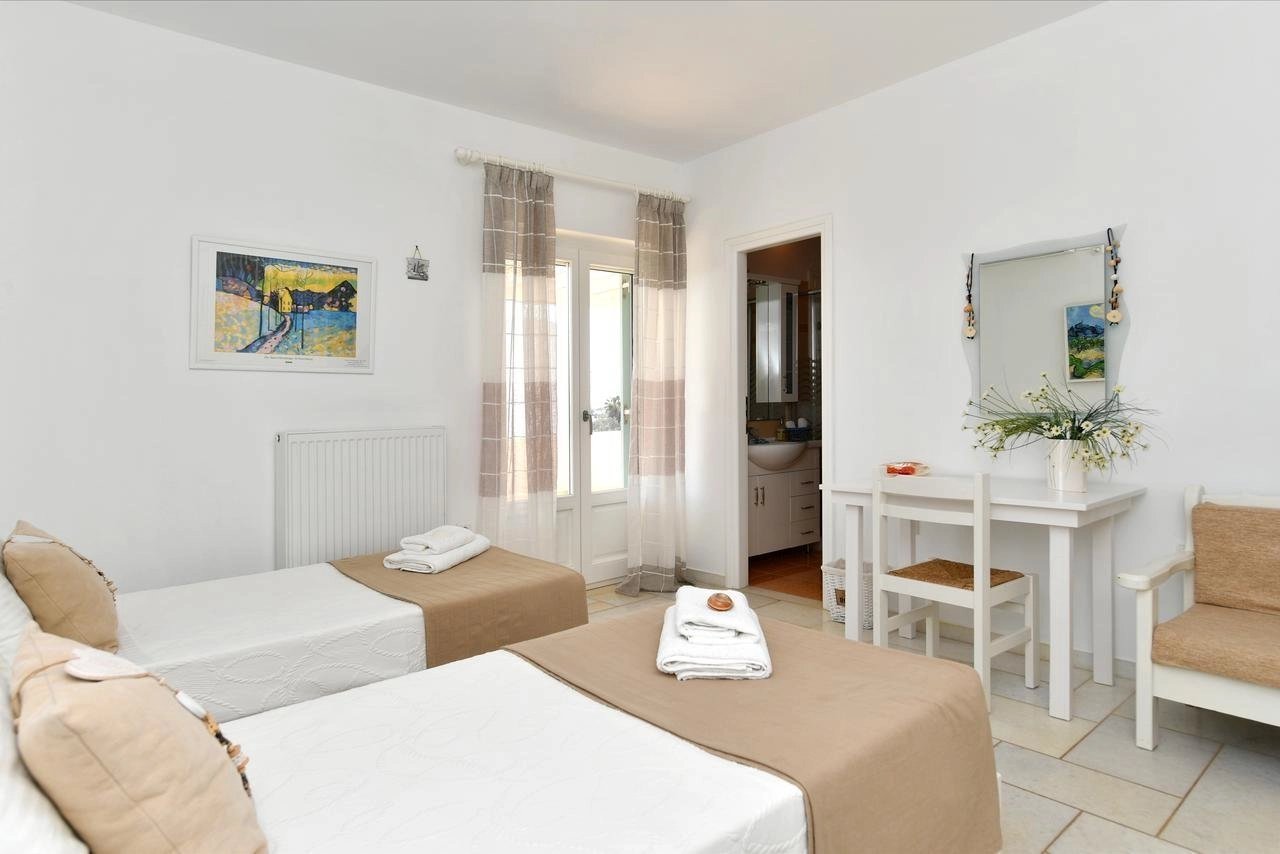 PISO ALIKI - Belle maison spacieuse, parfaitement entretenue, avec jardin et piscine. Très bien située, dans un environnement calme, à 500 mètres de la plage, des petites tavernes et des commerces du village de pêcheurs d'Aliki, la maison de 160 m2 peut accueillir 8 personnes. Elle se compose au rez-de-chaussée d'un séjour avec cheminée, une cuisine entièrement équipée (plaques, four, réfrigérateur, lave-vaisselle, lave-linge), une suite avec placards et salle de bain et wc. Toilettes séparés.