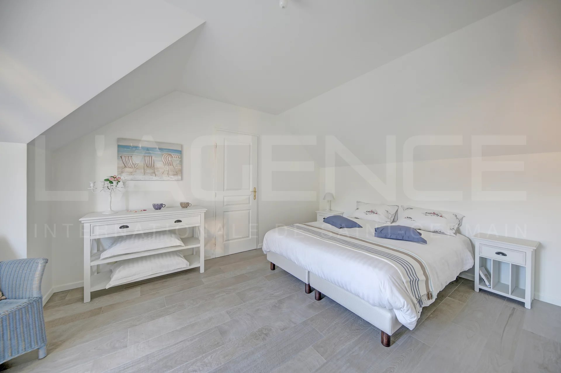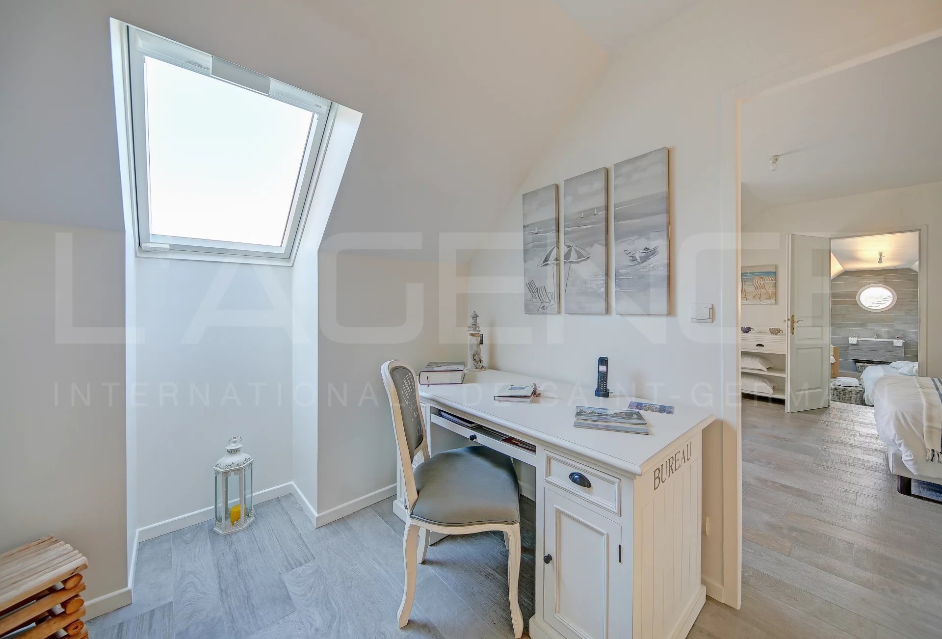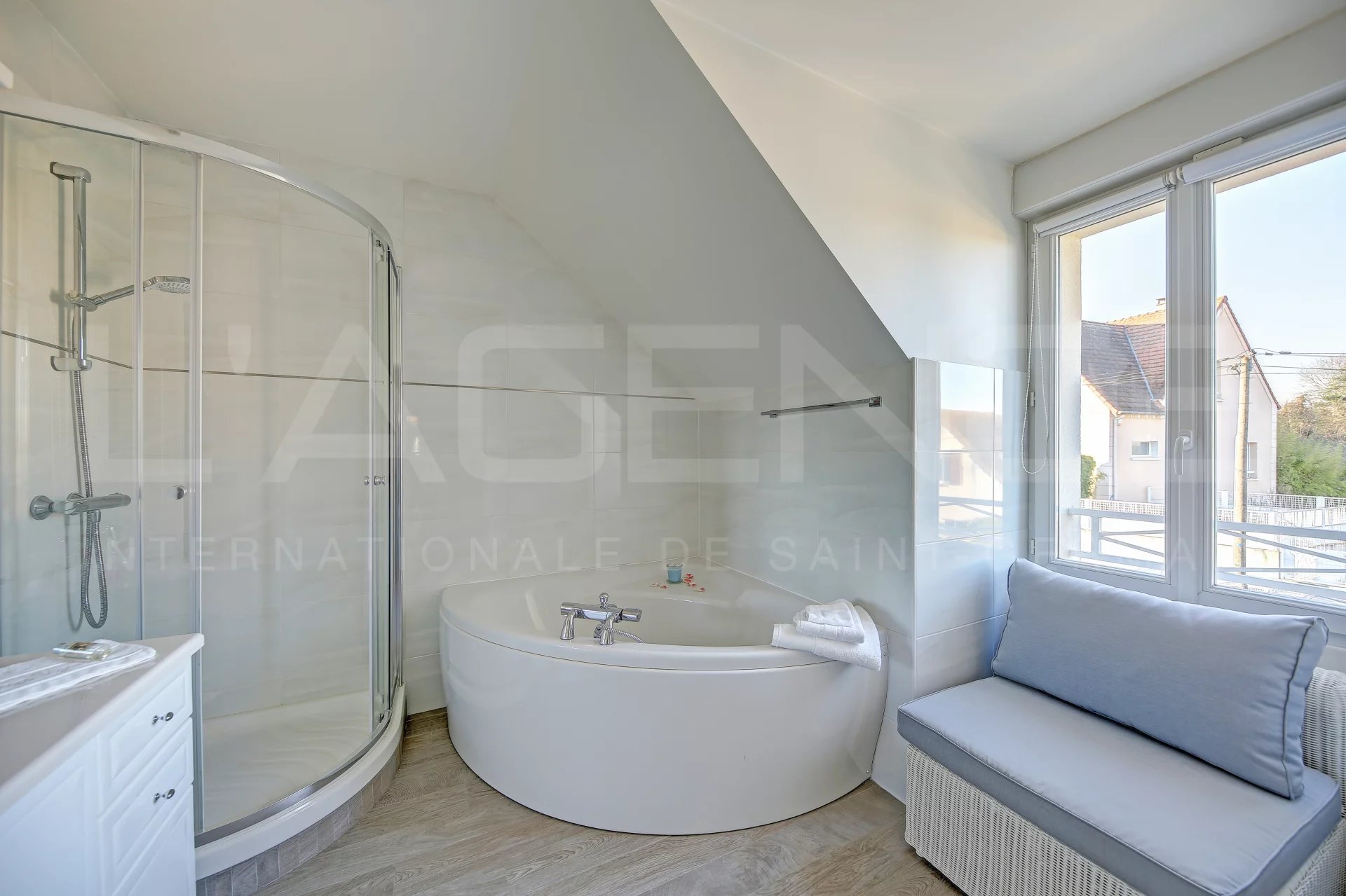 À l’étage : un palier aménagé en bureau, un couloir avec placards, 3 chambres (dont 2 en enfilade et une suite parentale avec salle de bain équipée d'une baignoire balnéo de marque "Jacuzzi" et un WC) et une autre salle de bains séparée (baignoire et douche).