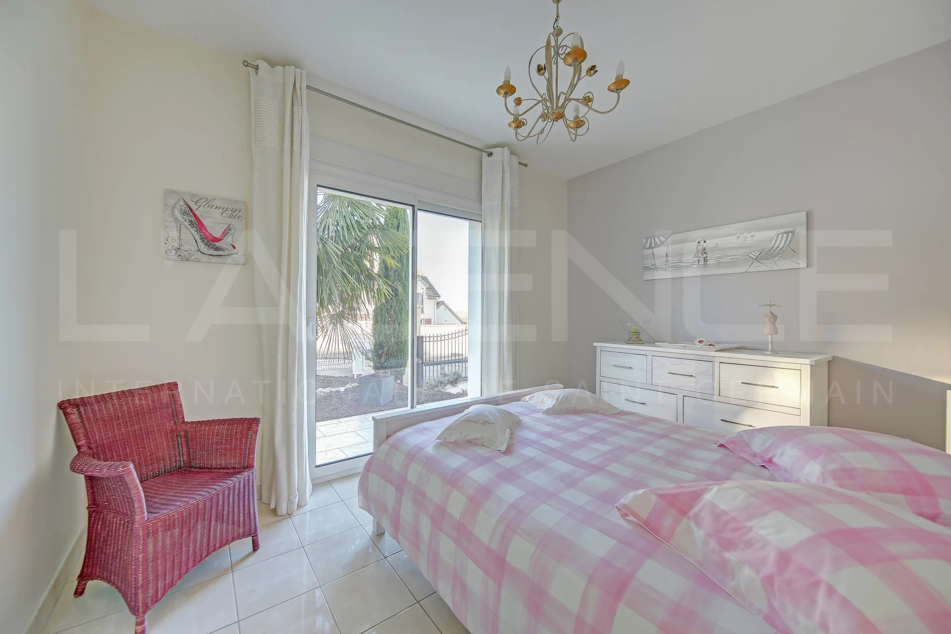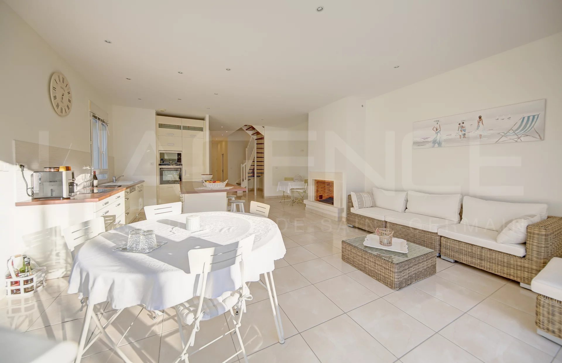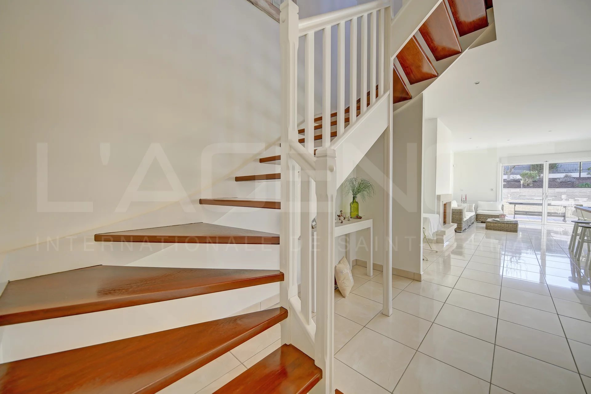 Au rez-de-chaussée : une entrée avec grand placard, une cuisine ouverte avec îlot central (de marque "Comera"), un salon très lumineux avec cheminée et accès direct à une terrasse et un petit espace paysagé (olivier, figuier, palmier...). Une chambre, une salle d’eau avec WC et un chauffage au sol complètent ce niveau.
