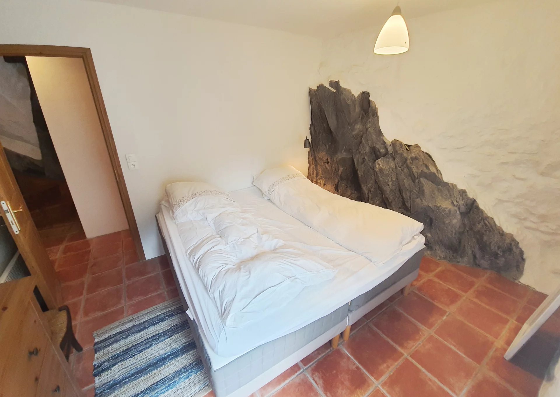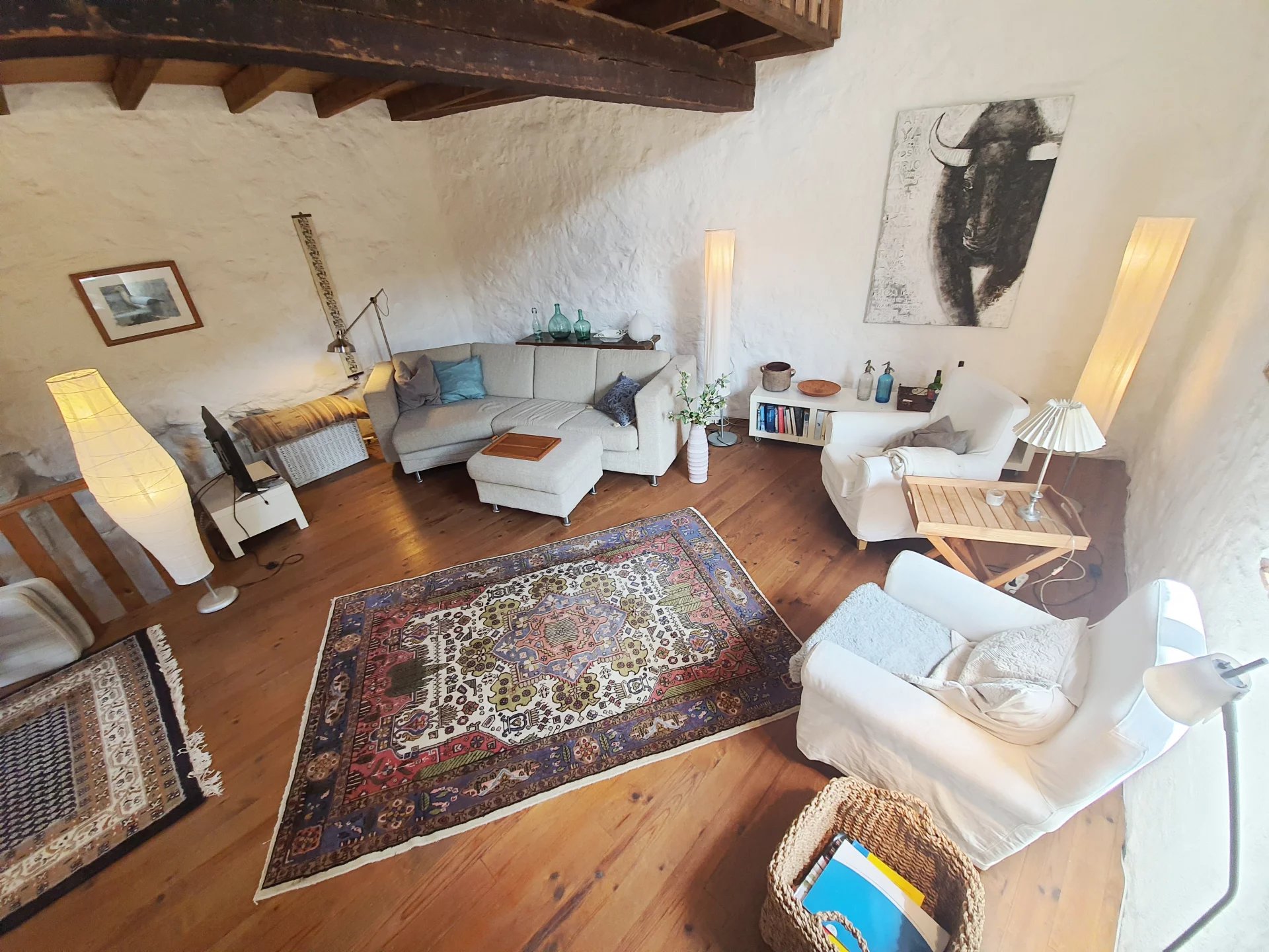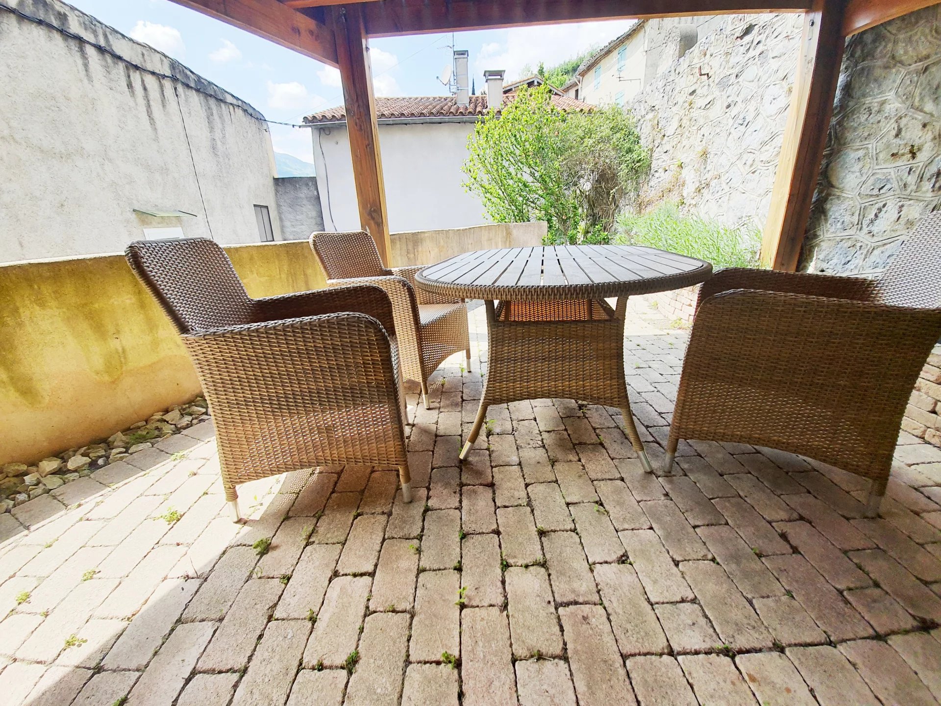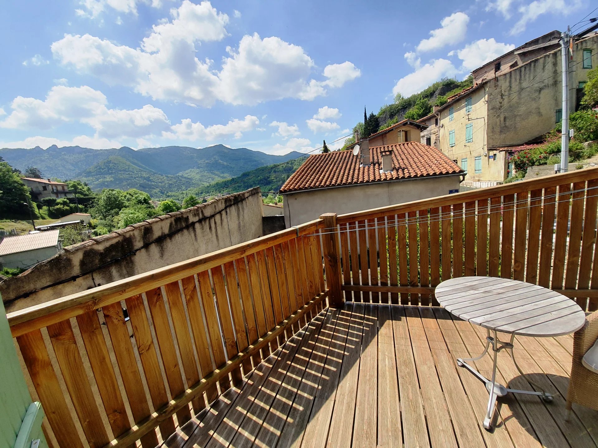 Grange en pierre convertie avec deux terrasses une avec vue panoramique sur les montagnes. Grand espace de vie lumineux Cuisine/salle à manger 23m² avec accès au terrasse . Séjour 37m², accès terrasse ombragée. 2 chambres, coin buanderie douche/WC Rénovation unique achevée en 2004 toutes commodités accessibles à pied.1h de la Méditerranée & 20 min. aussi la station de ski la plus proche. 2 aéroports à moins d'une heure de route.VIDEO DISPONIBLE