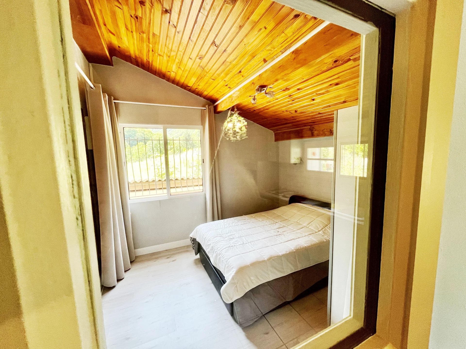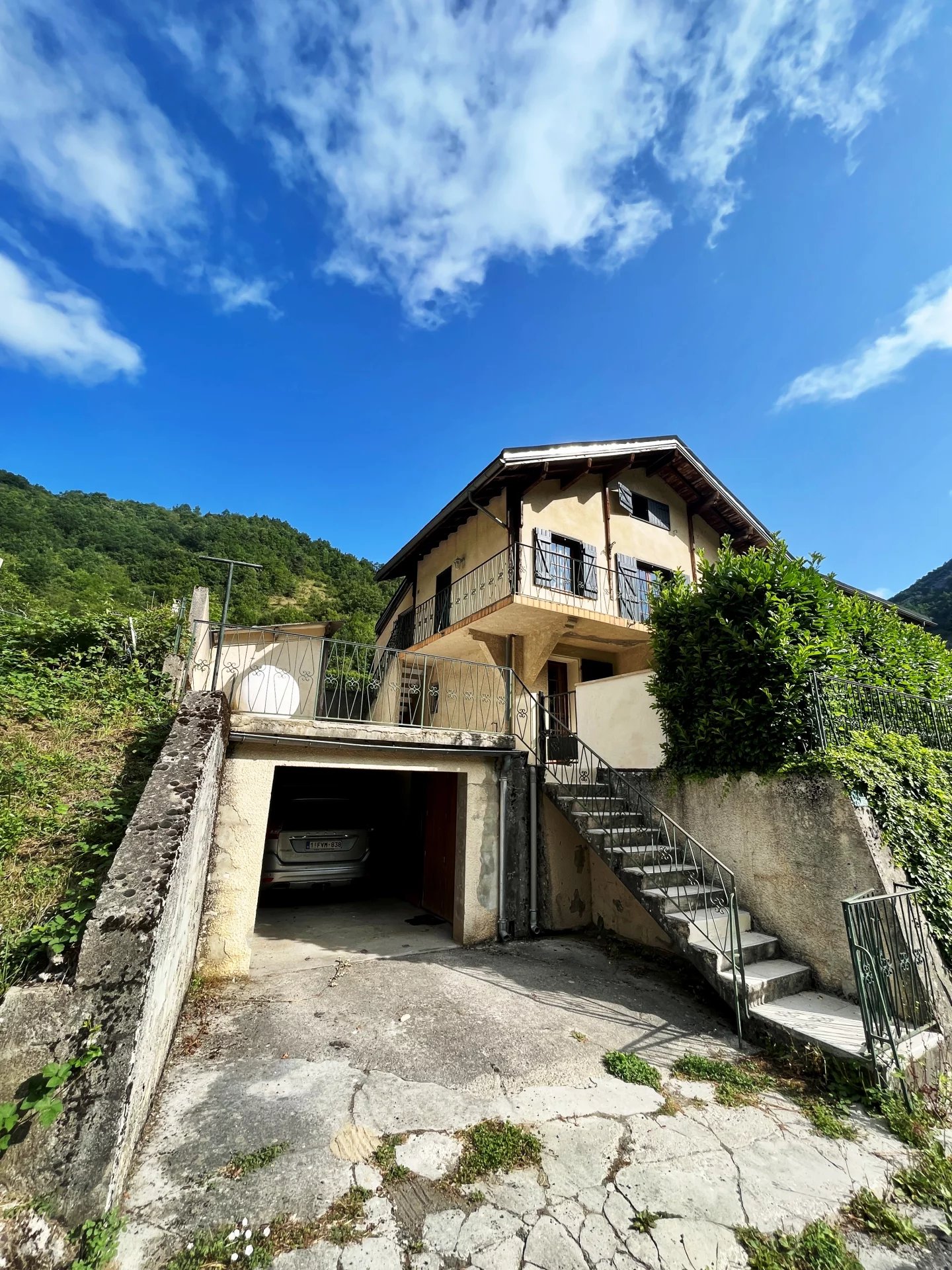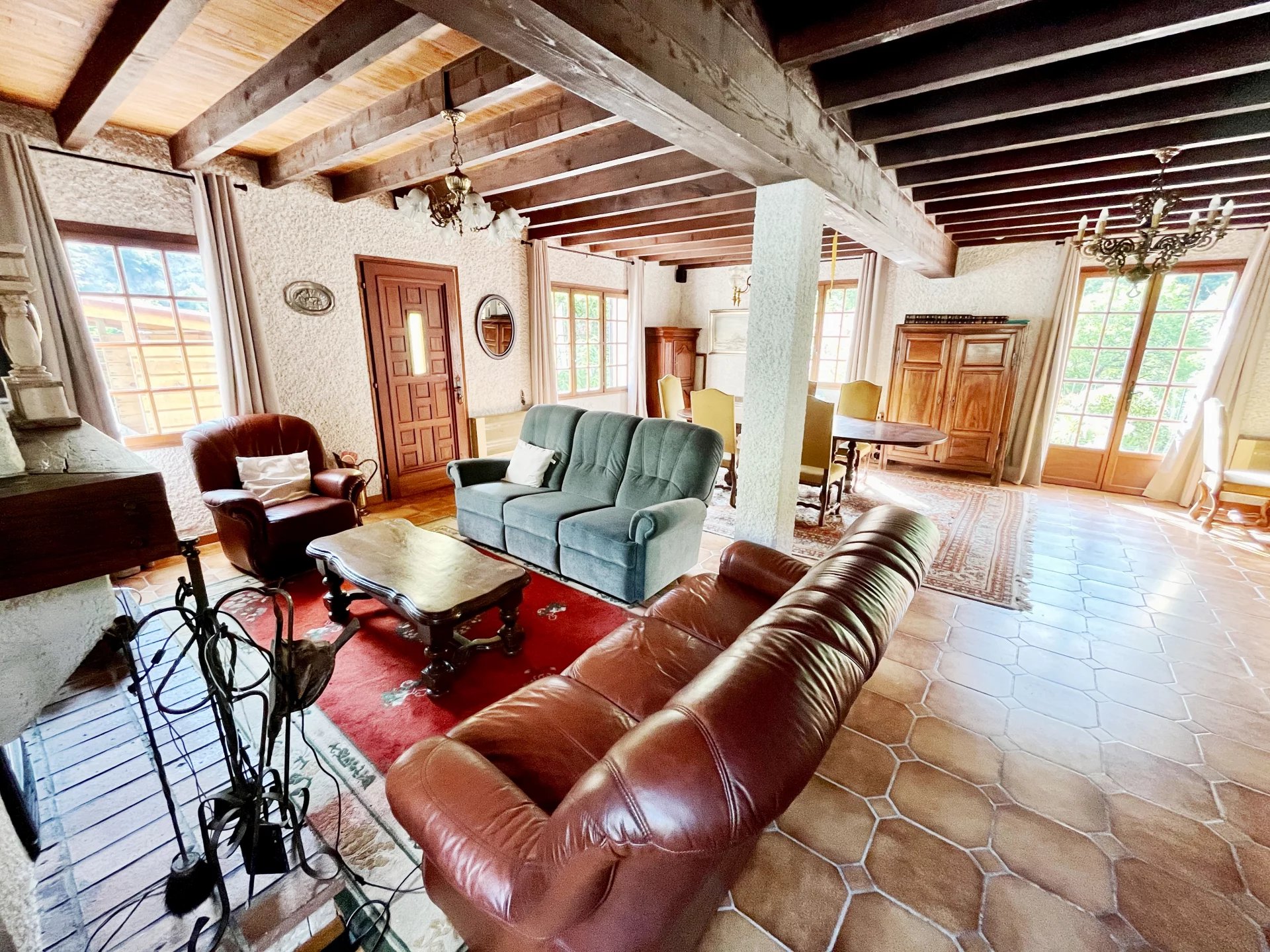 Cette propriété comprend une maison individuelle ainsi qu'un gîte rénové de 3 chambres (87m²), doté d'un balcon offrant une vue imprenable sur la rivière et les montagnes. Elle dispose également d'un grand jardin et d'un garage. La maison principale dispose d'un salon de 58m² avec cheminée et poutres apparentes. Le rez-de-chaussée se compose d'un couloir, d'une cuisine, d'une douche/WC, d'une chambre, d'une buanderie et d'une cave. Le premier étage comprend deux chambres doubles, un palier, une salle de bains/WC, un dressing, un jardin et une terrasse. La ville la plus proche, avec ses commodités, se trouve à 12 minutes en voiture. La propriété est située à 1 heure et 15 minutes de la Méditerranée et à proximité de stations de ski, de lacs et de sources thermales (30 minutes). Une vidéo est disponible sur demande.