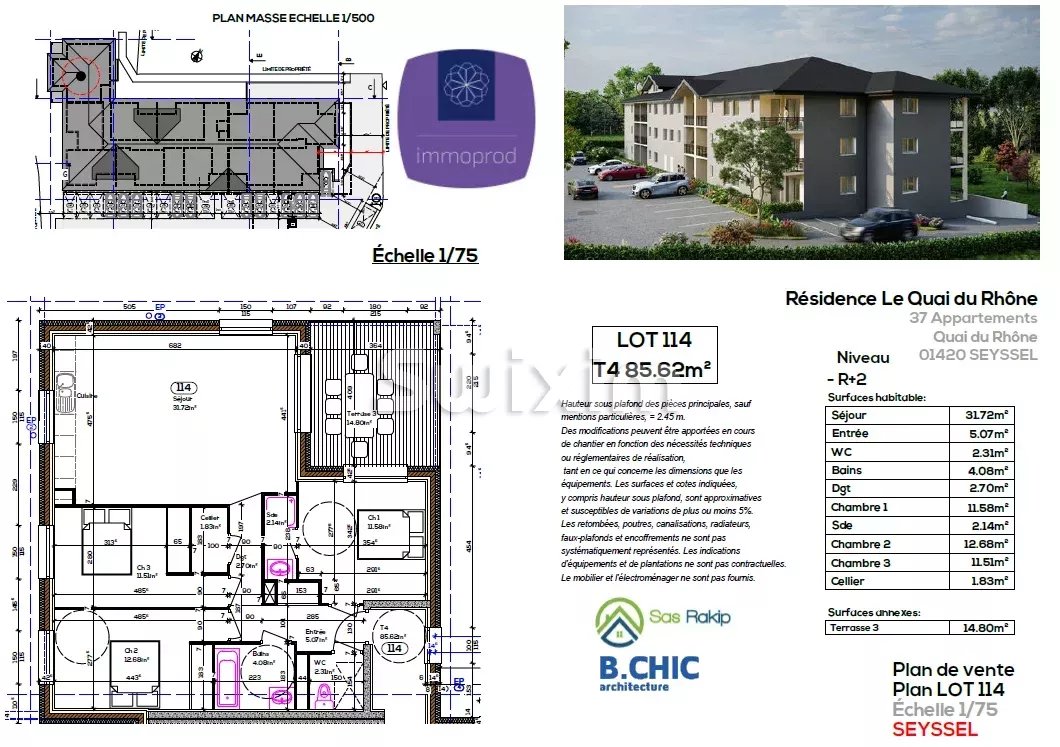 REFRS101C: T4 en dernier étage avec terrasse À Seyssel (01), à seulement 10 min de Frangy, découvrez ce T4 neuf traversant, situé en rez-de-chaussée d’une résidence de standing en bord du Rhône. Ce que vous allez aimer : • Pièce de vie XXL de plus de 31 m² • Belle terrasse • Double exposition : sud-ouest / nord-est – luminosité garantie toute la journée • Cadre de vie calme et verdoyant, à deux pas des commodités Situation idéale : • 45 min de Genève (ligne TER directe) • 45 min d’Annecy et d’Aix-les-Bains • 1h de Lyon Encore quelques T4 disponibles ! Ne ratez pas cette opportunité rare