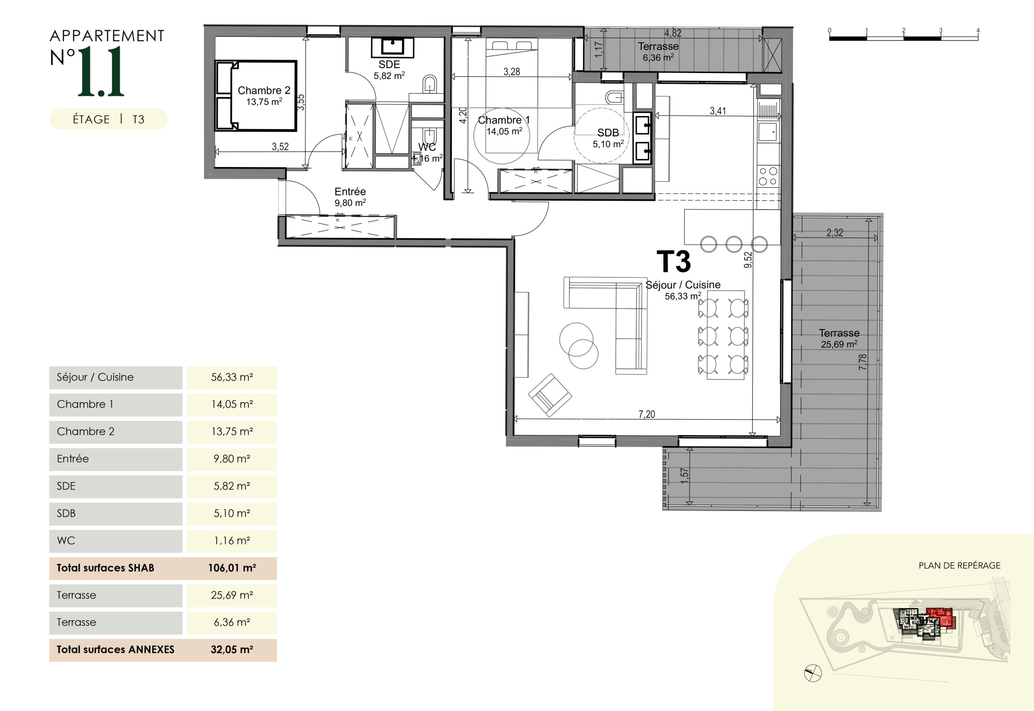 Cet appartement T3 de 106m2 situé au 1er et dernier étage, se compose d'une pièce à vivre de plus de 56m2, et de deux chambres en suite avec sa salle d'eau chacune et son toilette..