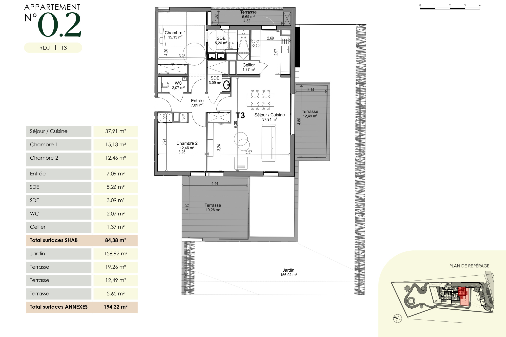 Cet appartement T3 de 84m2 situé au rez-de-jardin, se compose d'une pièce à vivre de plus de 37m2, d'une chambre en suite avec salle d'eau privative et toilette, d'une chambres, d'une salle d'eau et d'un second toilette, ainsi qu'un jardin d'une superficie de plus de 156m2.