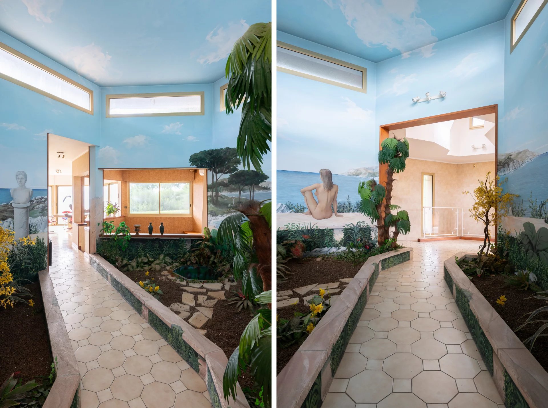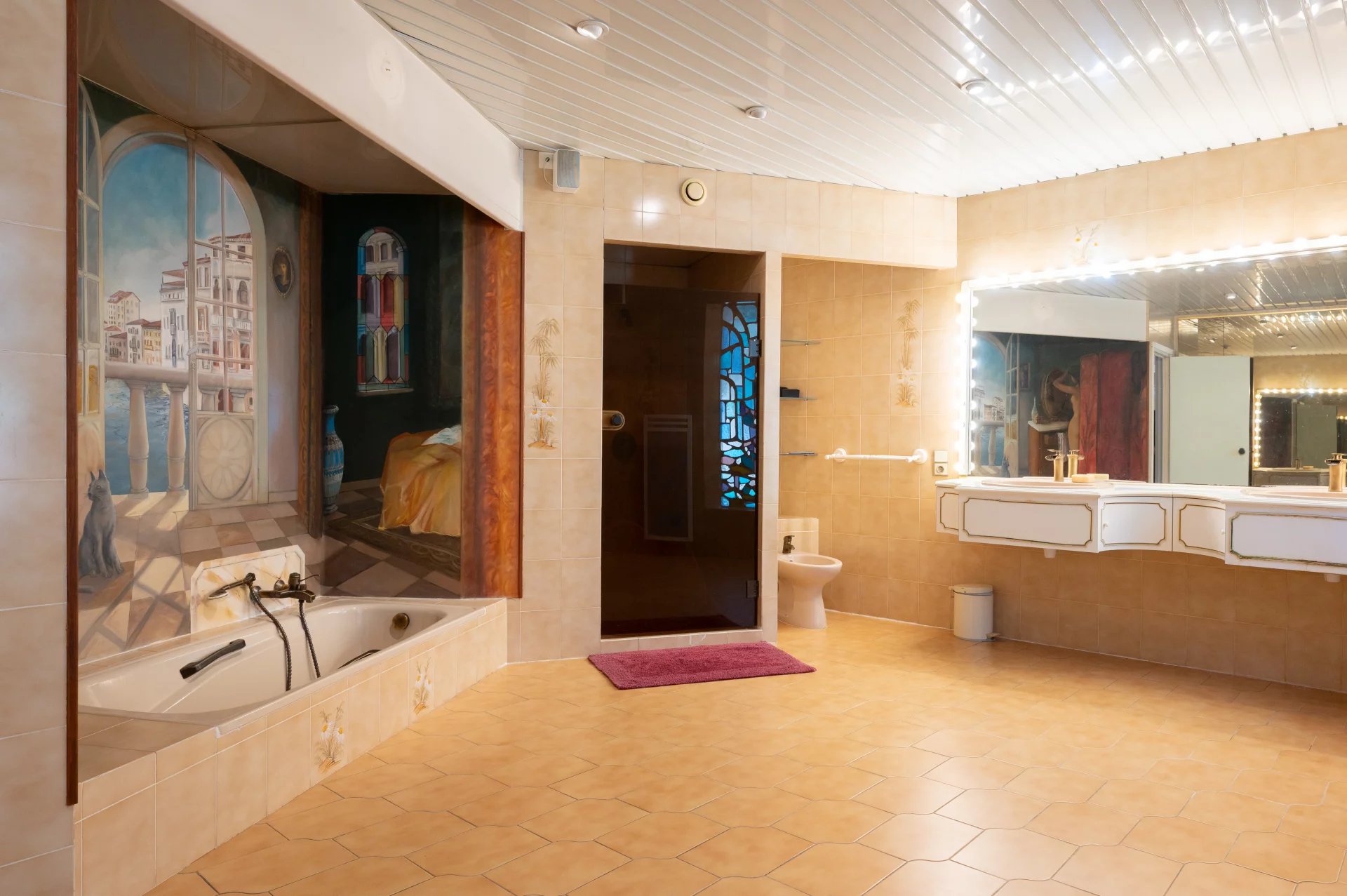 La propriété développe 286 m2 environ de surface totale. Le rez-de-chaussée de 193m2 se compose de plusieurs espaces hexagonaux, formant les différents espaces de vie et de nuits de la maison ; un hall d’entrée, une cuisine, une salle à manger, un salon avec cheminée, un patio, deux chambres avec salles d'eau, une suite de maître avec dressing et salle de bains/douche, wc invités. Un escalier dessert le sous sol qui comporte une buanderie, un grand garage pour deux à trois véhicules et divers espaces de stockage.